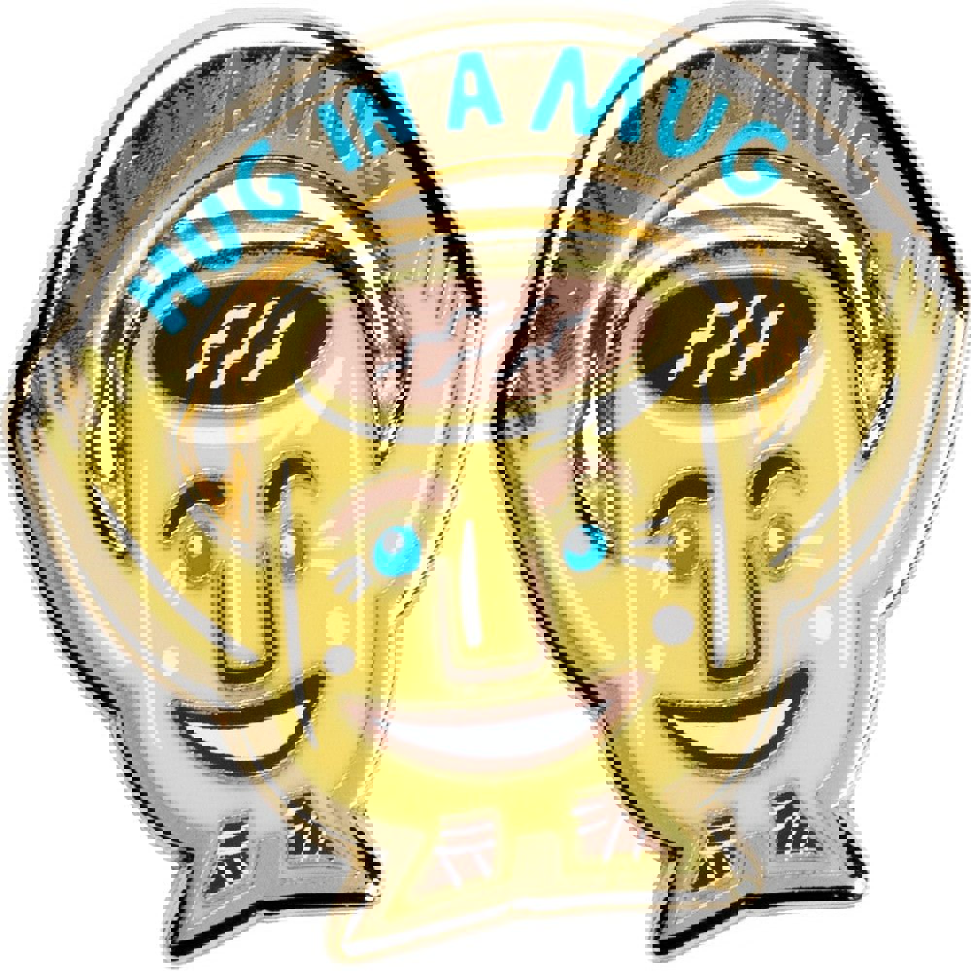 A "Hug In A Mug" high-quality hard enamel pin featuring a personified coffee mug design with a butterfly clip closure. Comes packaged on a thoughtfully-coordinated card with an intentional blank back to personalize with a handwritten note for gifting.