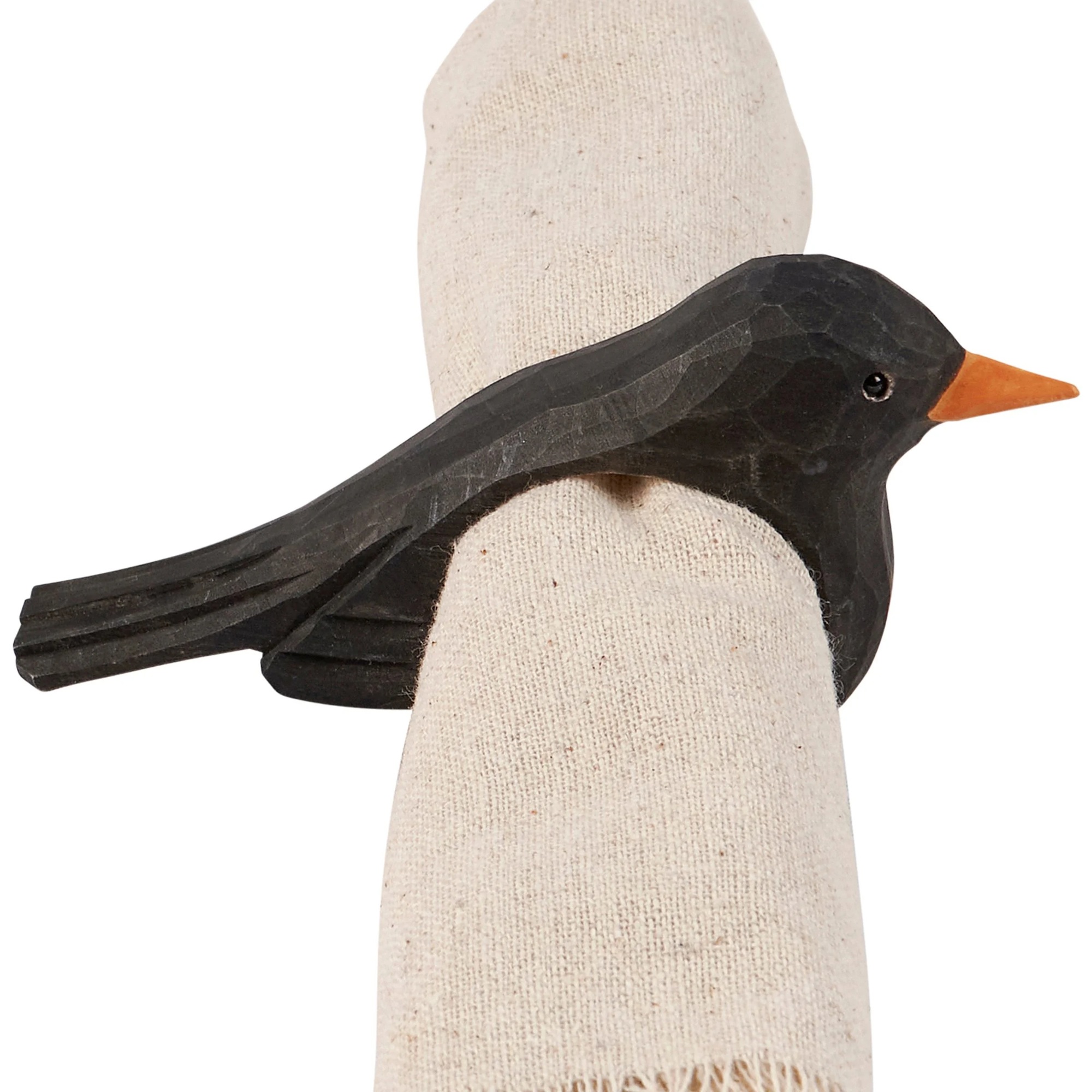 A wooden napkin ring featuring natural wood with sculpted crow design and painted details.