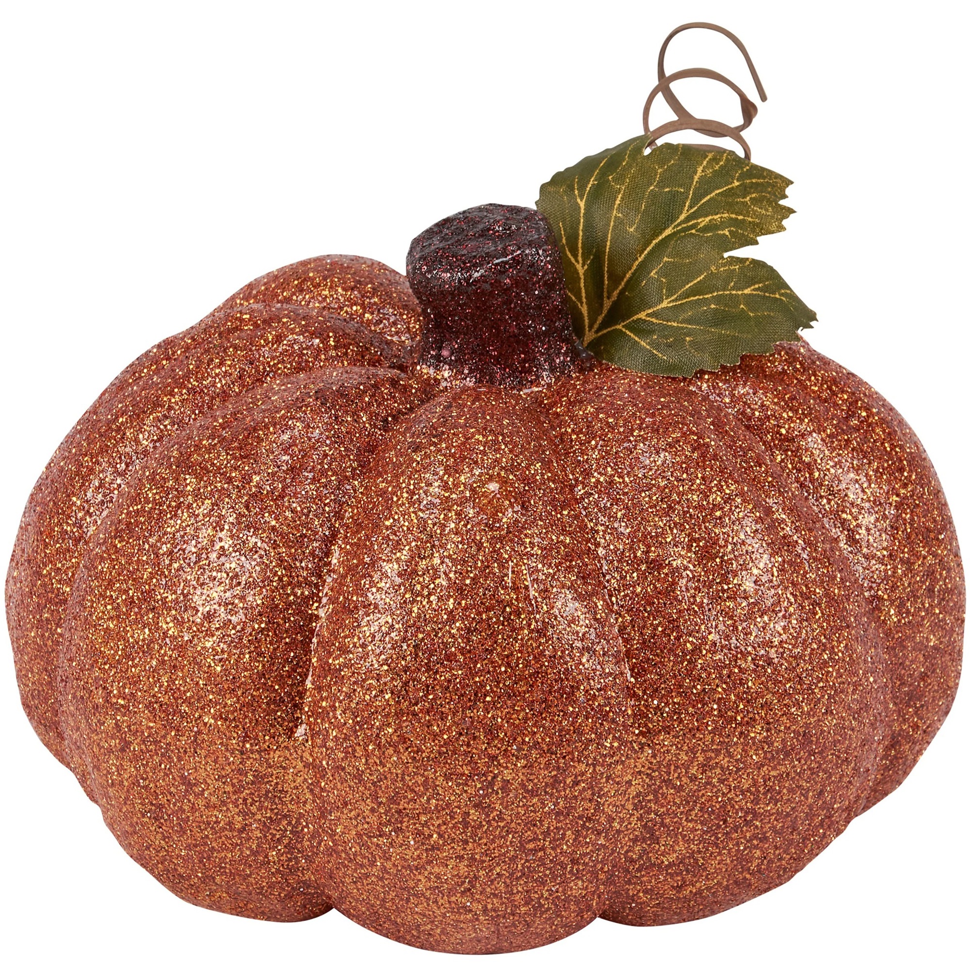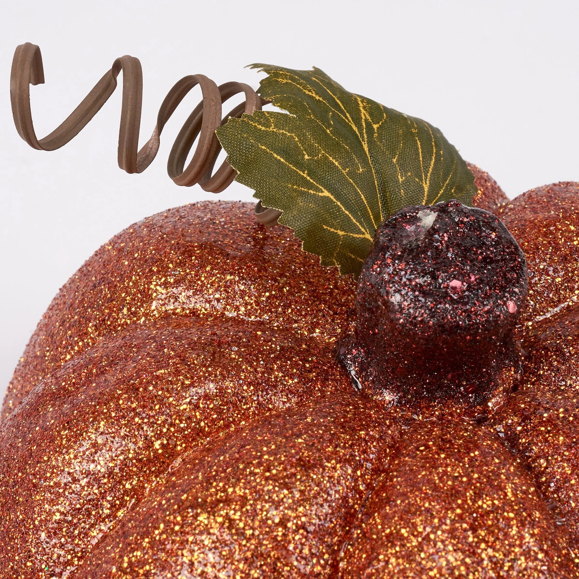 A decorative pumpkin featuring a dark orange glitter finish and brown glitter stem with faux greenery accent for added interest.