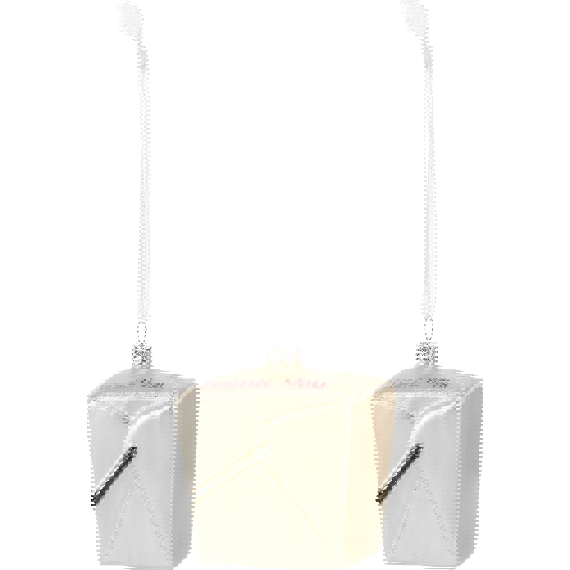Add a touch of whimsy to your Christmas tree with the Enjoy Takeout Glass Ornament. This 2.50" x 3" x 2.25" ornament features glitter accents and a convenient top loop for easy hanging, making it a unique and festive gift for foodies and ornament collectors alike.