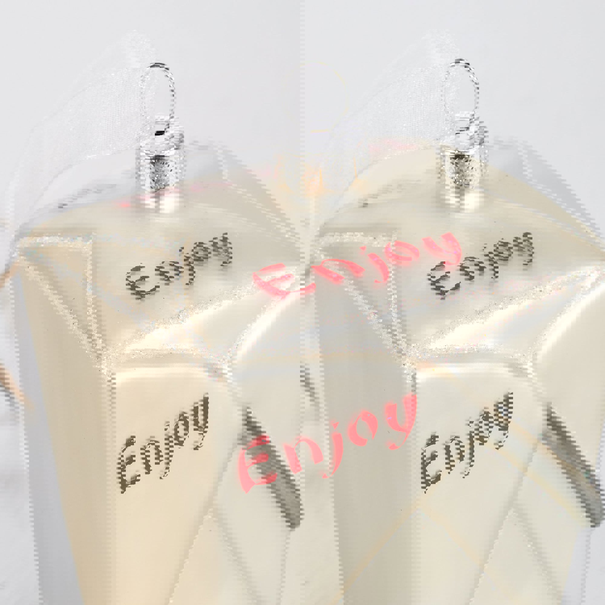 A glass takeout container ornament with "Enjoy" sentiments and glitter accents. Ready to hang via the included top loop. A fun seasonal home accent perfect for a Christmas tree or for gifting.
