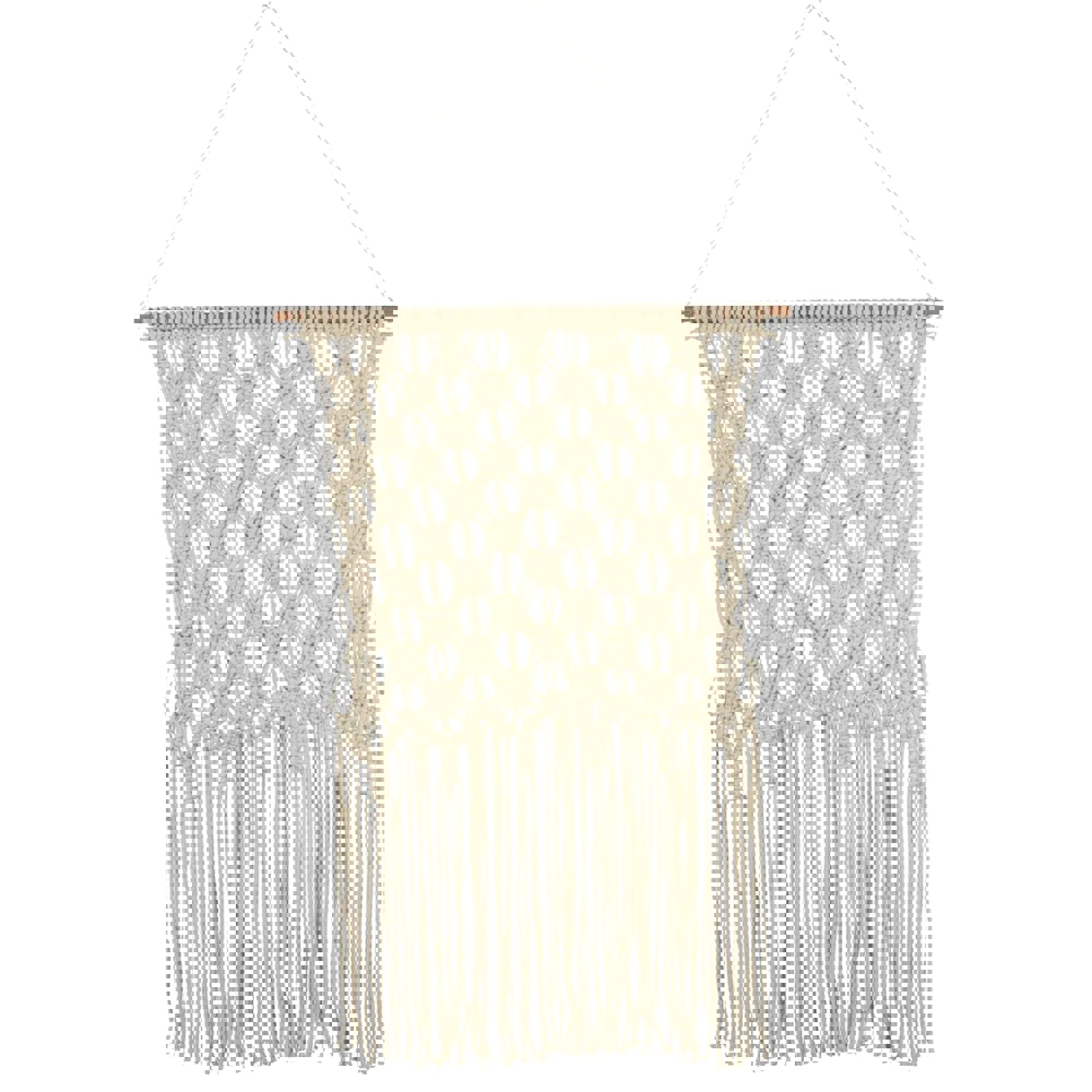 This bohemian hand-knotted macrame wall hanging, measuring 24" x 35", features a stunning ivory color and long fringe for a unique and eye-catching addition to any space. Handmade in India with cotton and metal materials, it adds a touch of '70s flair and pairs perfectly with plants and natural light, making it an ideal statement piece for a cozy and stylish home.