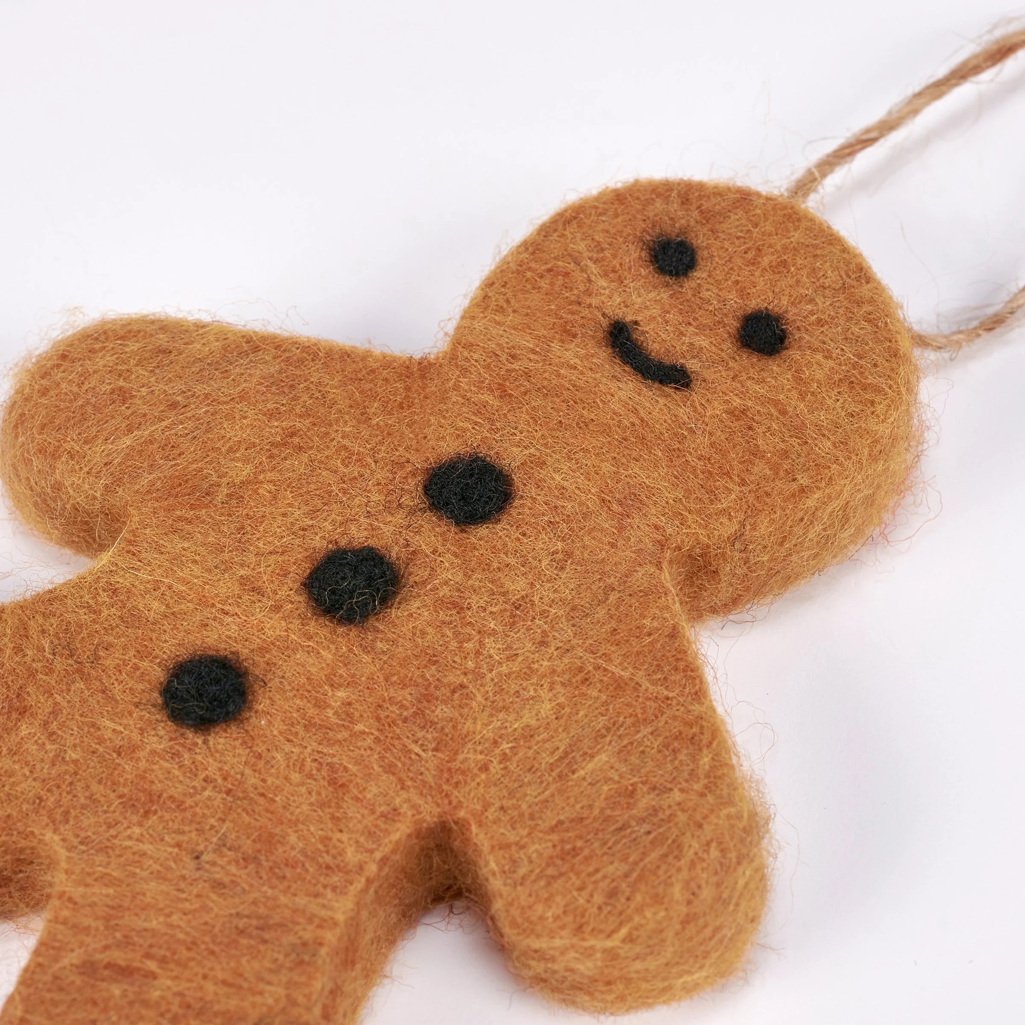 A decorative ornament displaying a felt gingerbread man with simple details.