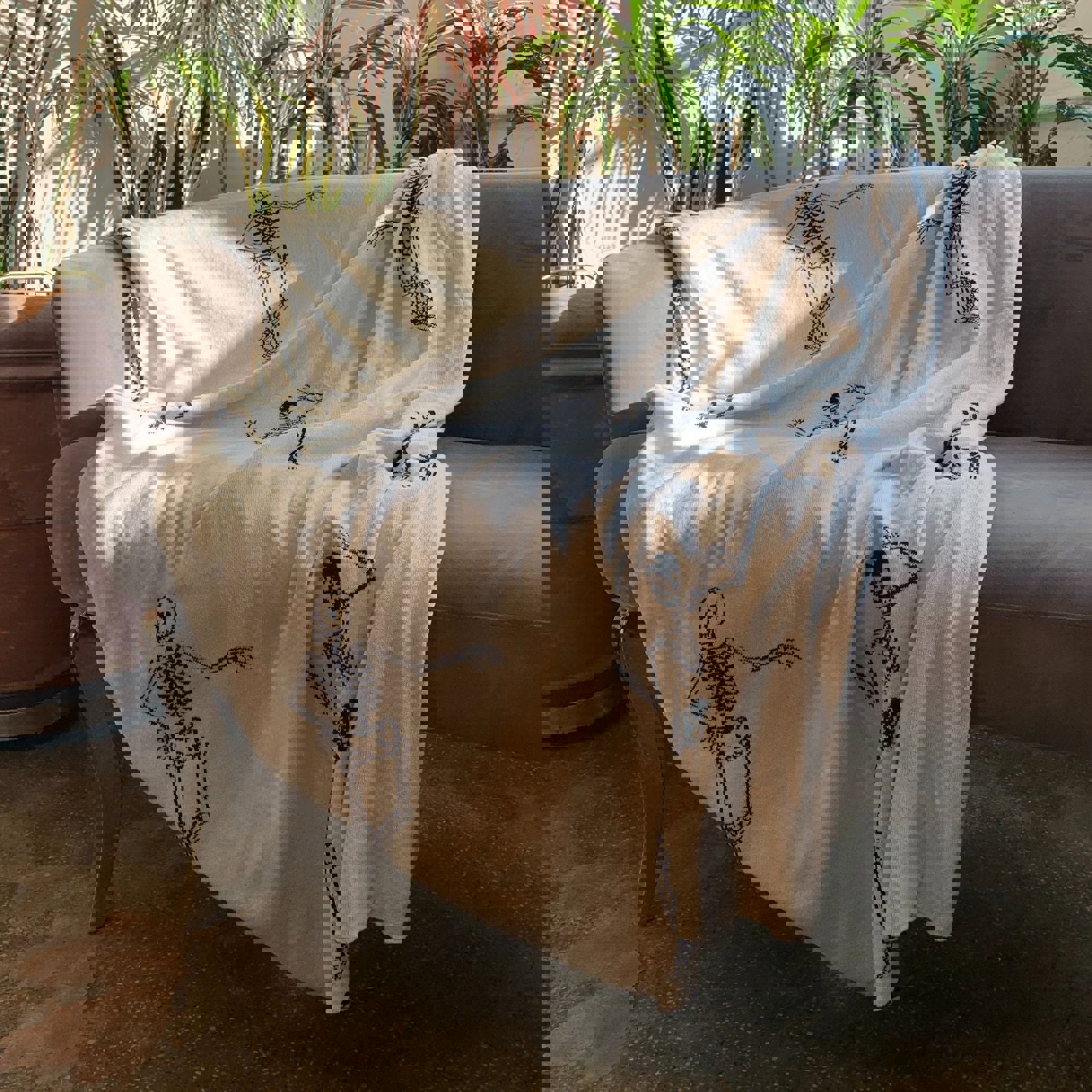 A machine-knitted black cotton throw featuring skeleton designs in lively – and dare we say playful – poses. Who says being undead is no fun?
