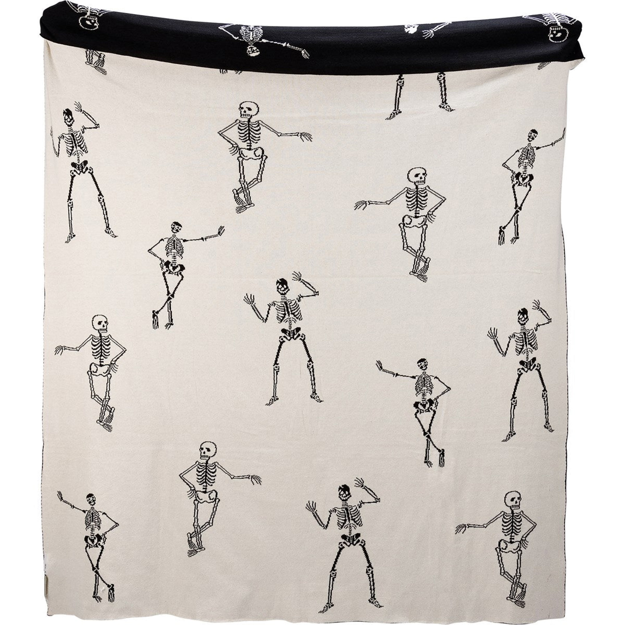 Reversible blanket features black skeletons on white and white skeletons on black.