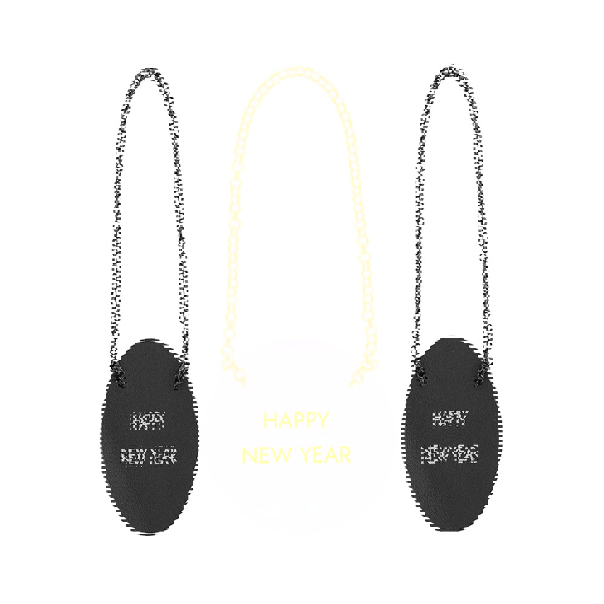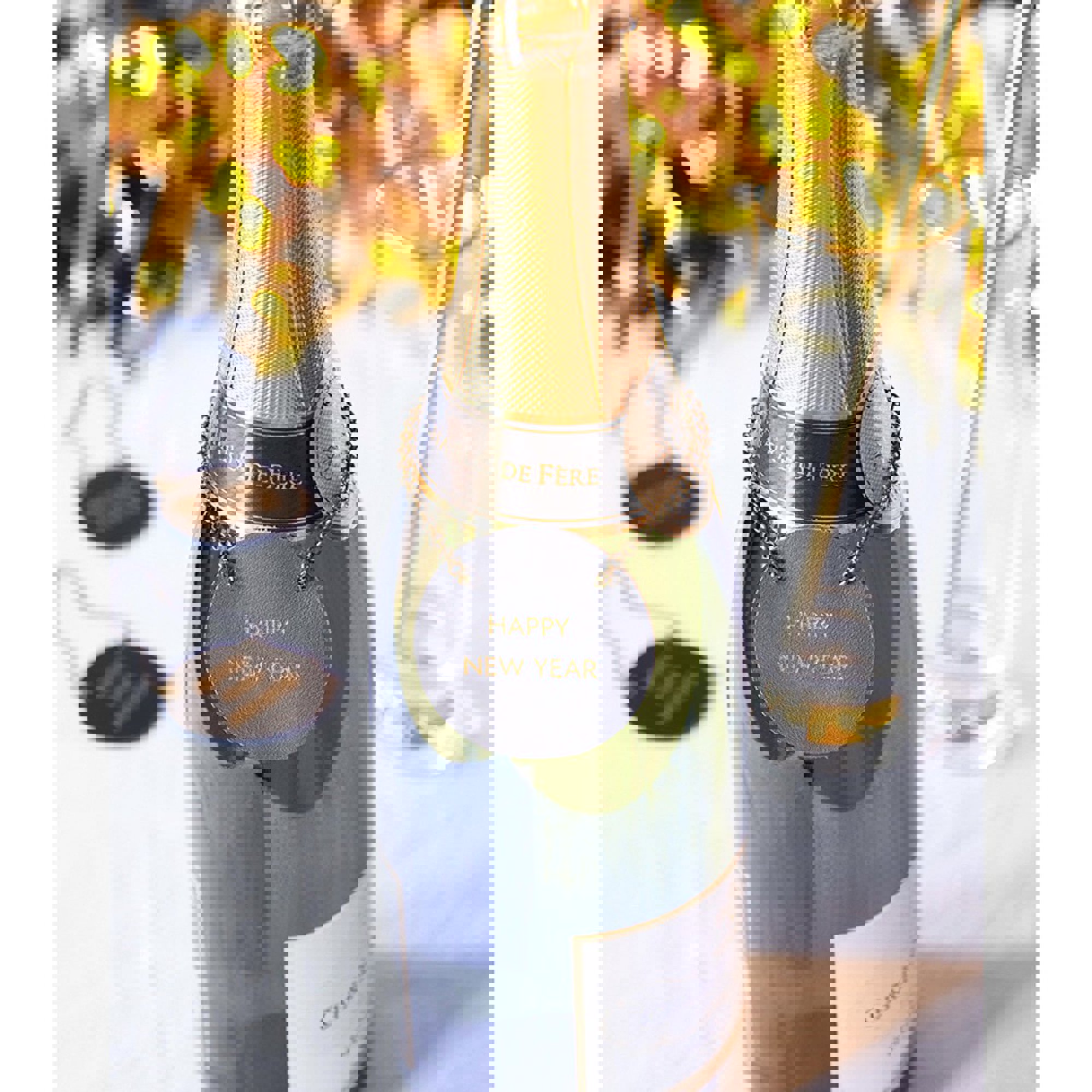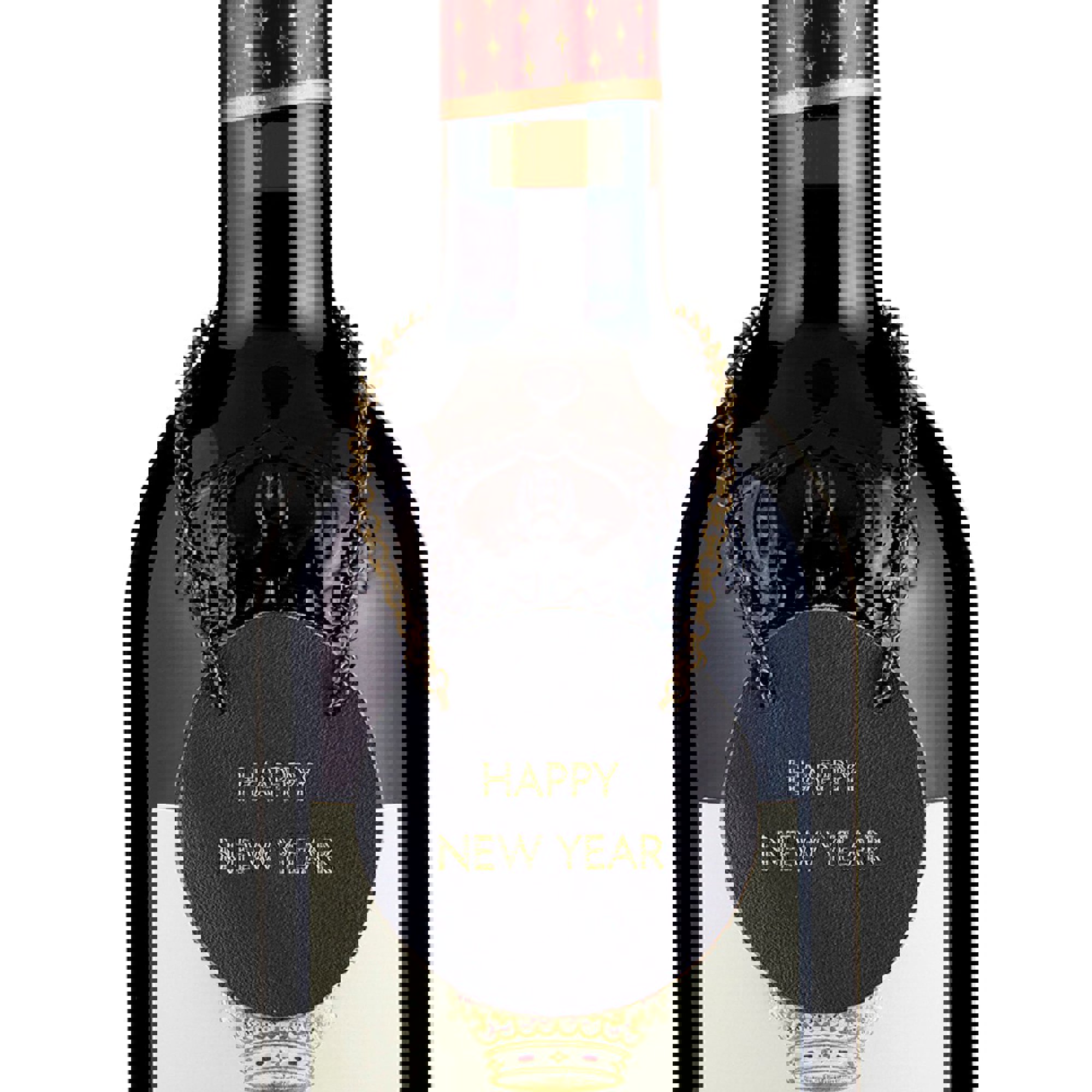 "Happy New Year" is written in gold text and a metal chain hanger is simply looped over the bottle neck