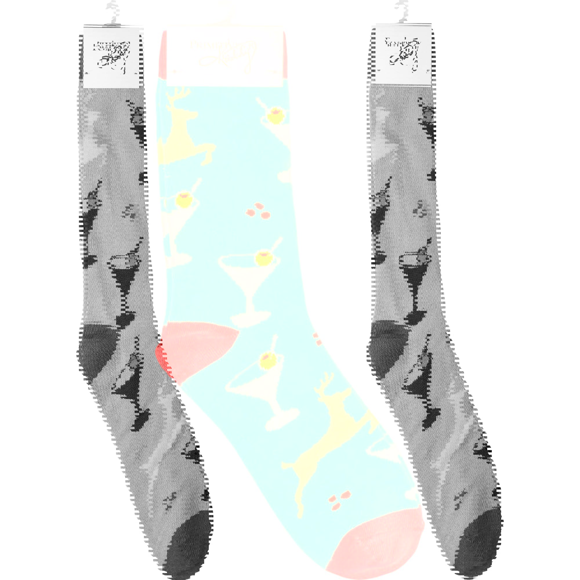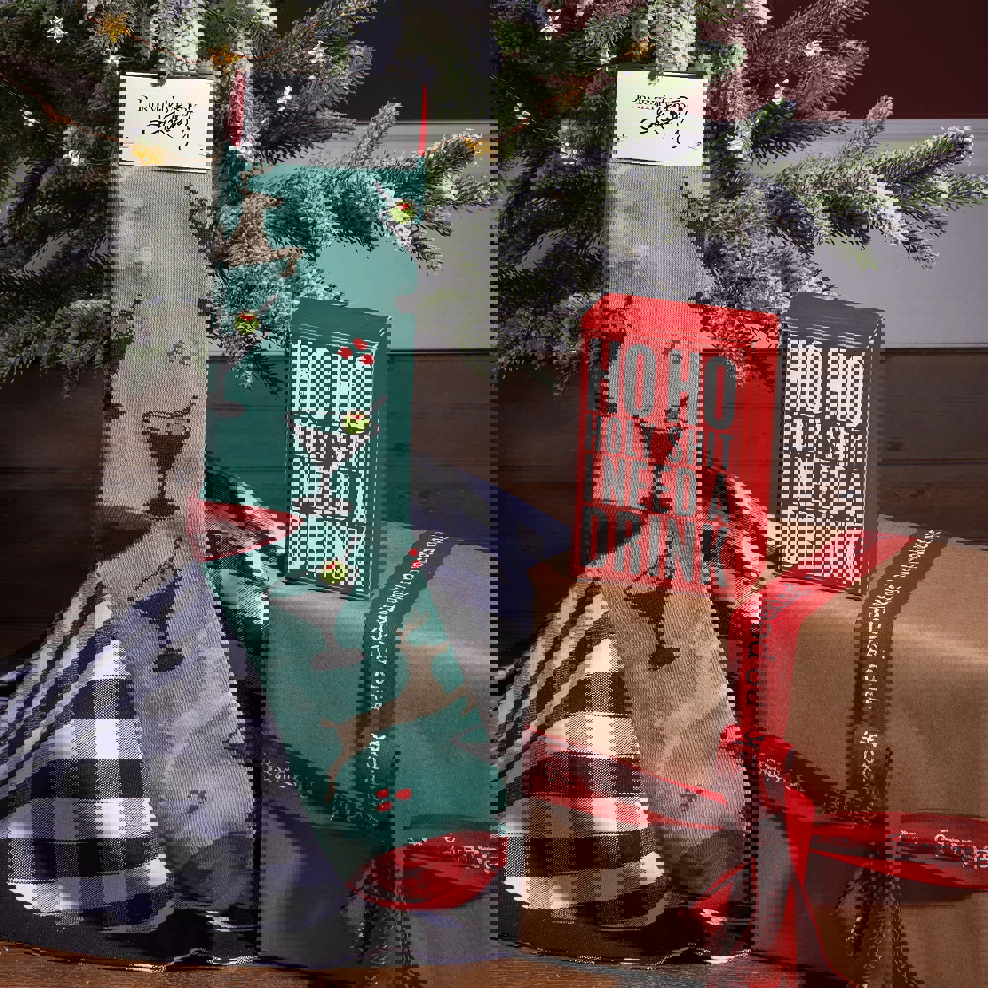 A perfectly giftable set including a box sign with "Ho Ho Holy Shit I Need A Drink" sentiment and a pair of socks featuring coordinating designs. Socks are cotton, nylon, and spandex and are machine-washable. One size fits most. Box sign is easy to hang or can free-stand alone. Socks come neatly rolled inside box sign and secured with tied cotton tape ribbon.