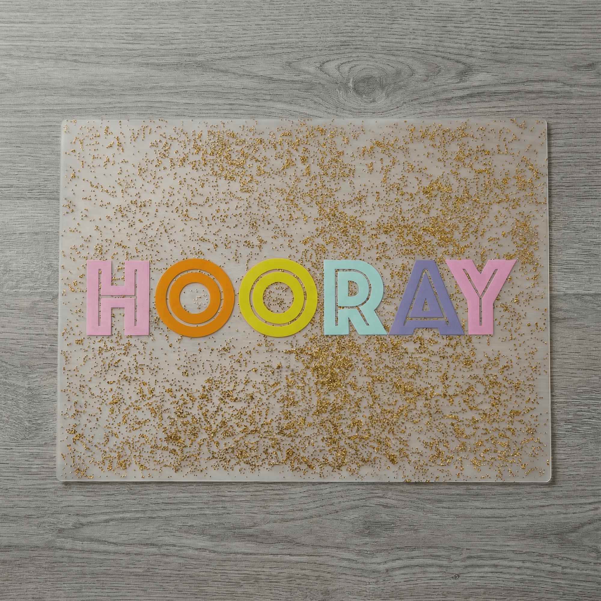 FUN GLITTER DESIGN; reads "Hooray" in fun, multicolored text