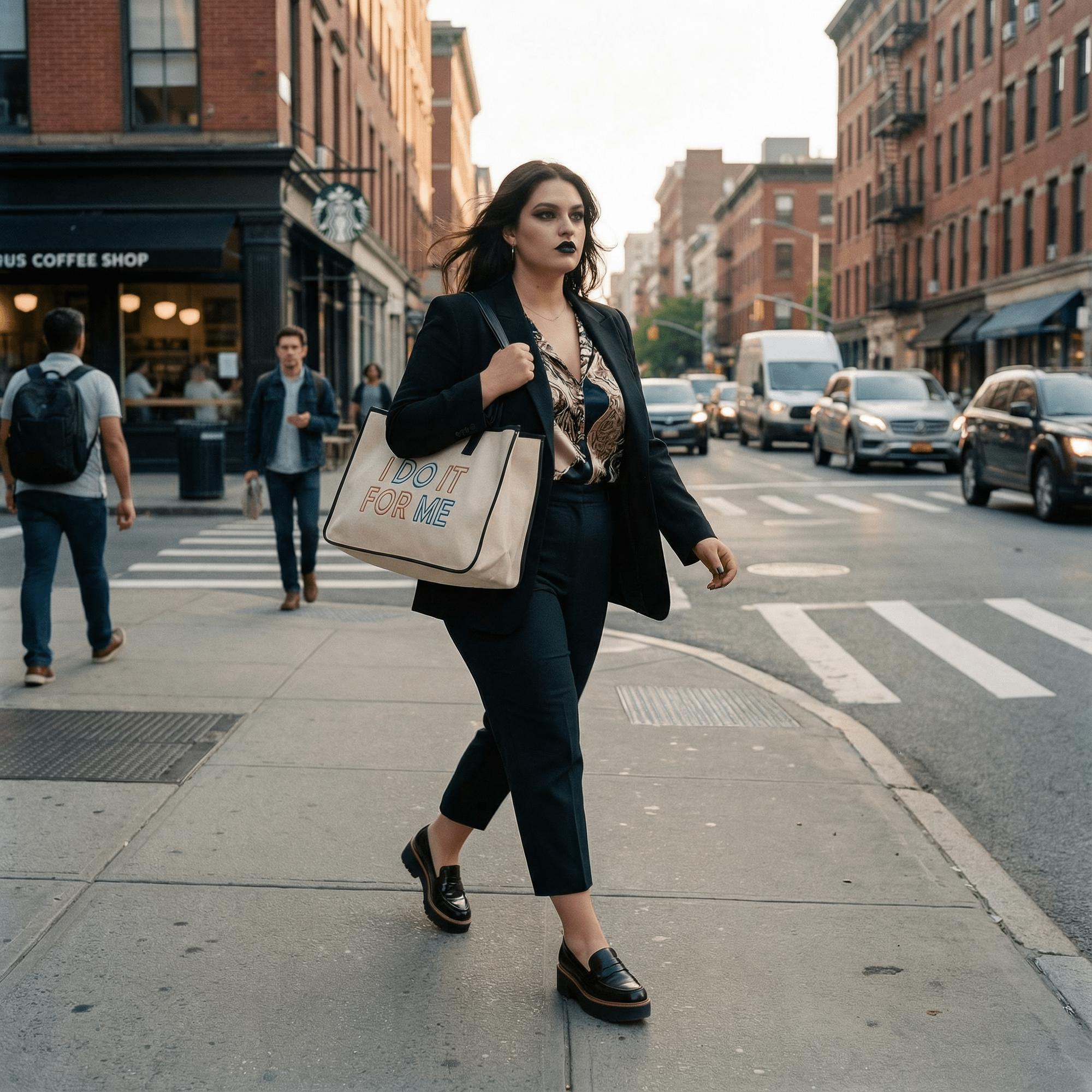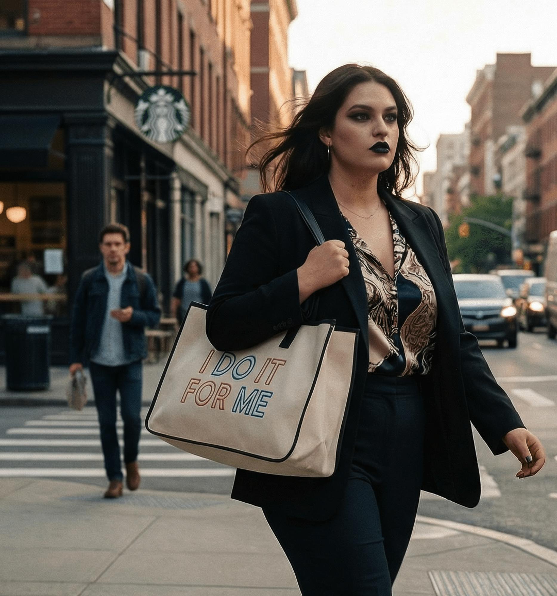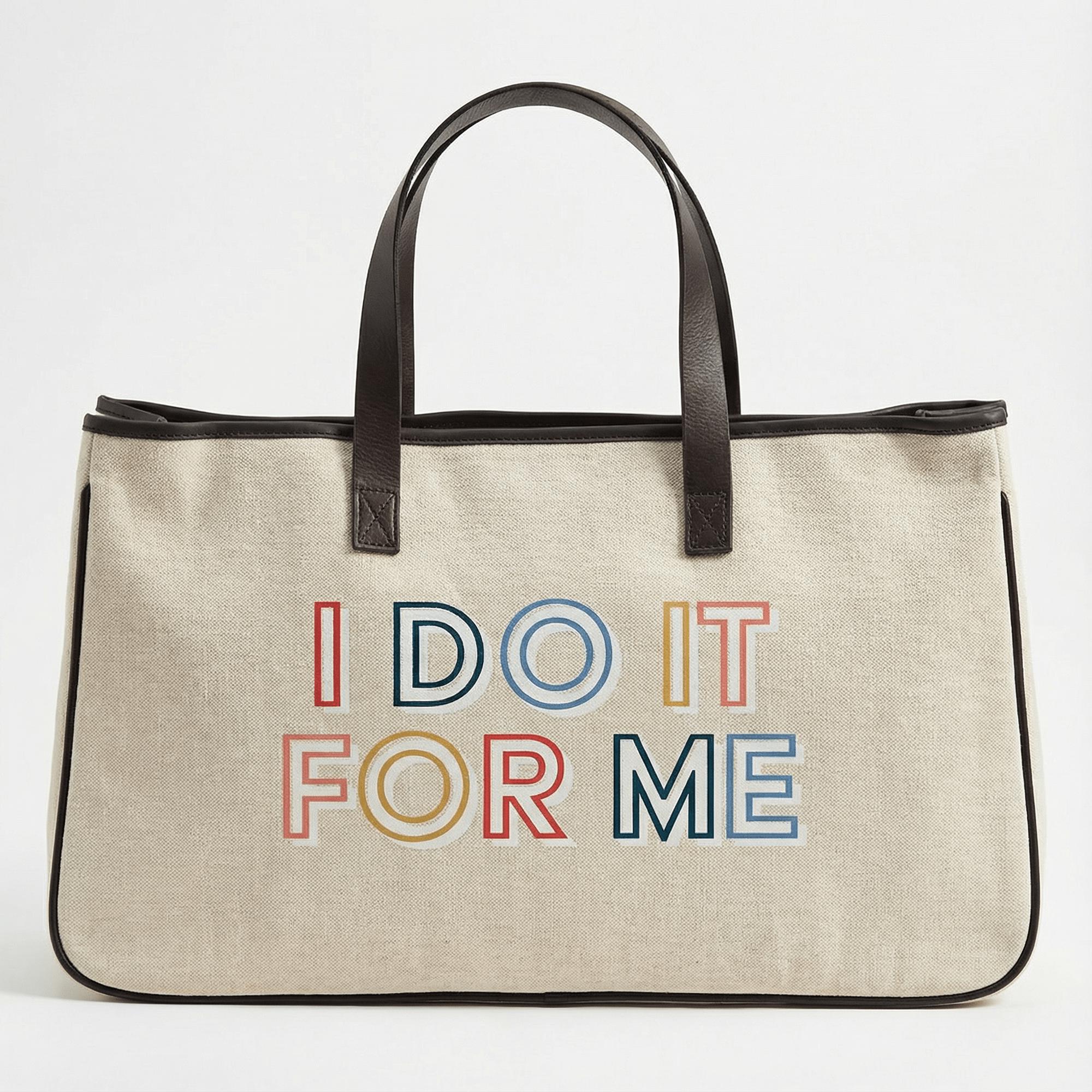 "I DO IT FOR ME" in bright, multicolored lettering; black edging and handles add contrast