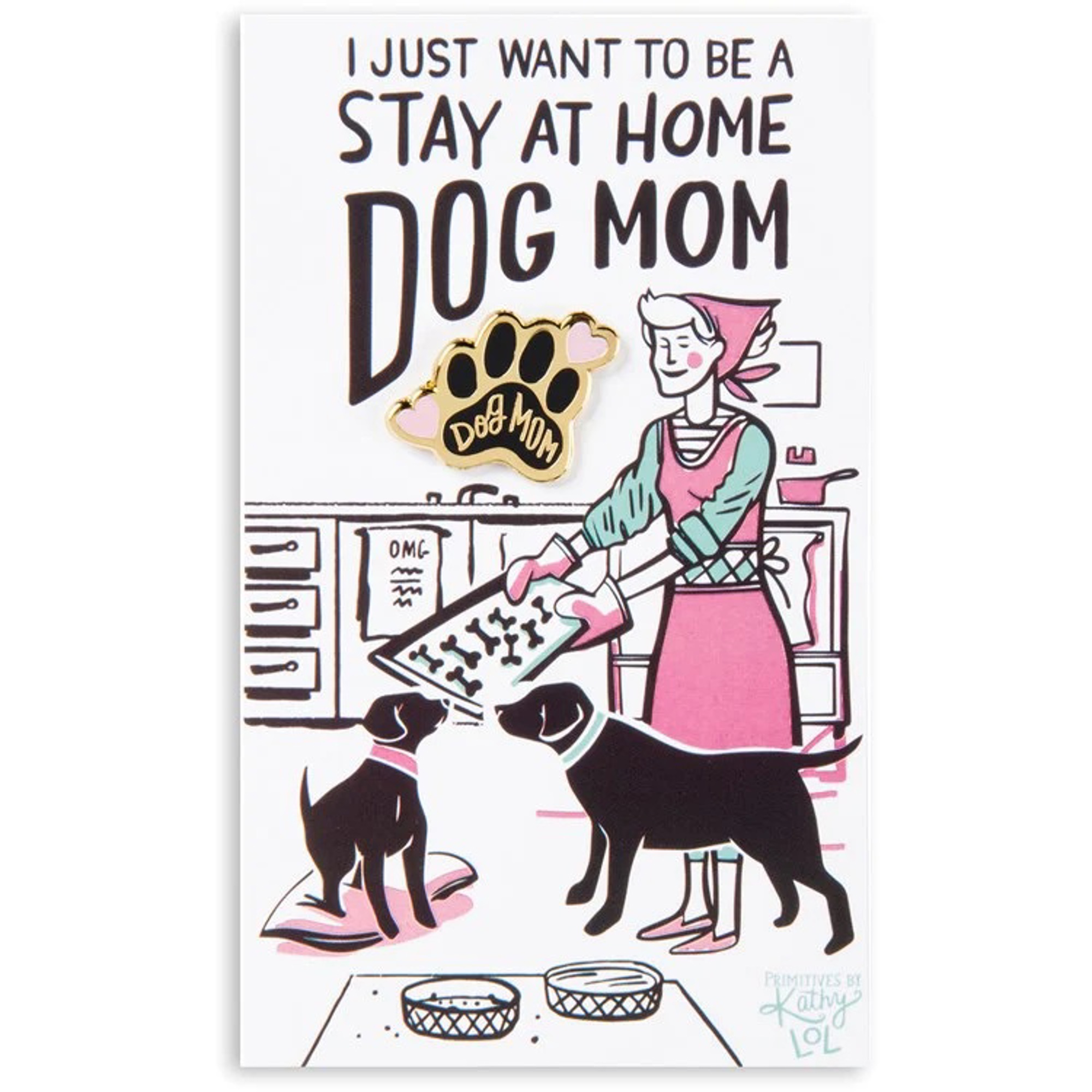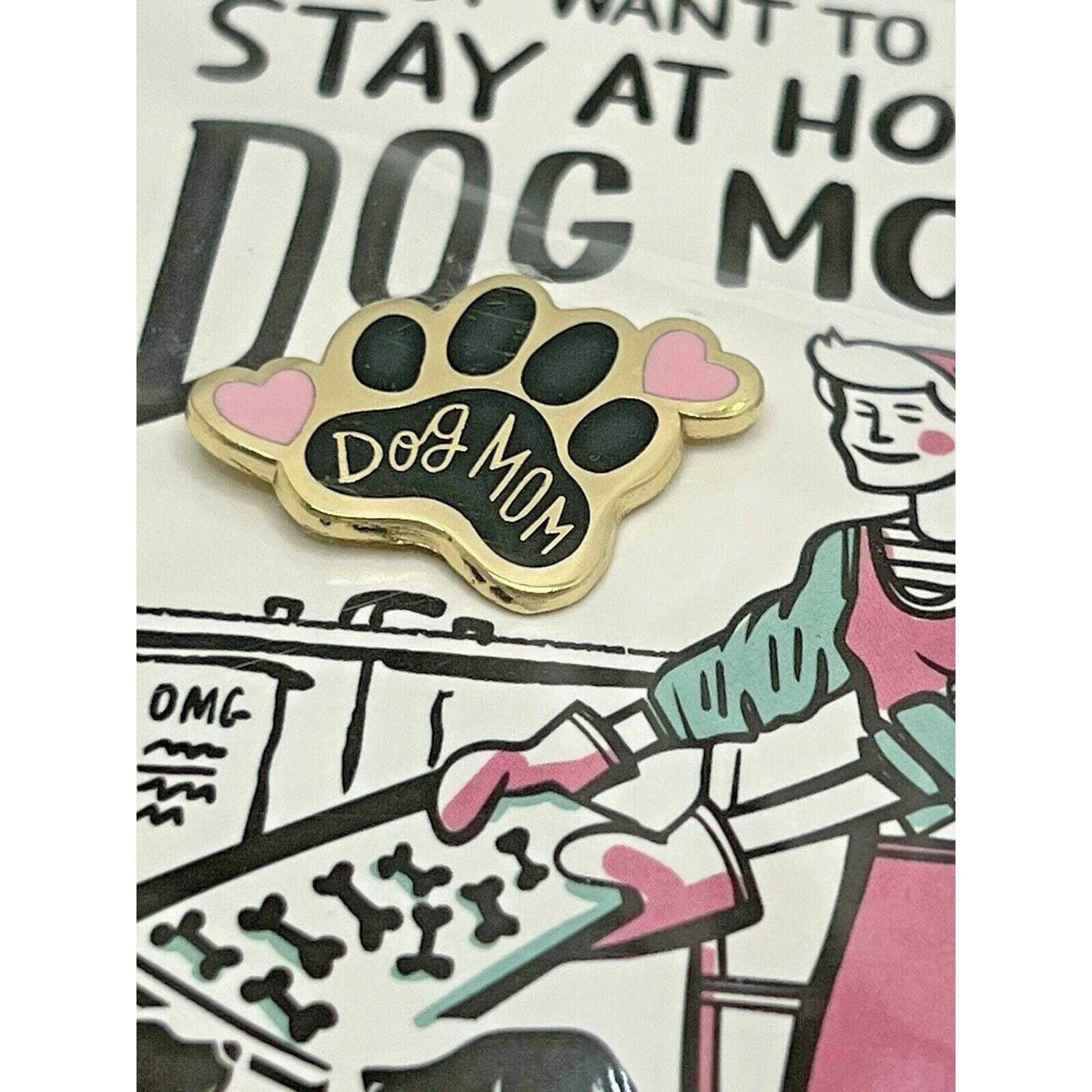 A high-quality hard enamel "Dog Mom" pin lending a paw print and heart design with a butterfly clip closure. Comes packaged on a double-sided, thoughtfully-coordinated card with "I Just Want To Be A Stay At Home Dog Mom" sentiment and an intentional blank reverse side for a handwritten note.