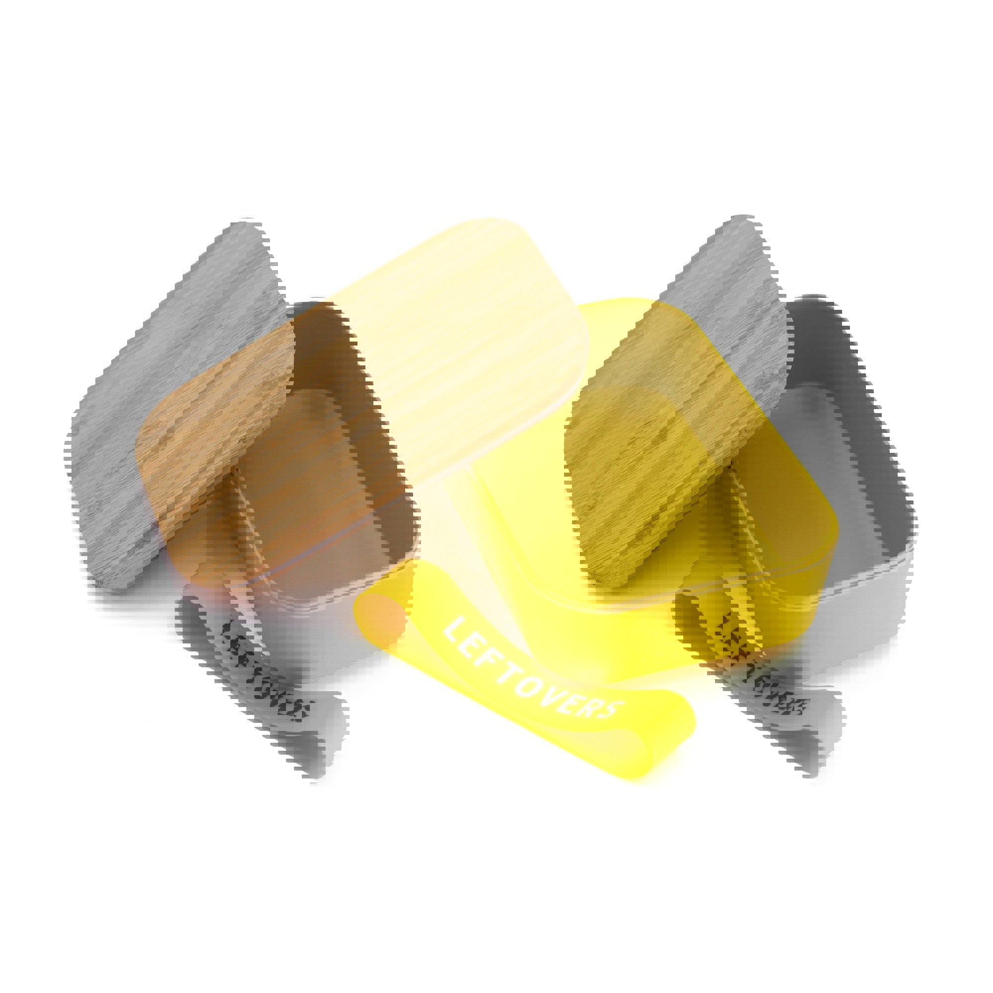 Upgrade your lunch game with this eco-friendly bamboo lunch box set in vivid yellow! Made from sustainable bamboo fiber, these plastic-free containers are perfect for taking your meals on-the-go, whether it's to school, work, or on a picnic. They also make a thoughtful gift for anyone looking to reduce their plastic waste and live a more sustainable lifestyle. Ditch boring single-use plastic bags and make your eye reach for leftovers with this eco friendly lunch box! With a large single compartment, this is the perfect size for lunches and snacks! Eco-friendly Set of 3 identical lunch boxes, individually boxed Plastic-free! Measures 7.5-inches long x 5-inches wide x 2-inches high Inside measurements for the actual container space are 7" x 4.75" x 1.75" Sustainable materials: Made of bamboo fiber with a bamboo wood lid; silicone sleeve with text that reads "LEFTOVERS" This portable container is ideal to take with you anywhere - school, work, picnics, camping, or travel Care instructions: Hand wash and thoroughly dry Did you know that bamboo is one of the world's fastest growing plants? Bamboo absorbs more carbon and produces more oxygen than other trees, making bamboo fiber as a sustainable alternative to plastic or wood. Bamboo is also free of BPA and other harmful ingredients, making it a sustainable and healthful choice you can feel good about. More styles: Foodie (Blue-Gray), Take Out (Pink) – buy more than one to stack in your fridge or carry larger meals! By Santa Barbara Design Studio