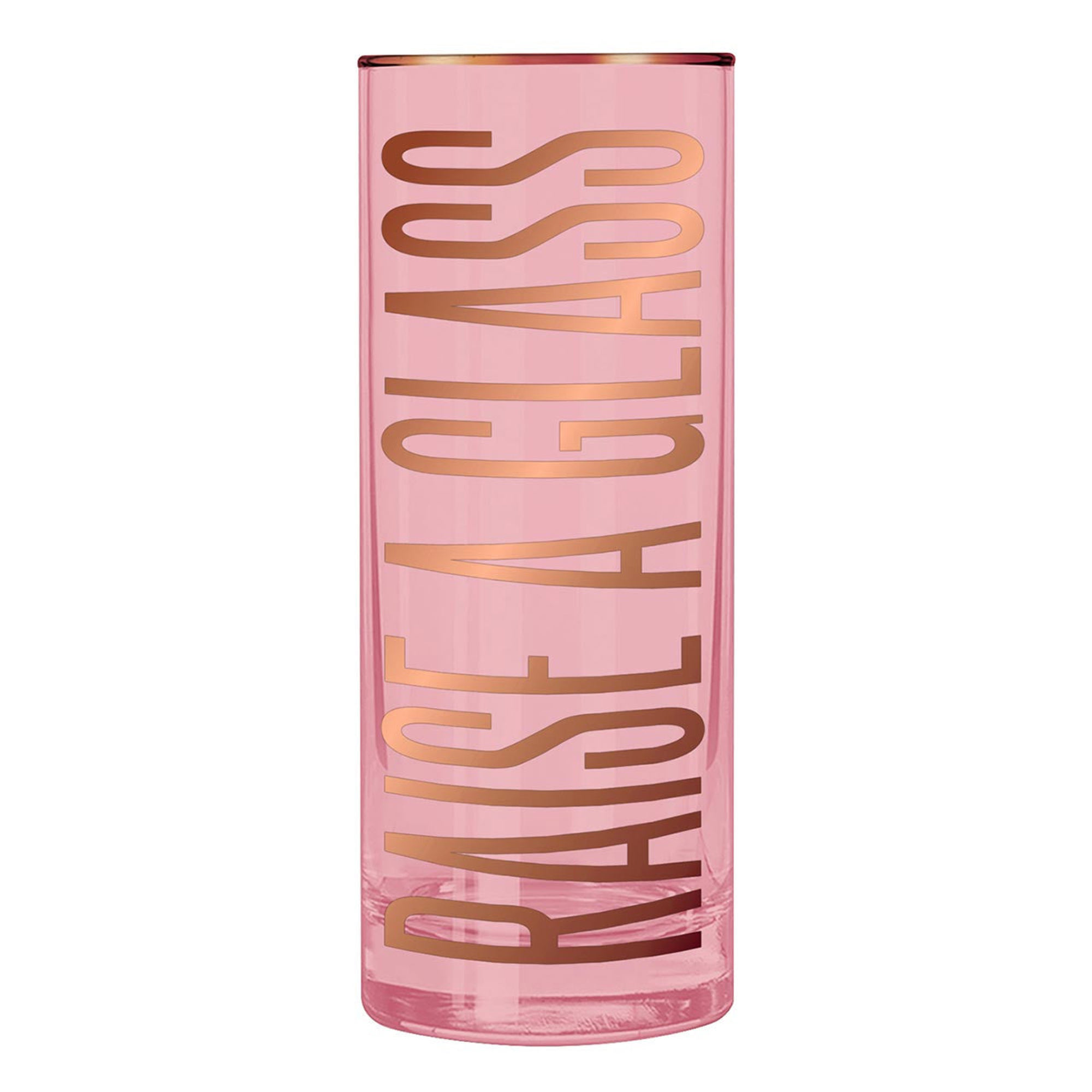 Impress your guests with a delicious cocktail served in the Raise A Glass Collins Cocktail Glass in Pink. The 17 oz. glass features gold lettering and a gold edged rim, making it a stylish addition to any bar cart. Hand wash only, this glass is the perfect gift for the cocktail enthusiast in your life.