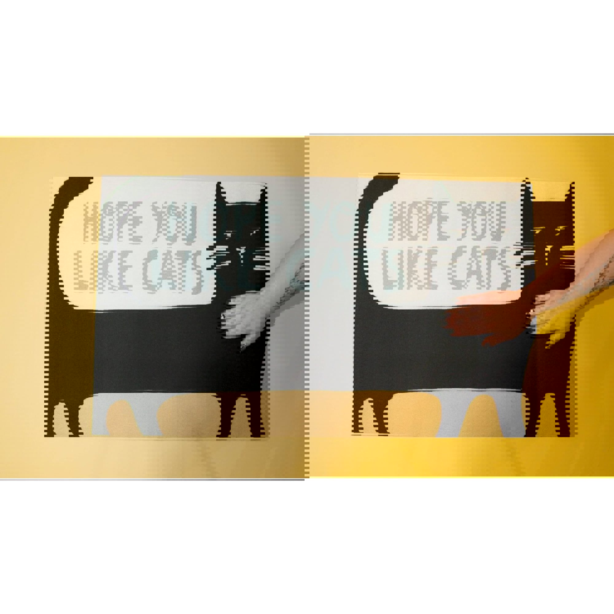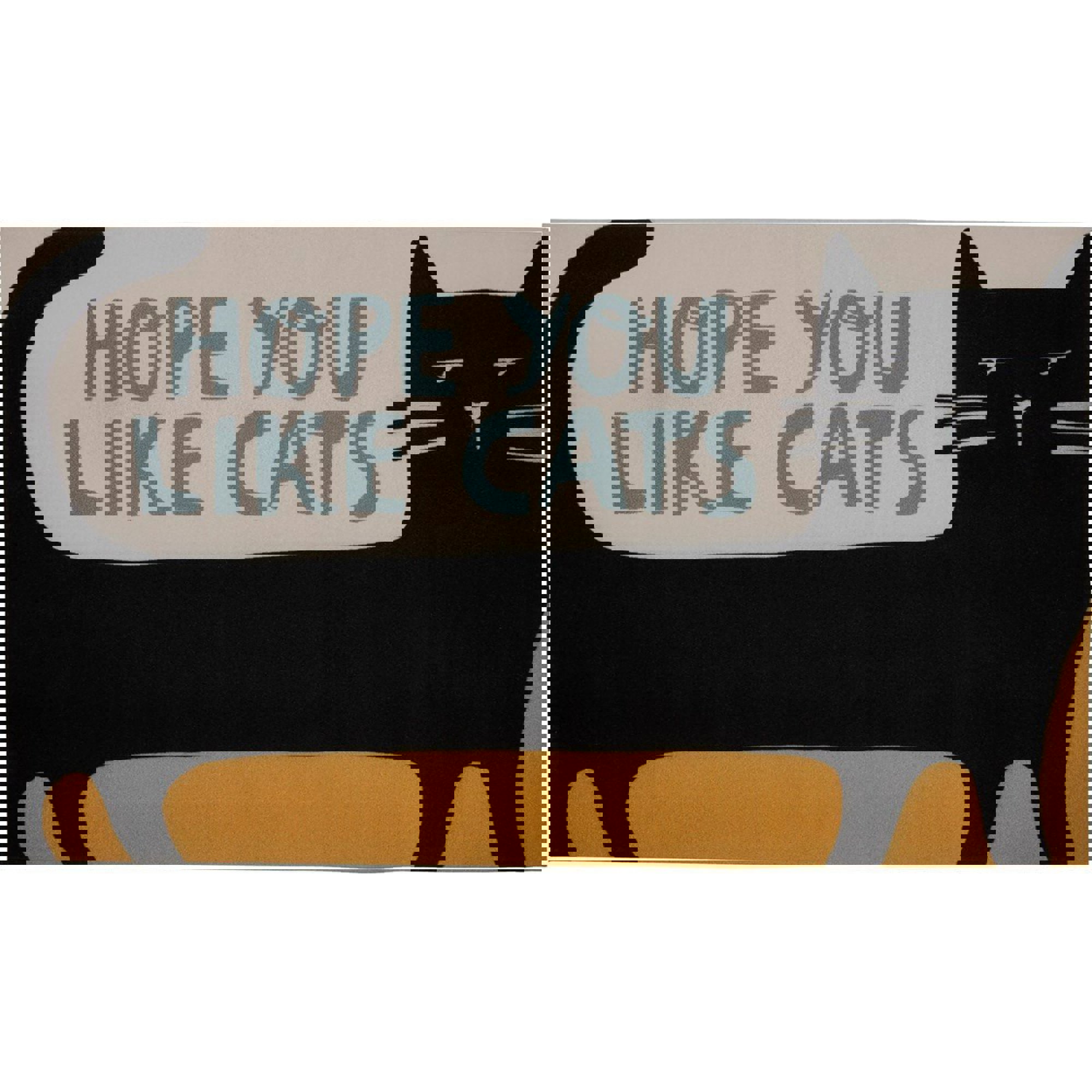 This funny and adorable indoor/outdoor rug features a block print cat design and "Hope You Like Cats" sentiment.
