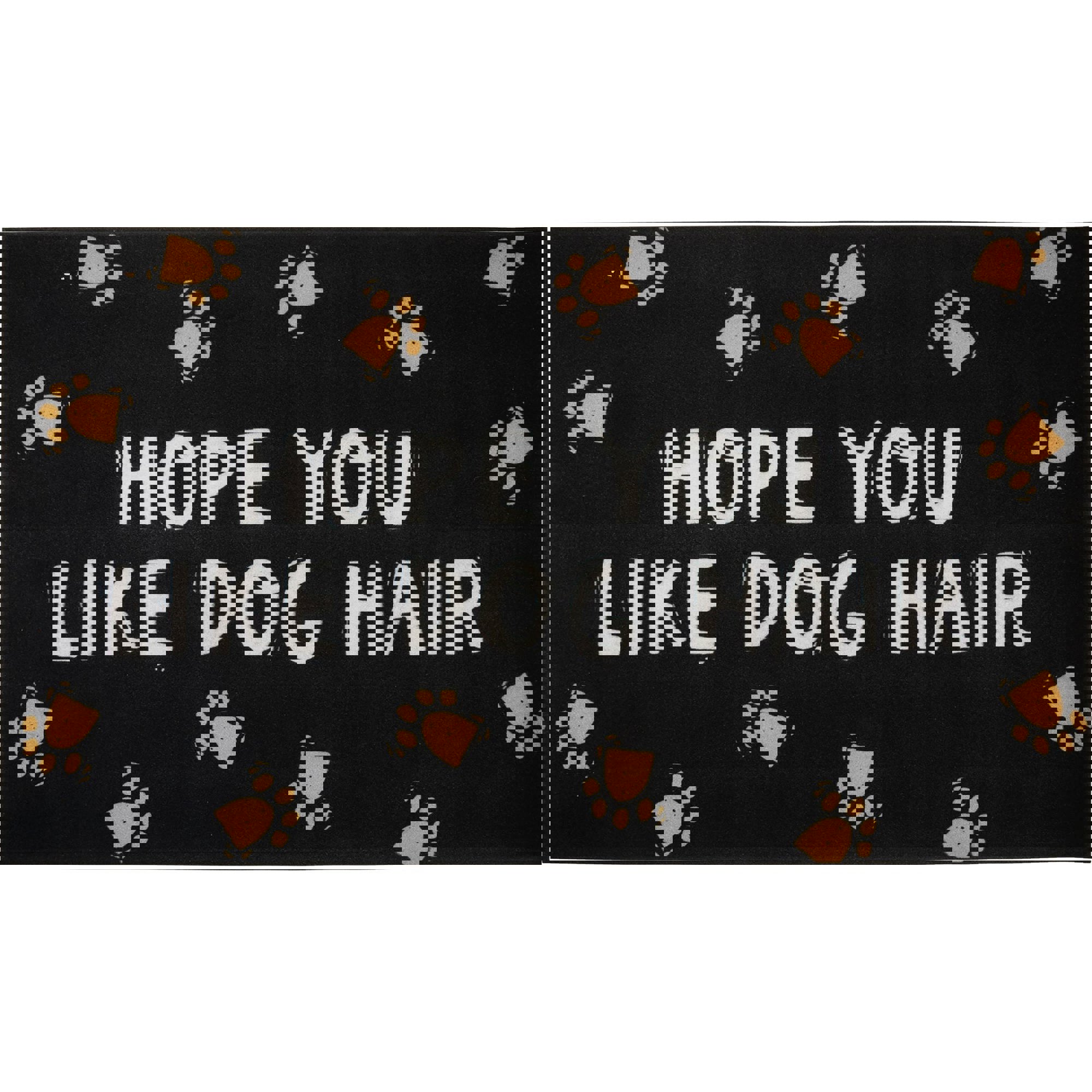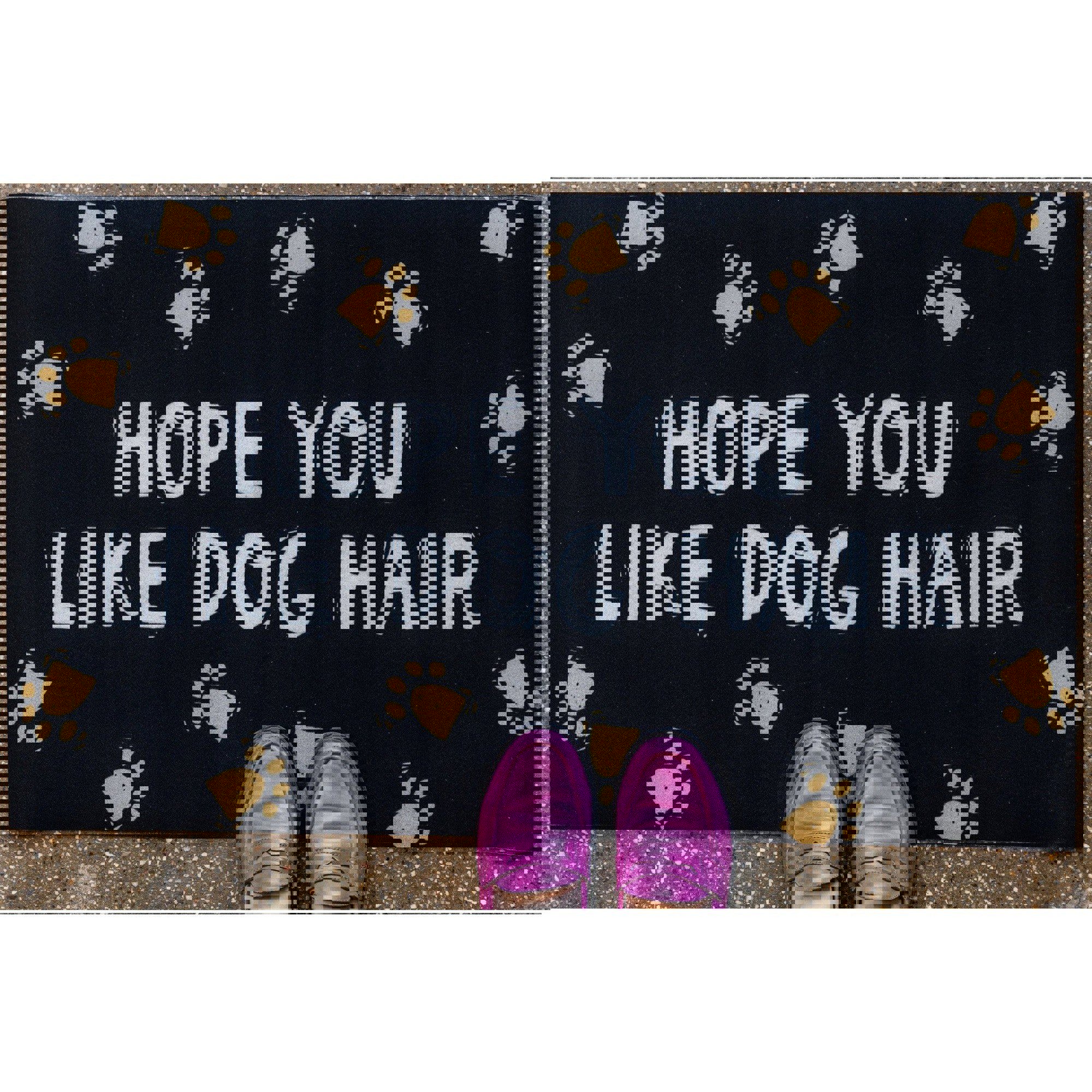 A polyester doormat or small rug featuring block print paw print designs and the phrase "Hope You Like Dog Hair". You can't say your guests weren't warned!