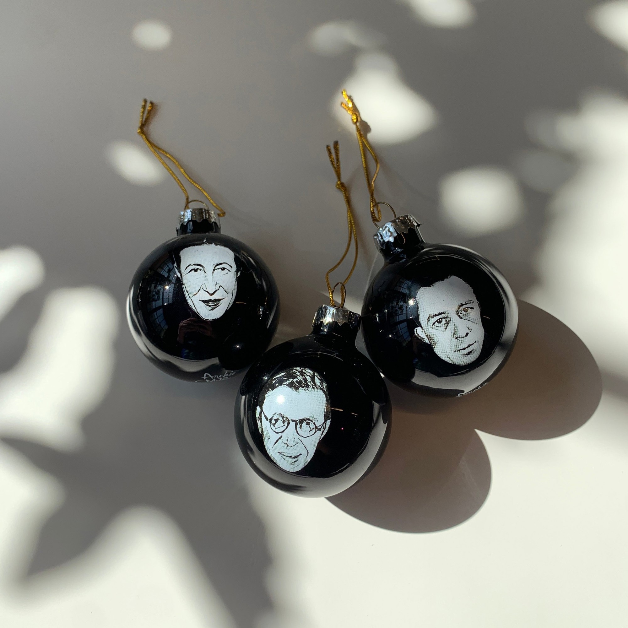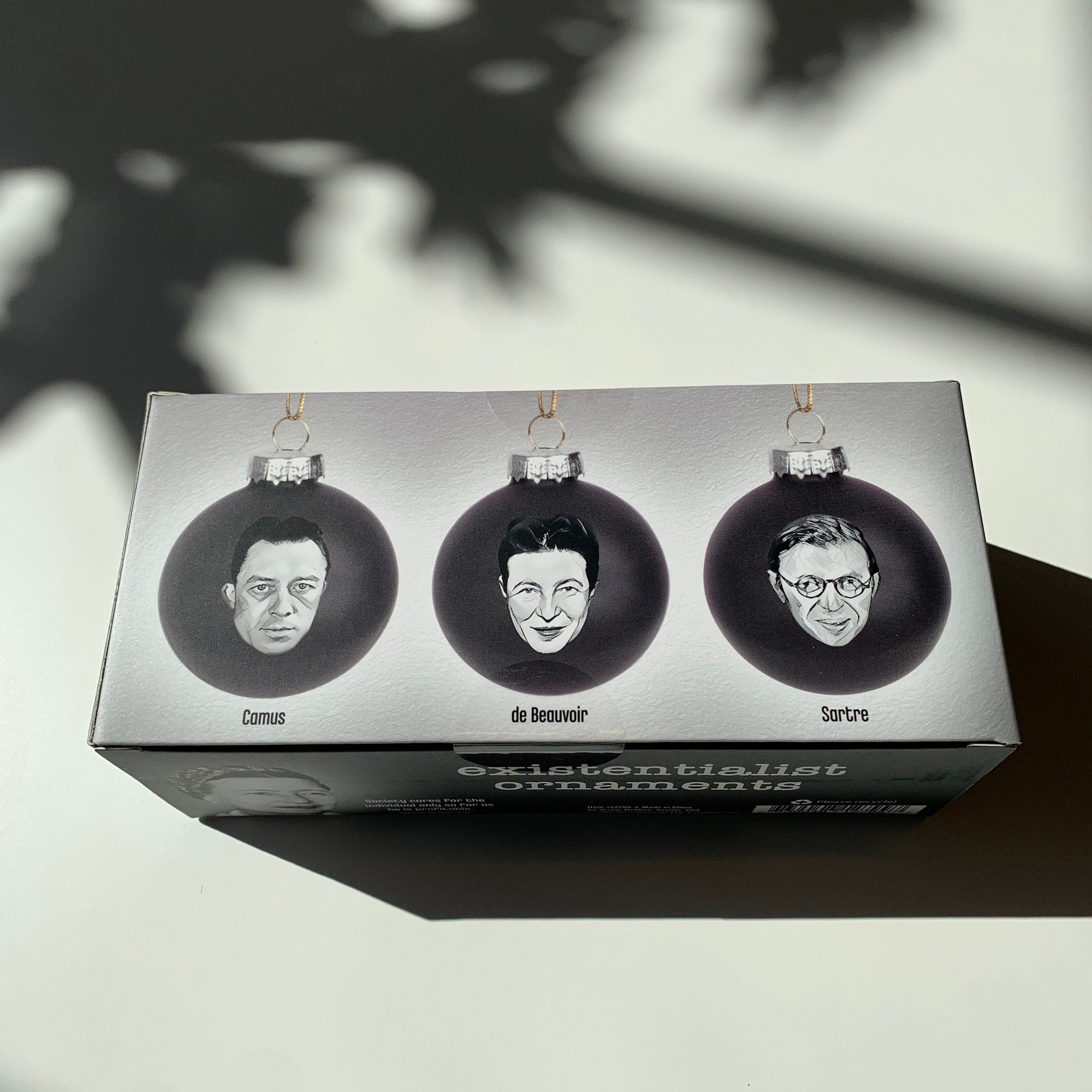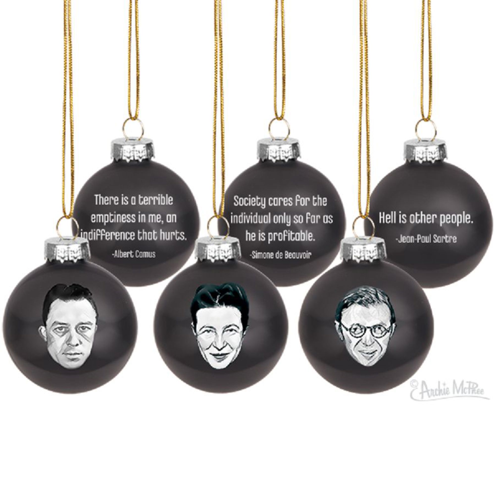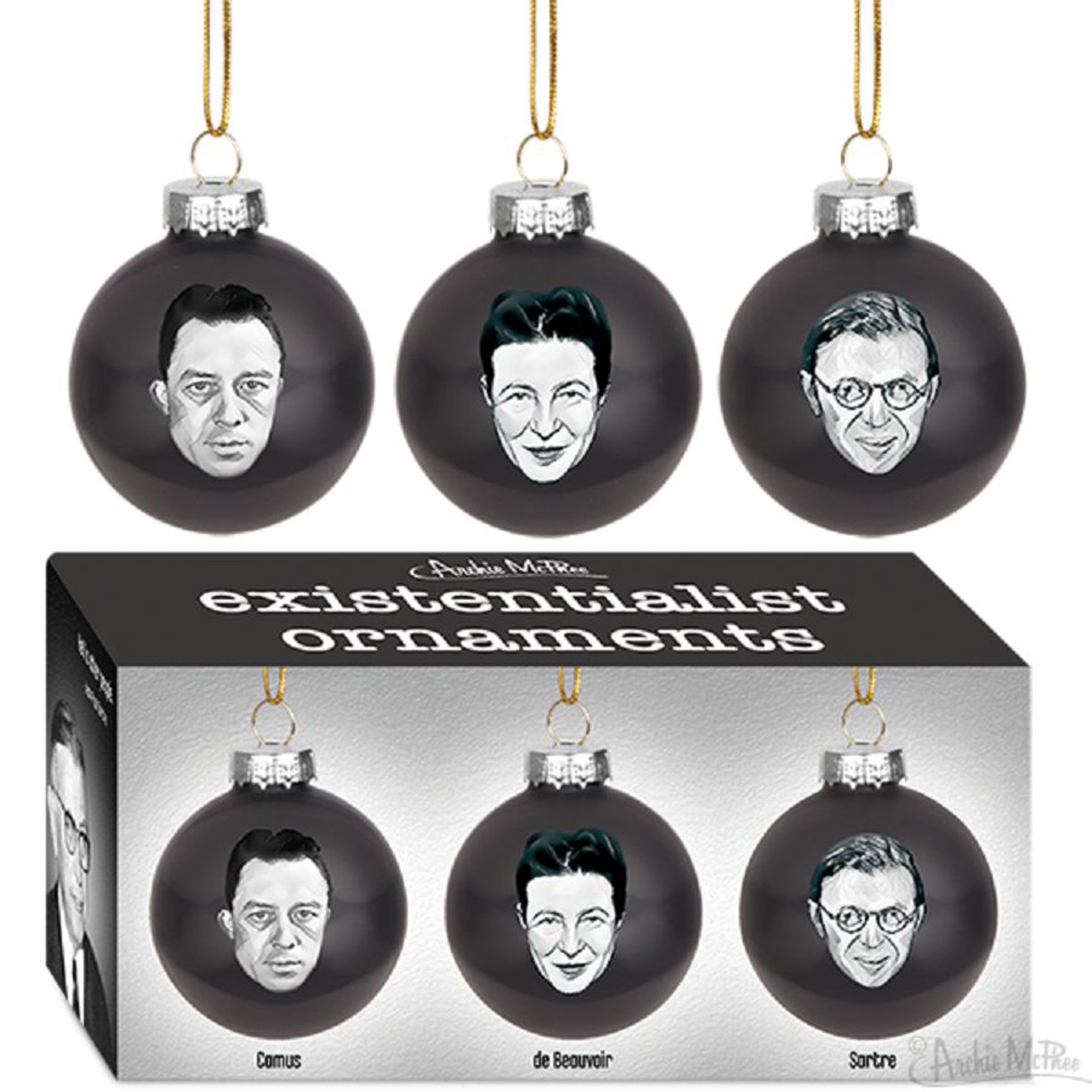This set of three glass 2" (5.1 cm) diameter Existentialist Ornaments features an all-star lineup of existential thought that will add a dash of “cheer” to your tree.