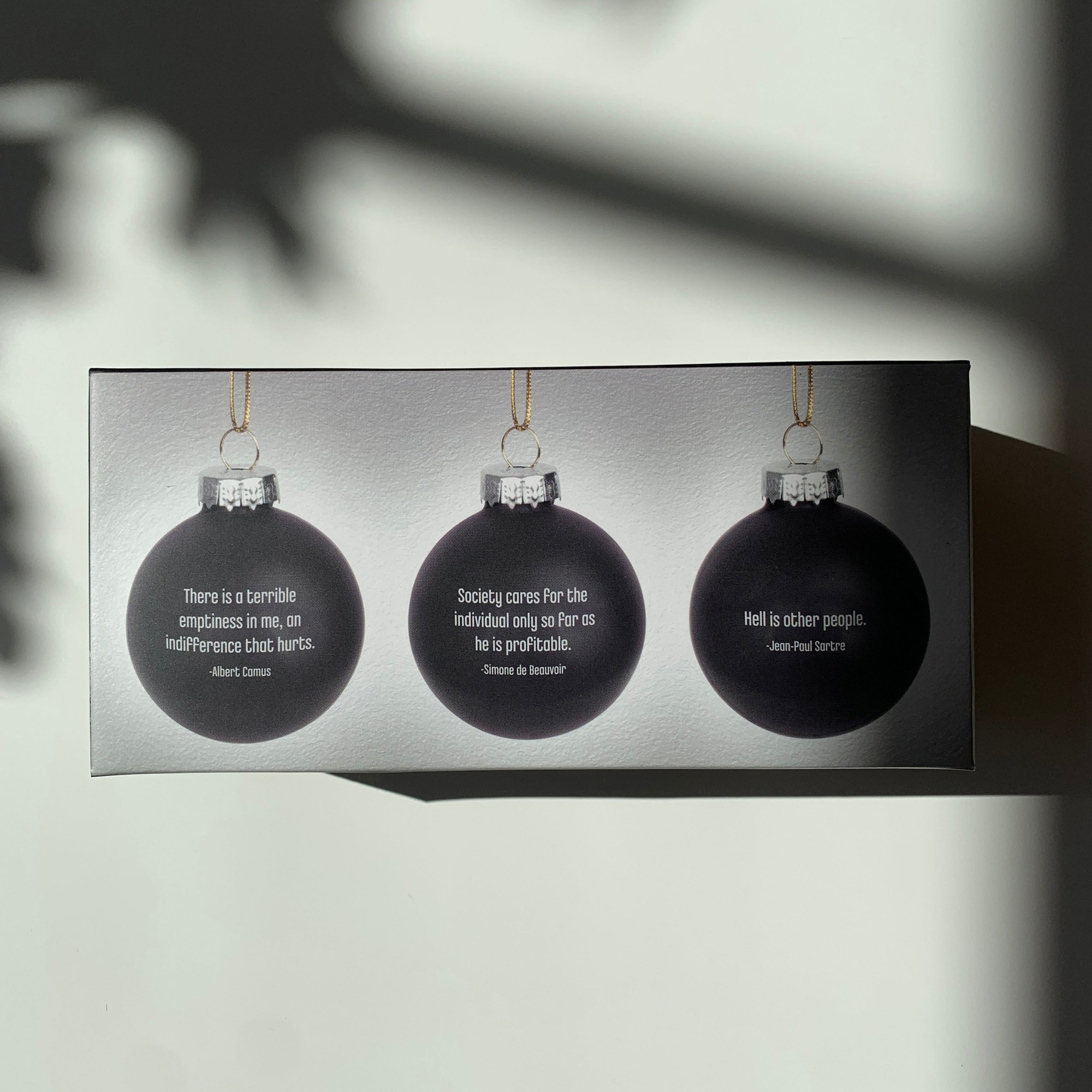 Set of 3 Existentialist Holiday Glass Mini Ornaments in Black with Depressing Quotes from Camus, Sartre, and de Beauvoir | Gift for Her