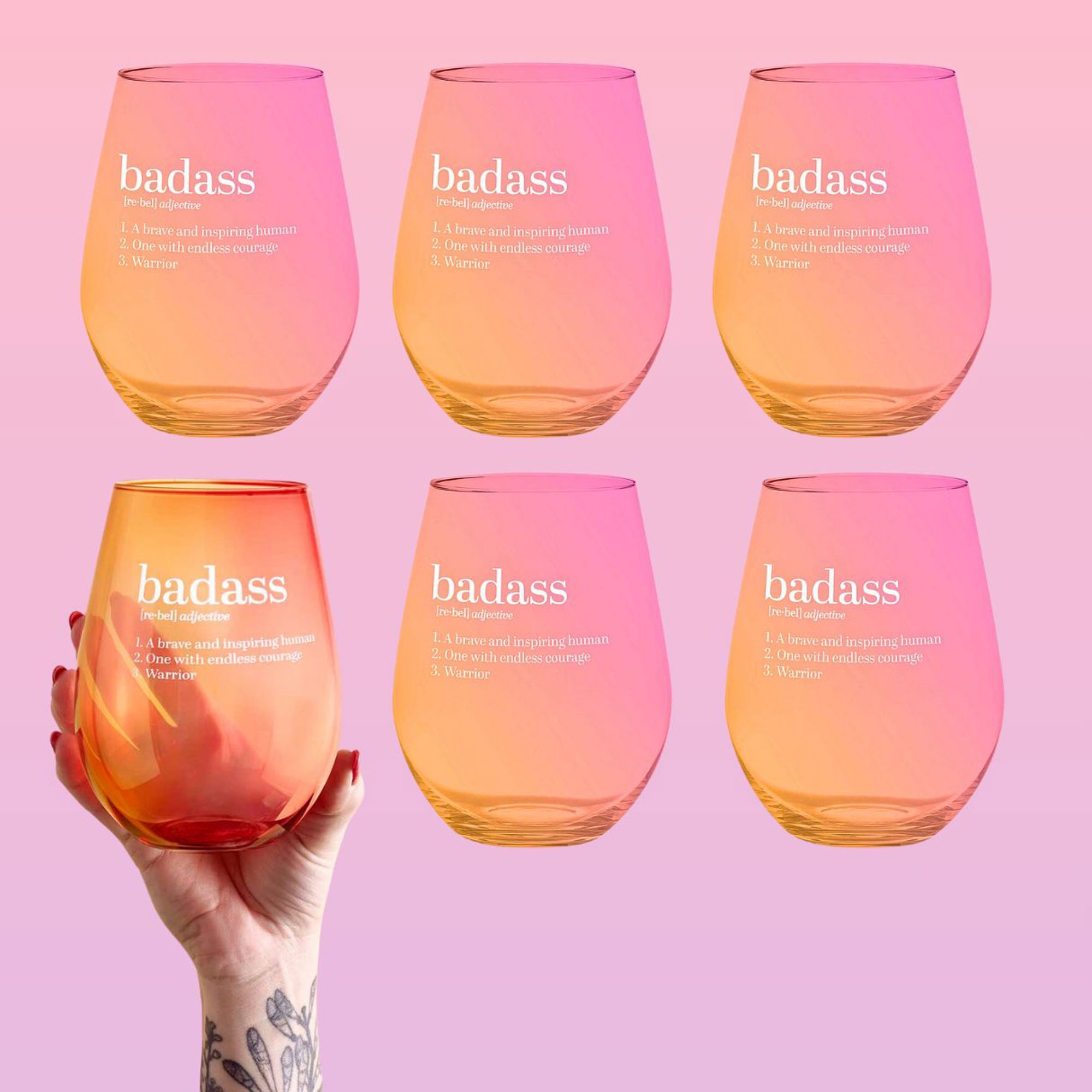 Large and in charge, this huge wine glass holds a whole bottle of wine! A great gift for all the badasses out there! Stemless large wine glass, holds a full bottle of wine Reads: "Badass [re·bel] adjective. 1) A brave and inspiring human, 2) One with endless courage, 3) Warrior"; white lettering on orange pink ombre wine glass Jumbo size holds 30-ounces Measures 4 x 5.7-inches Mothers Day, birthday, graduation, congratulations gift Set of 6 Each is individually gift packaged, suitable for gifting to multiple people. Care Instructions: Hand wash only with sponge or non-abrasive pad; do not microwave By Slant Collections