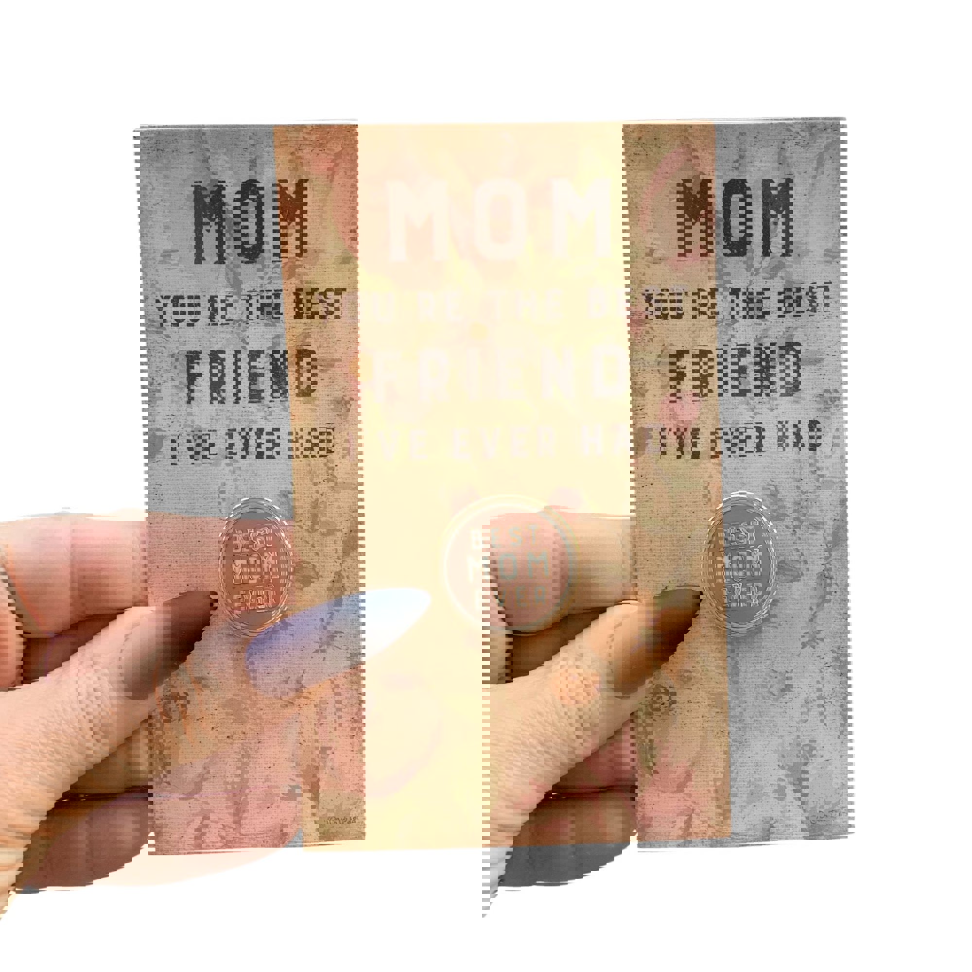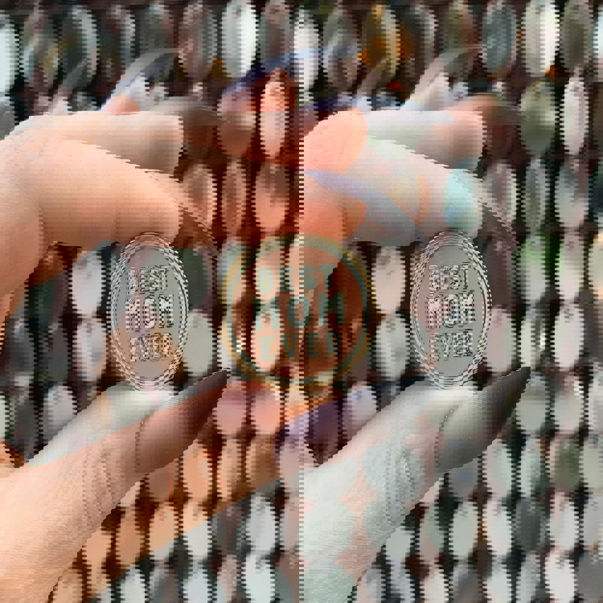 A high-quality hard enamel round pin in bold gold and white lettering featuring "Best Mom Ever" sentiment and butterfly clip closures. Comes packaged on a double-sided, thoughtfully-coordinated "Mom You're the Best Friend I've Ever Had" card and space on the reverse side for a handwritten note.