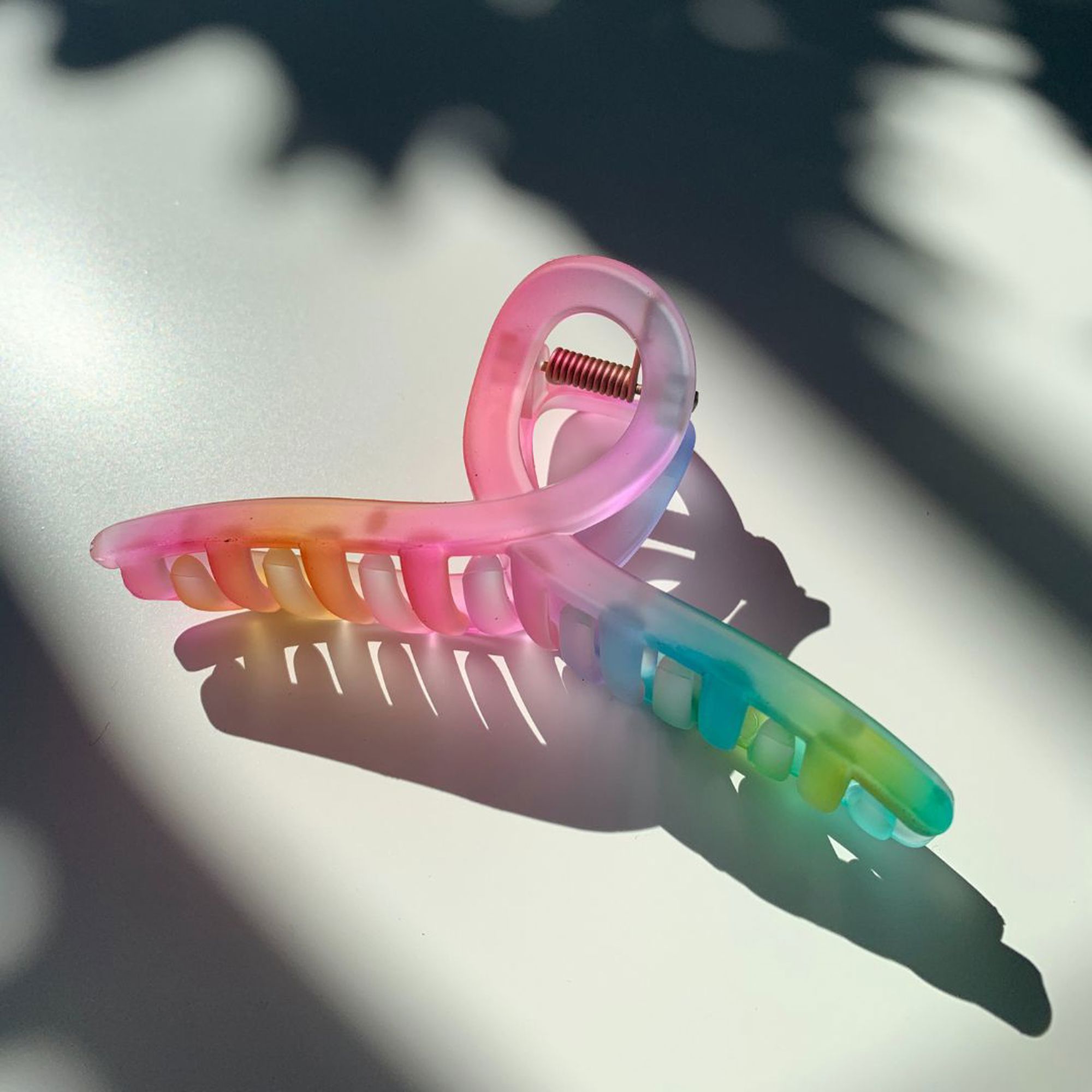 The frosted rainbow finish of this unique hair clip looks like pure happiness and sunshine. Rainbow it up!