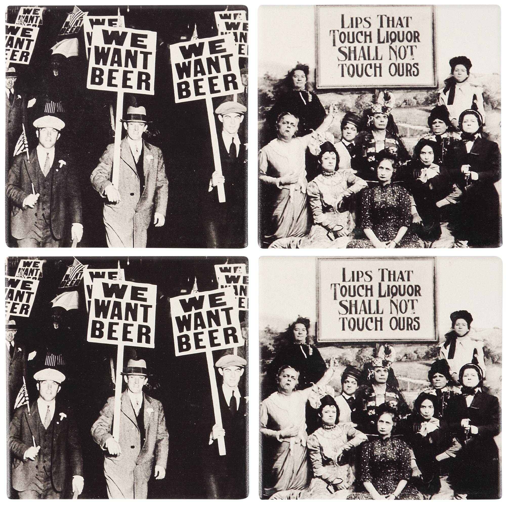 A coordinating set of four stoneware coasters with cork bases displaying vintage photos of protestors from the prohibition era. Coasters feature two of each vintage design.