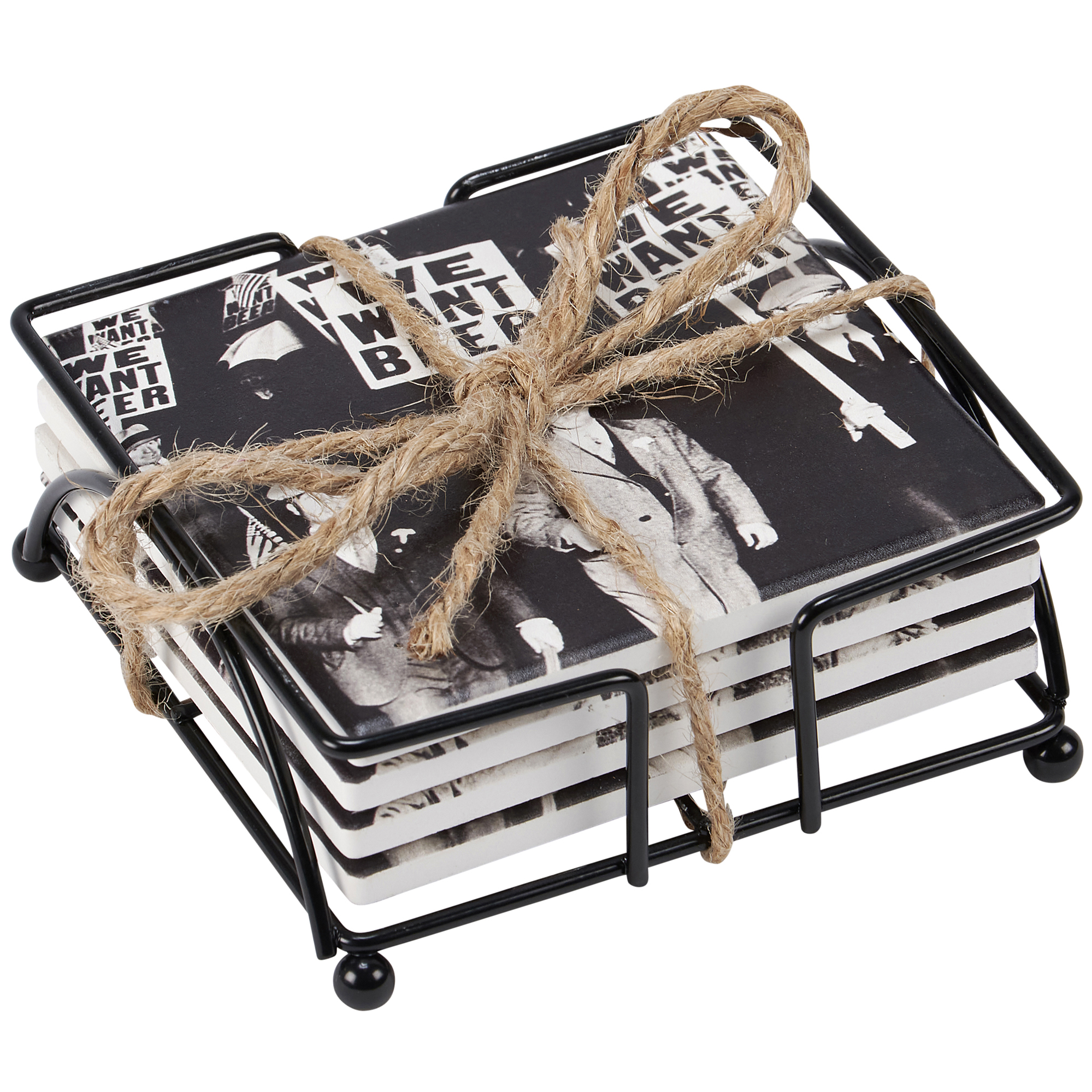 We Want Beer coaster set includes a wire holder to store coasters and comes packaged with jute rope tied around set.