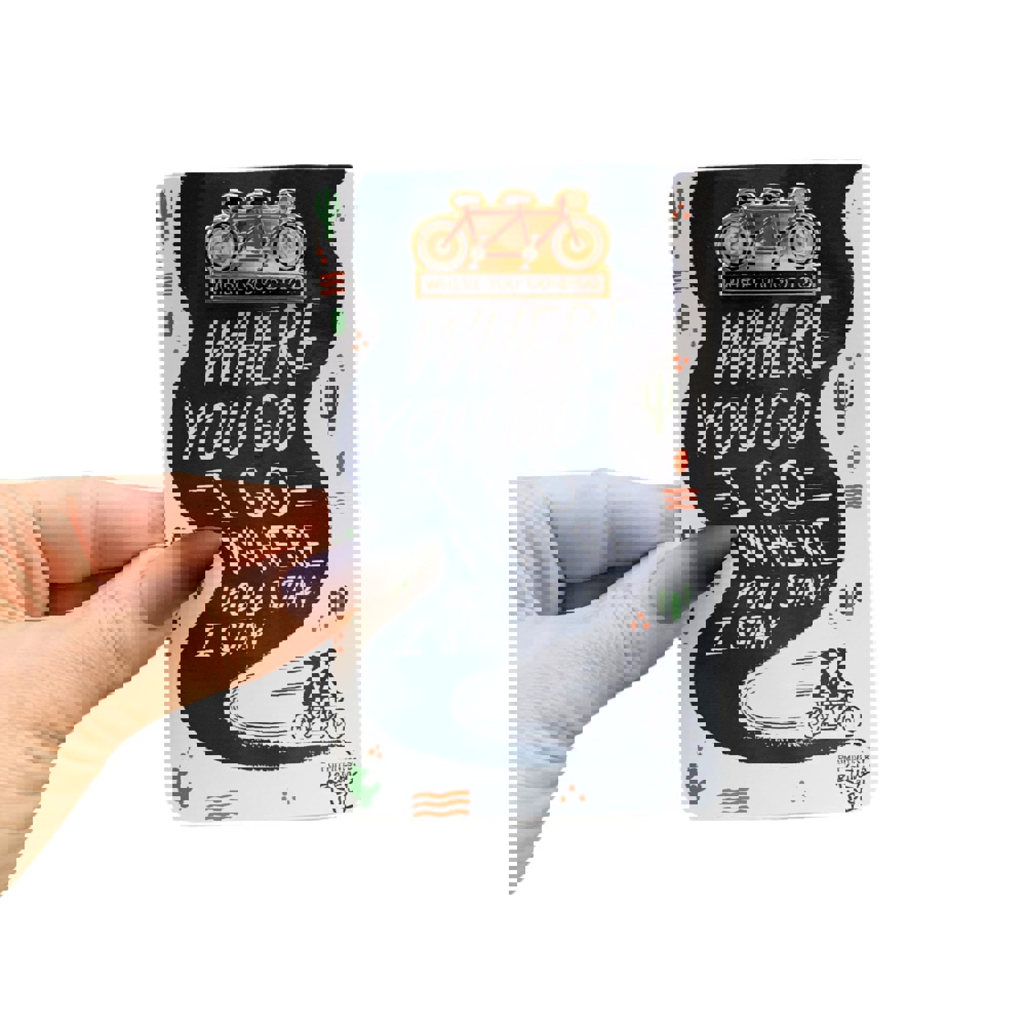 A high-quality hard enamel pin lending a "Where You Go I Go" sentiment, tandem bike design, and a butterfly clip closure. Comes packaged on a double-sided, thoughtfully-coordinated "Where You Go I Go - Where You Stay I Stay" card with space for a handwritten note on the back.