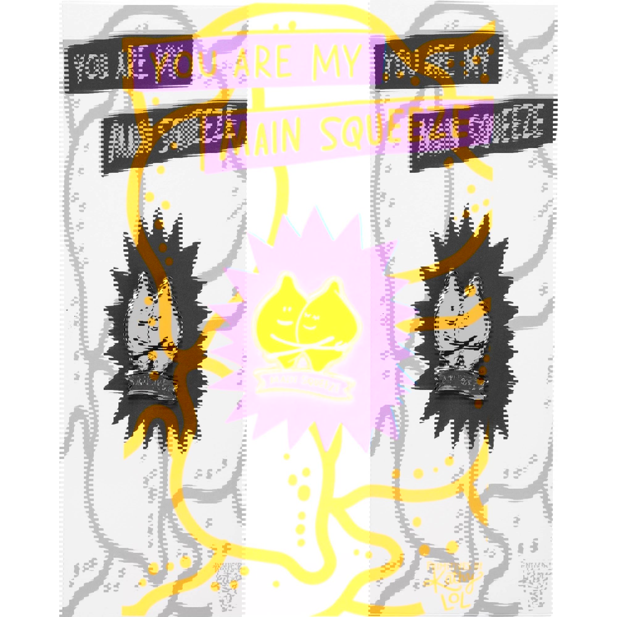 A high-quality hard enamel "Main Squeeze" pin with hugging lemons design and butterfly clip closure. Comes packaged on a double-sided, thoughtfully-coordinated "You Are My Main Squeeze" card with a blank reverse side for a handwritten note.