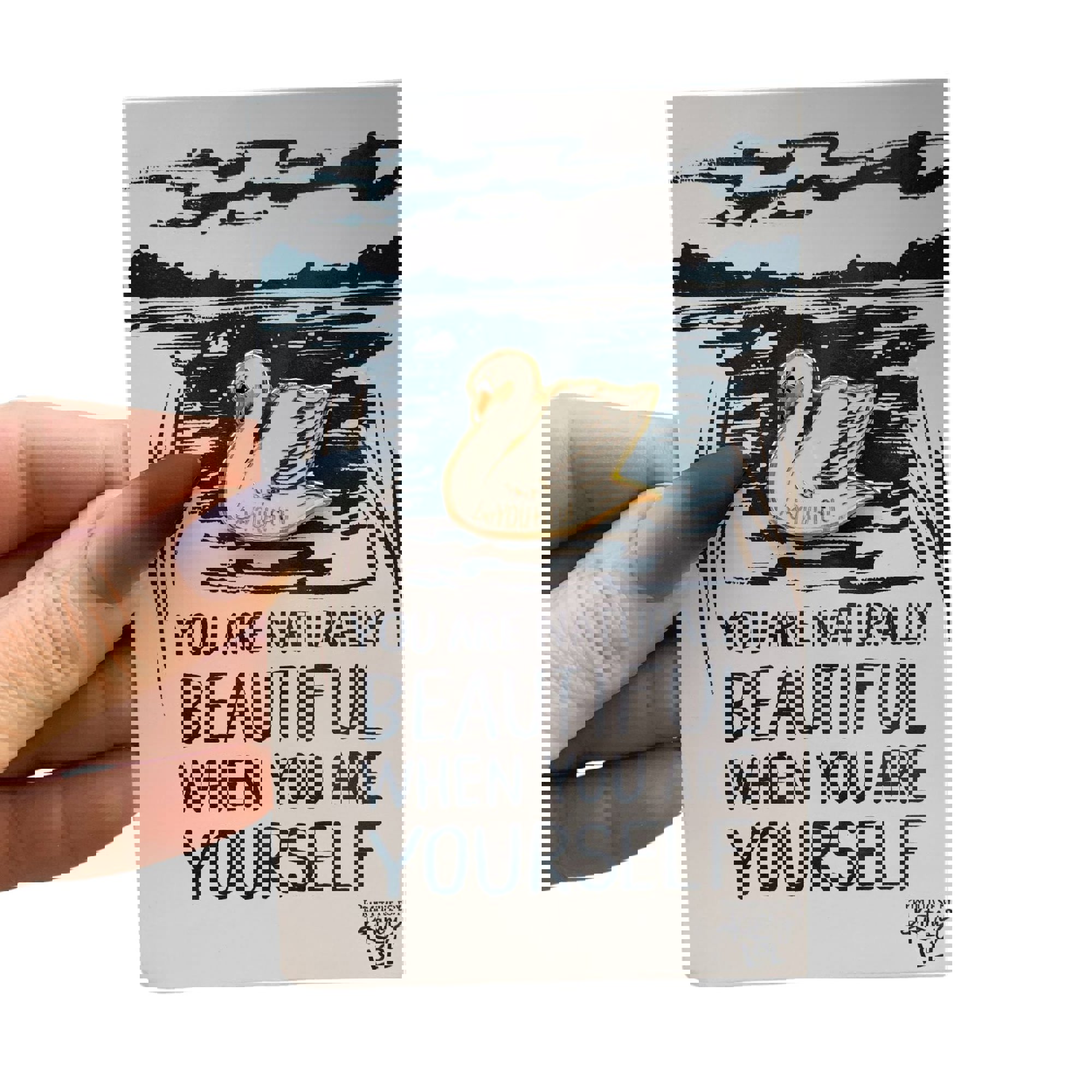 A high-quality hard enamel swan pin lending a "Beyoutiful" sentiment and butterfly clip closure. Comes packaged on a double-sided, thoughtfully-coordinated "You Are Naturally Beautiful When You Are Yourself" card with a blank reverse side for a handwritten note.