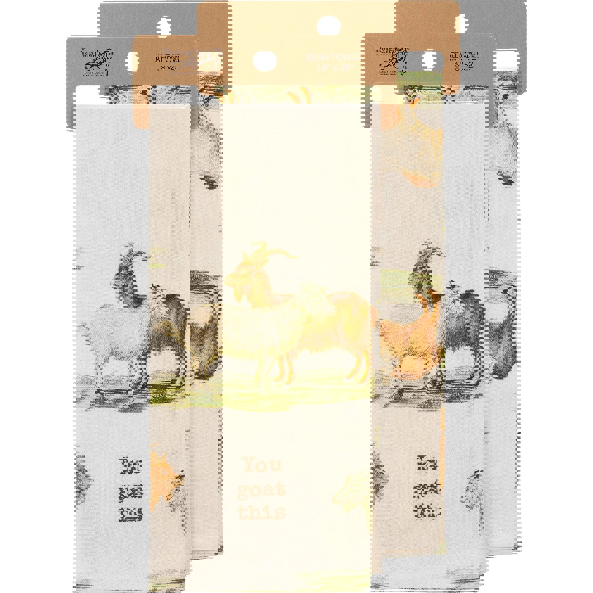 A cotton linen blend kitchen towel featuring all-over vintage-inspired goat designs and punny embroidered "You Goat This" sentiment. Features a cotton loop in the corner for easy hanging.
