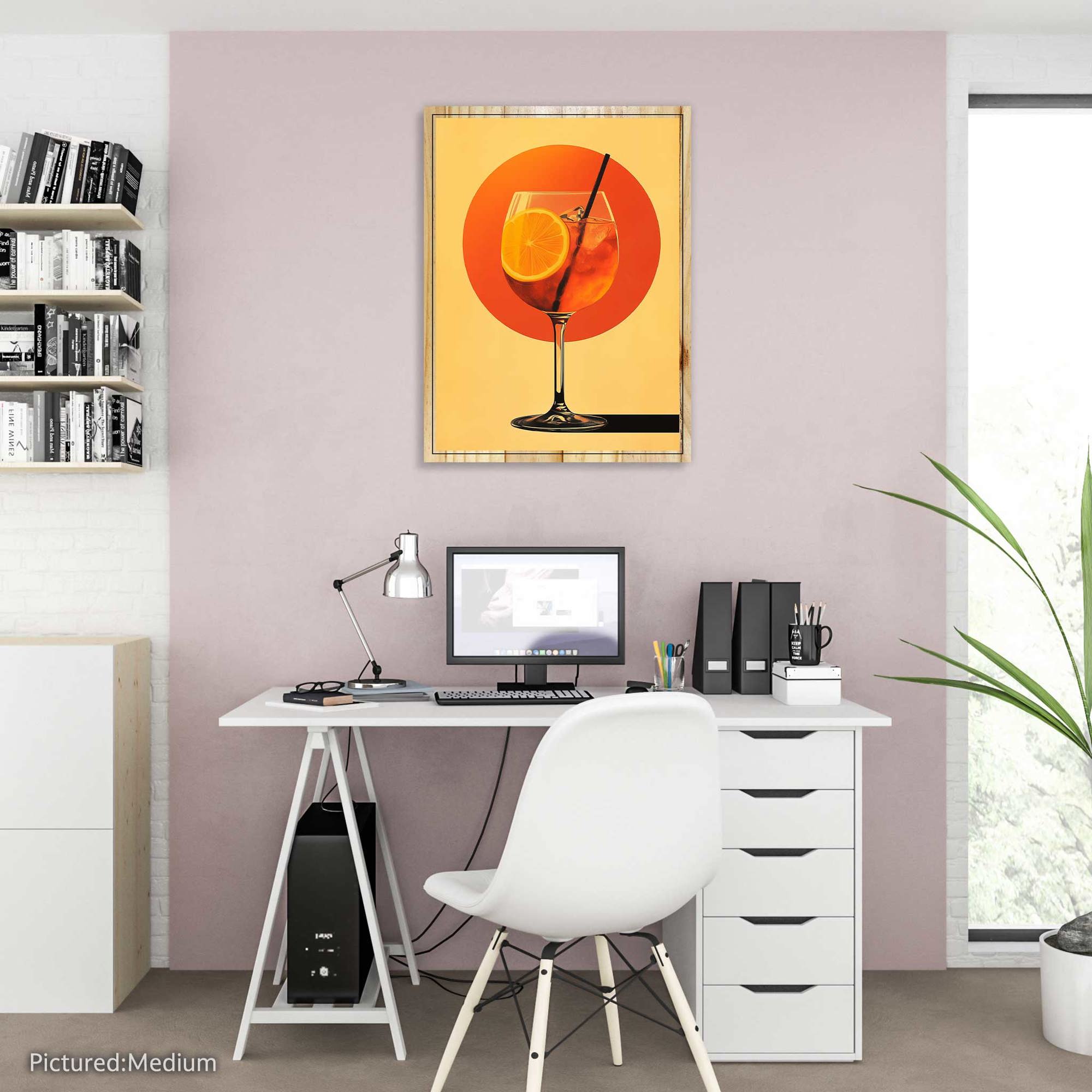 Add a splash of vibrant sophistication to your space with Bittersweet Blaze: Aperol Spritz. This striking artwork captures the iconic Italian cocktail in all its glowing beauty — a crisp spritz served over ice, garnished with a bold citrus slice, and set against a radiant sunburst backdrop. The bold, minimalist composition blends retro charm with contemporary flair, making it a perfect statement piece for kitchens, home bars, dining rooms, or modern living spaces.