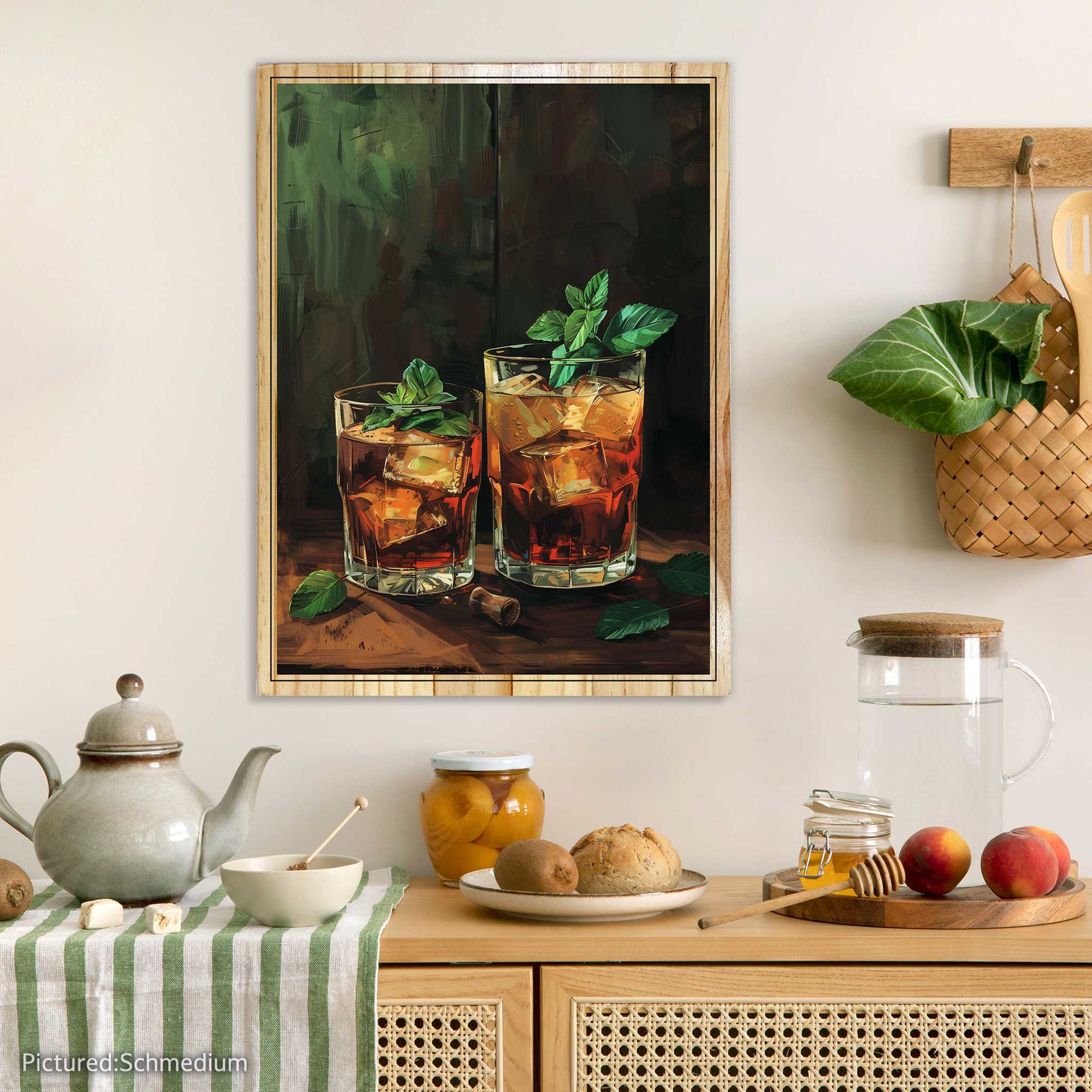 Rich, bold, and timeless, Classic Bourbon captures the warmth and depth of a perfectly poured glass. Two crystal tumblers glow with deep amber tones, their ice catching the light while fresh mint leaves add a subtle hint of contrast and refinement. Set against a moody, textured backdrop, this piece evokes the quiet sophistication of an intimate evening — a moment meant to be savored slowly.