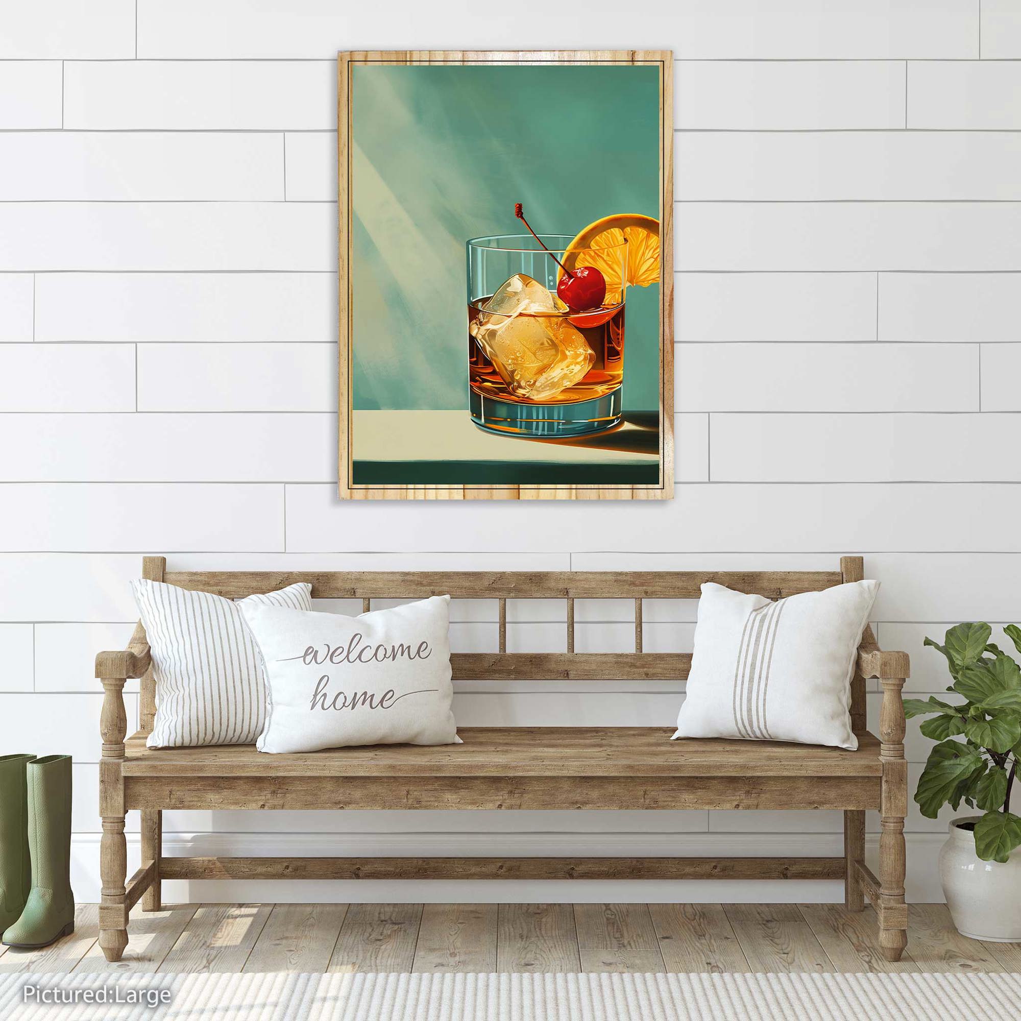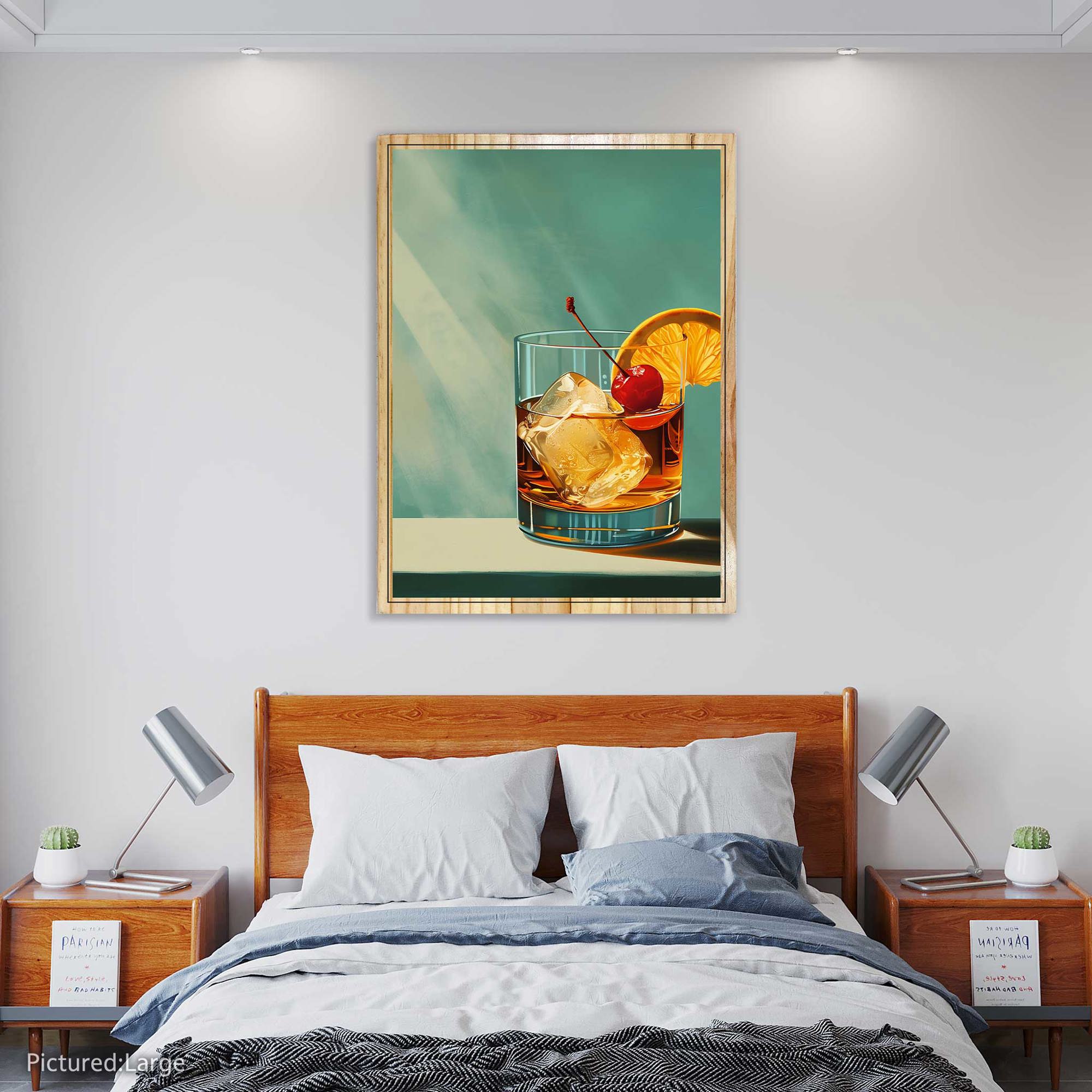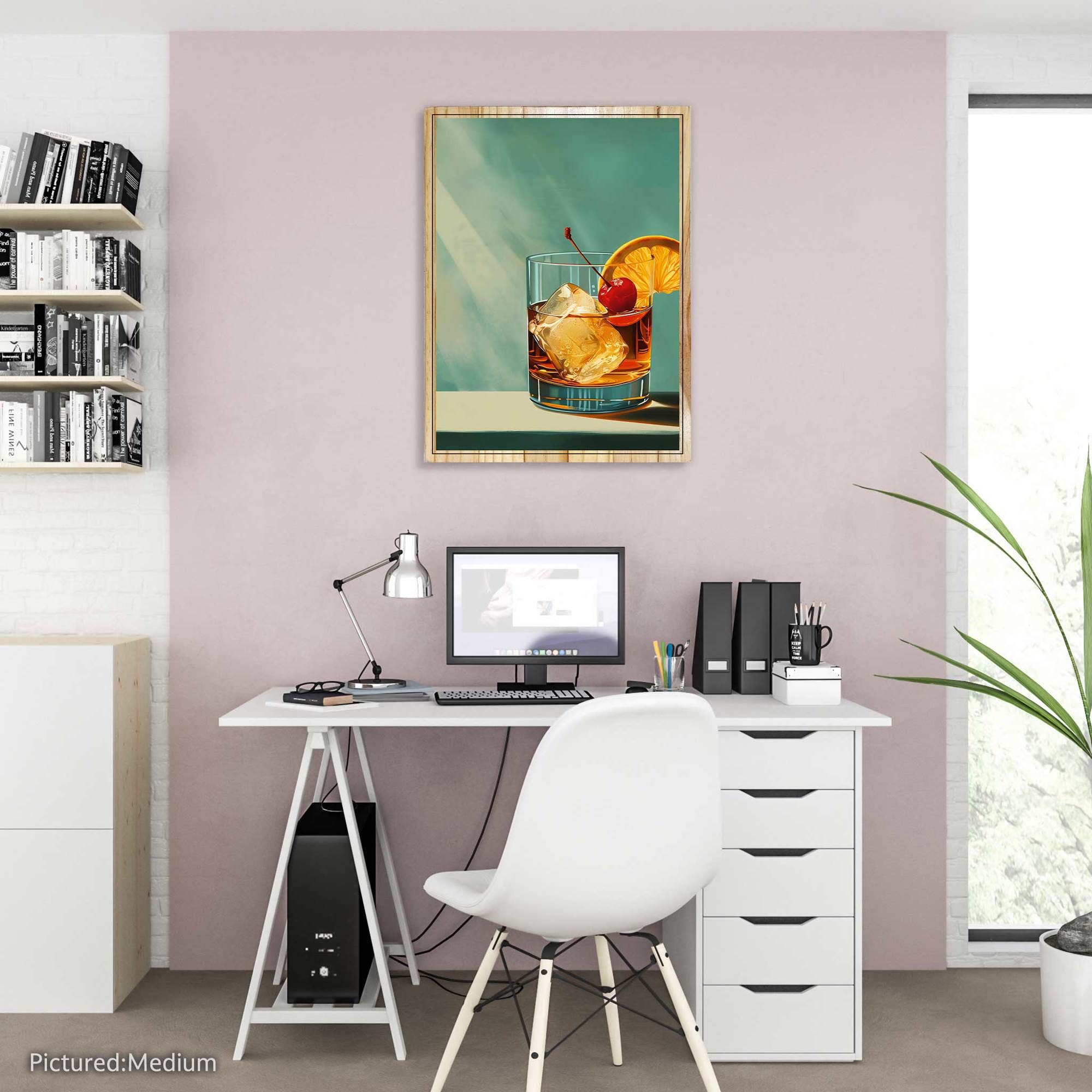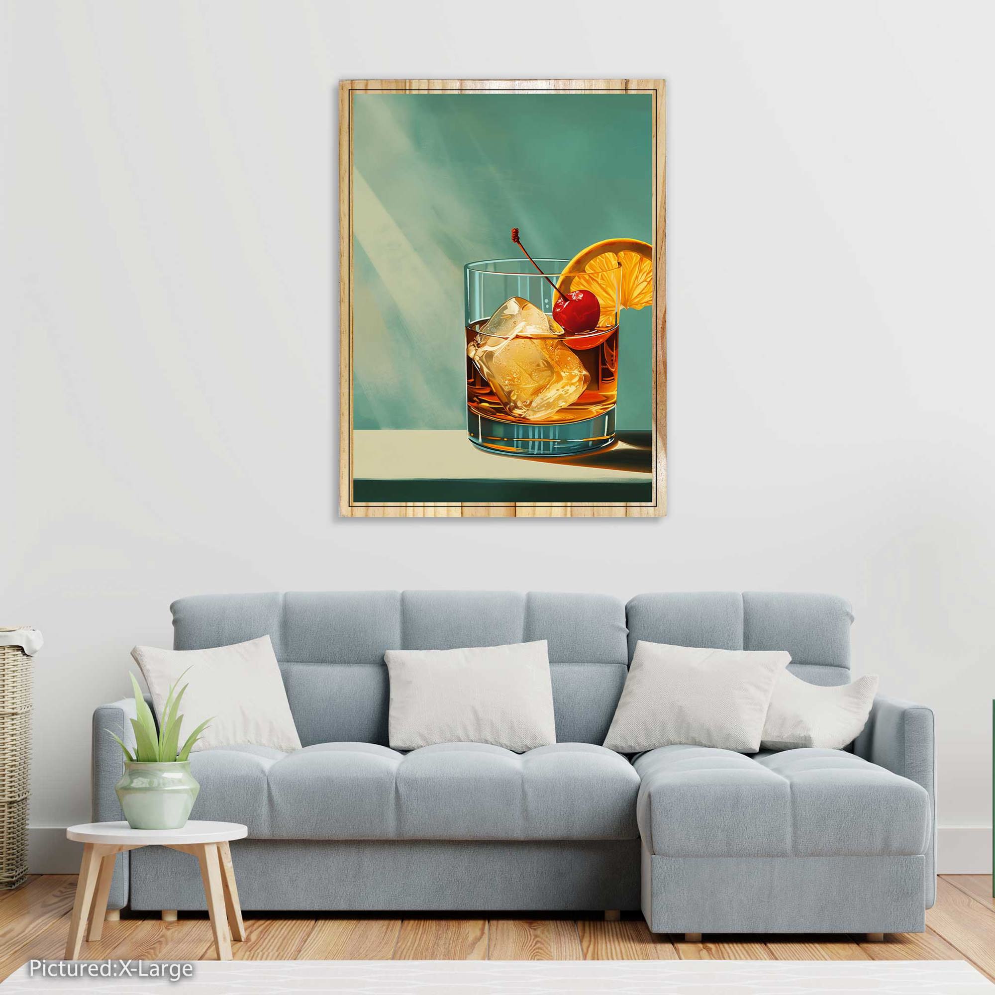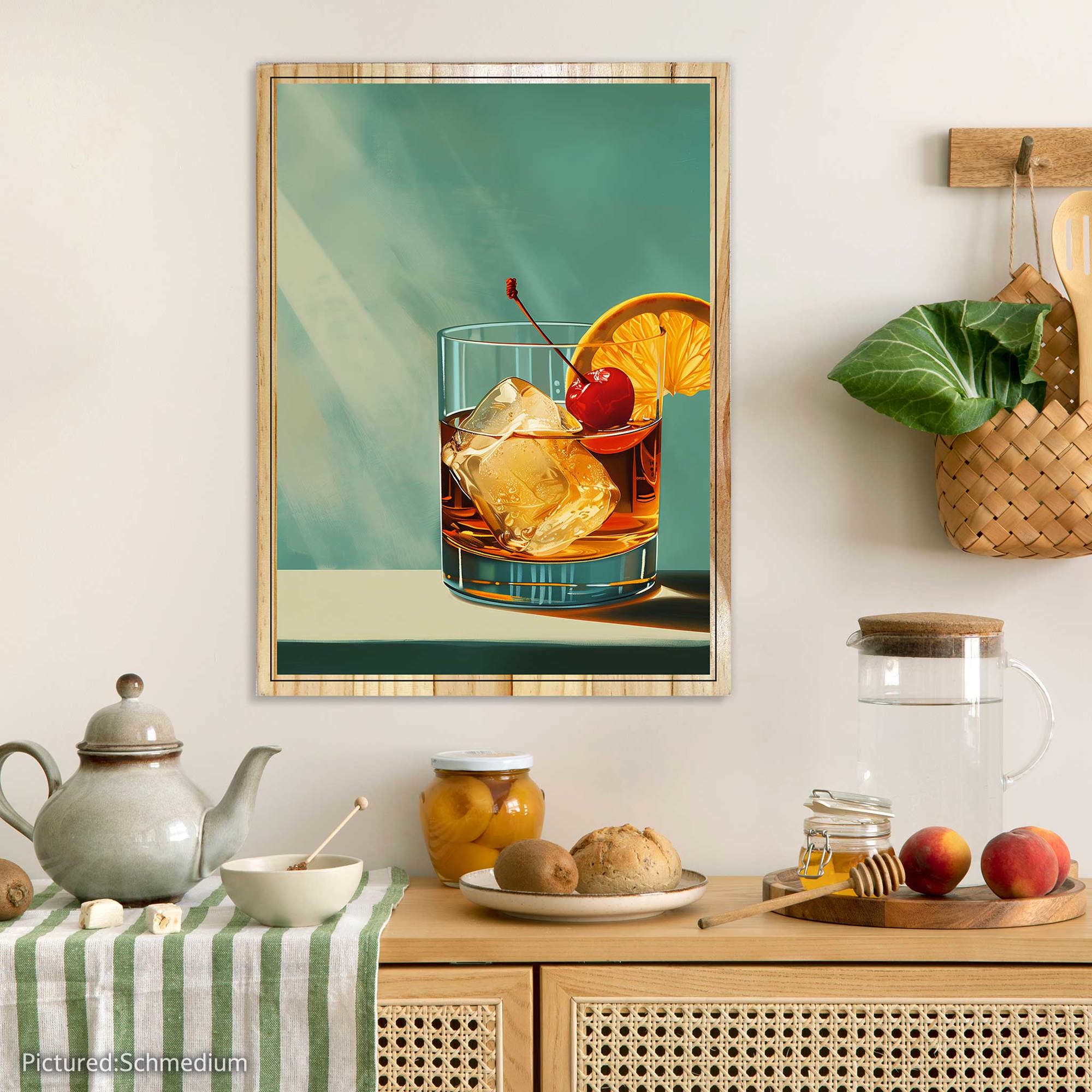 Celebrate timeless taste and effortless sophistication with our Old Fashioned Cocktail art print. This piece captures the classic elegance of a perfectly mixed drink—golden bourbon poured over crystal-clear ice, garnished with a maraschino cherry and a slice of orange. The warm tones of the whiskey contrast beautifully with the cool teal backdrop, evoking a sense of relaxed refinement and evening ambiance.
