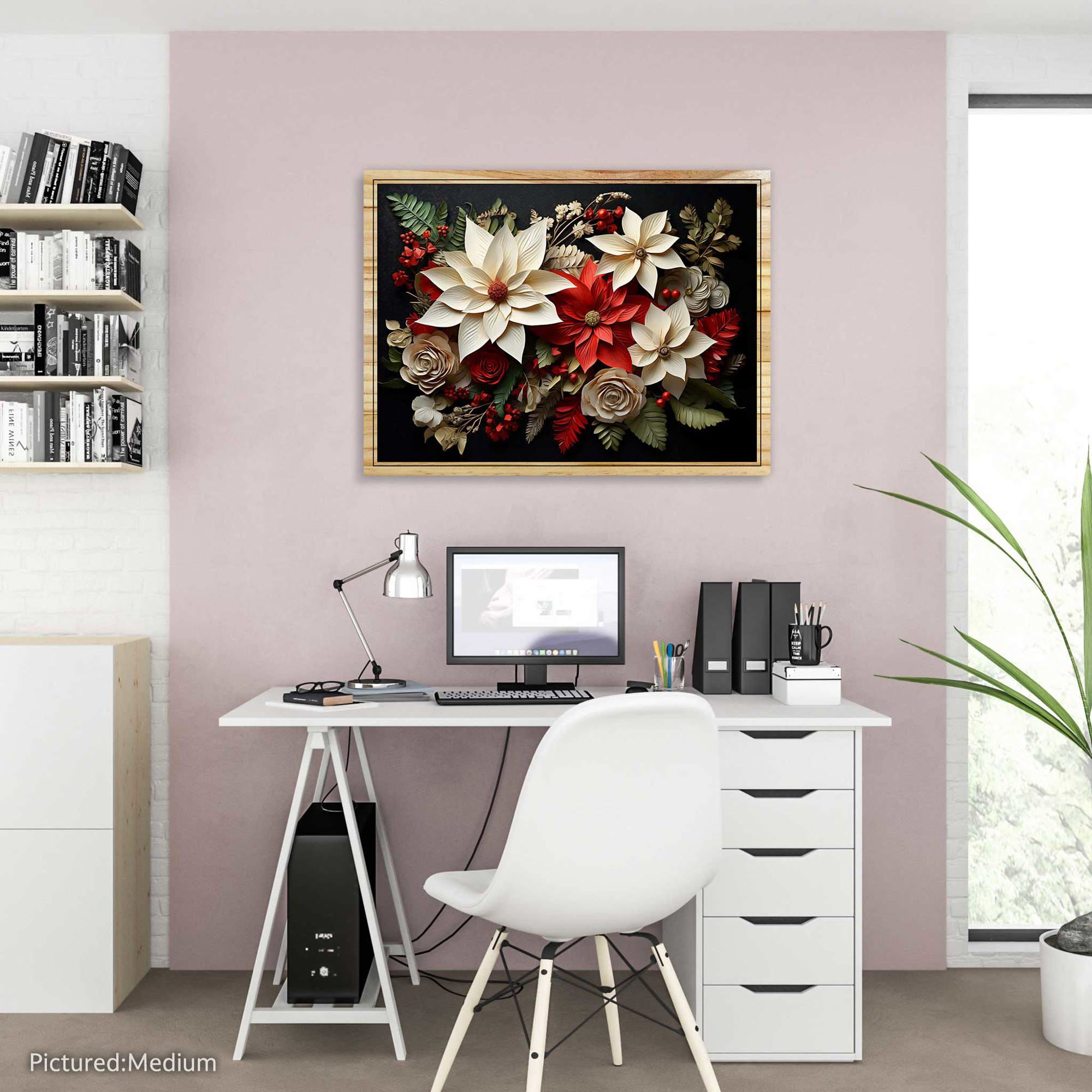 This print of a poinsettia bouquet is a great way to add some holiday color to your home. It’s printed on high-quality pine wood and has a wooden frame. The elevated print makes the flowers and the leaves look more realistic and detailed. This print is a beautiful product that will brighten up your space.