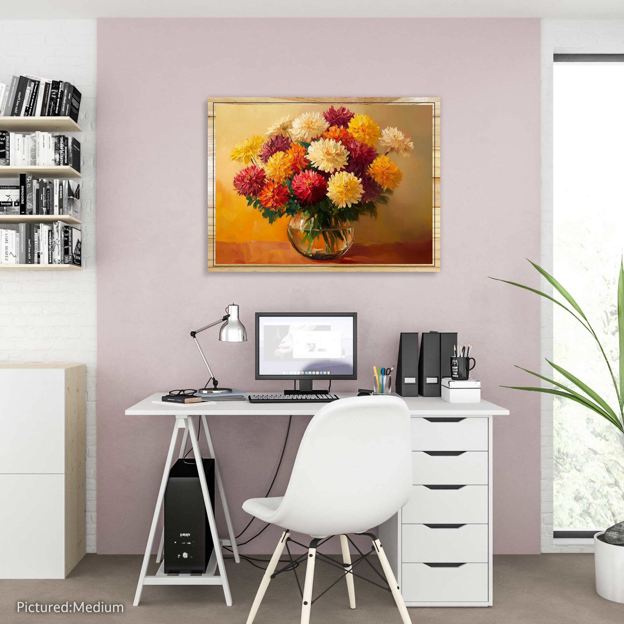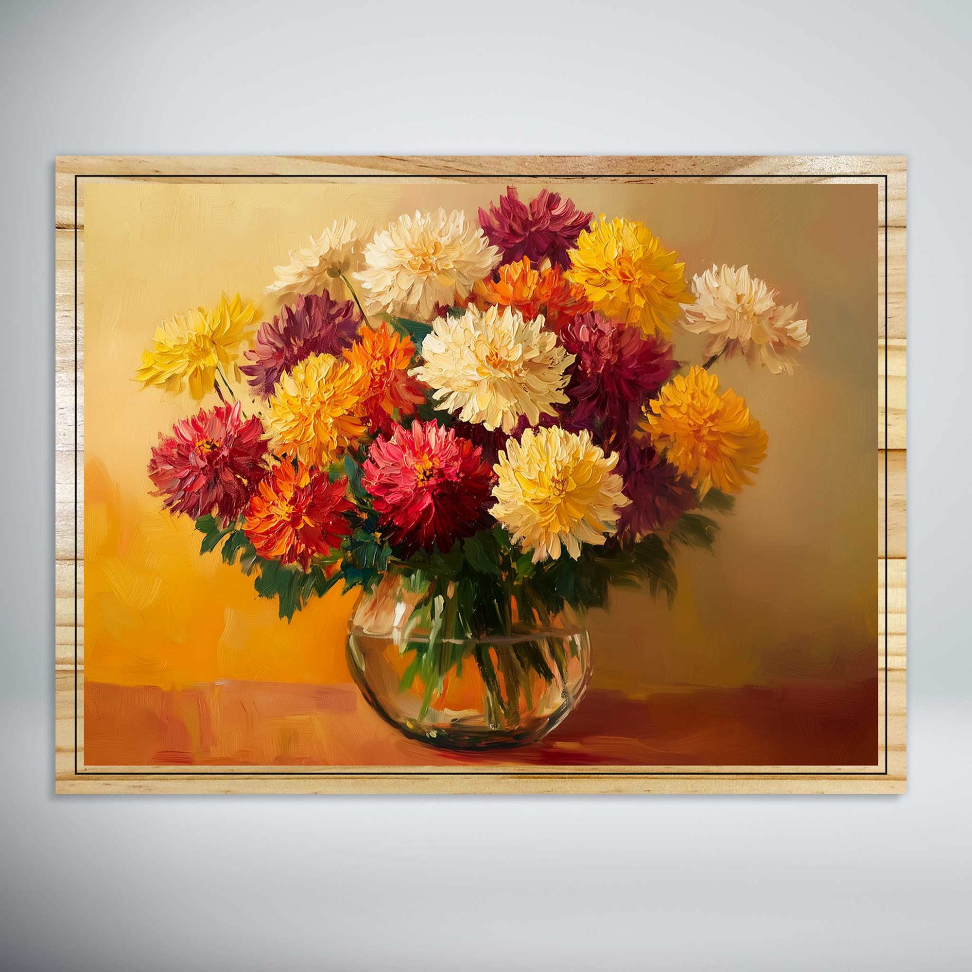 Brighten your space with the radiant beauty of Sunset Bloom, a vibrant floral arrangement captured in rich, painterly detail. This stunning artwork features a bouquet of dahlias in shades of crimson, gold, ivory, and amber — each petal glowing as if kissed by the warm light of a late-summer sunset. Set in a clear glass vase that reflects soft highlights and natural color, this piece offers a striking blend of elegance, warmth, and timeless charm.
