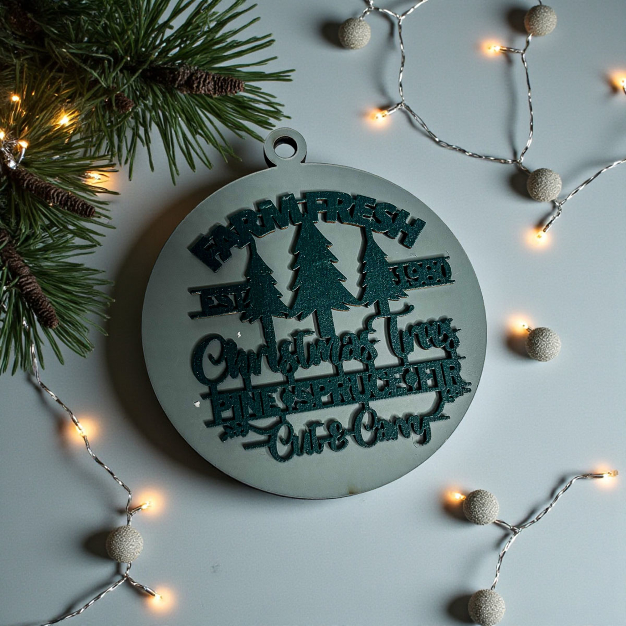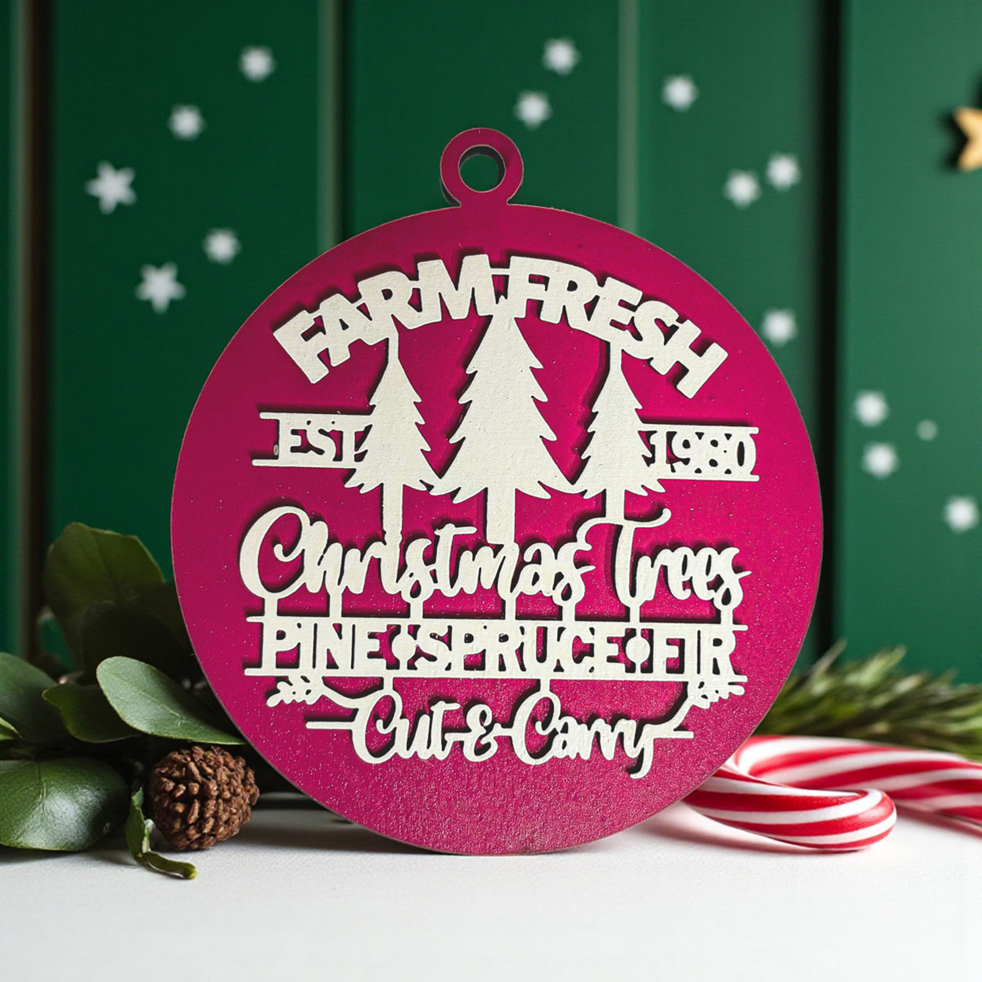 Featuring "Est. 1980" and a trio of Christmas trees (pine, spruce, and fir—because options, right?), this ornament brings all the charm of a classic tree farm right to your holiday decor. With "Cut andCarry" stamped on it, it’s like your own mini slice of the outdoors—minus the sap and heavy lifting. 💪