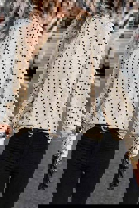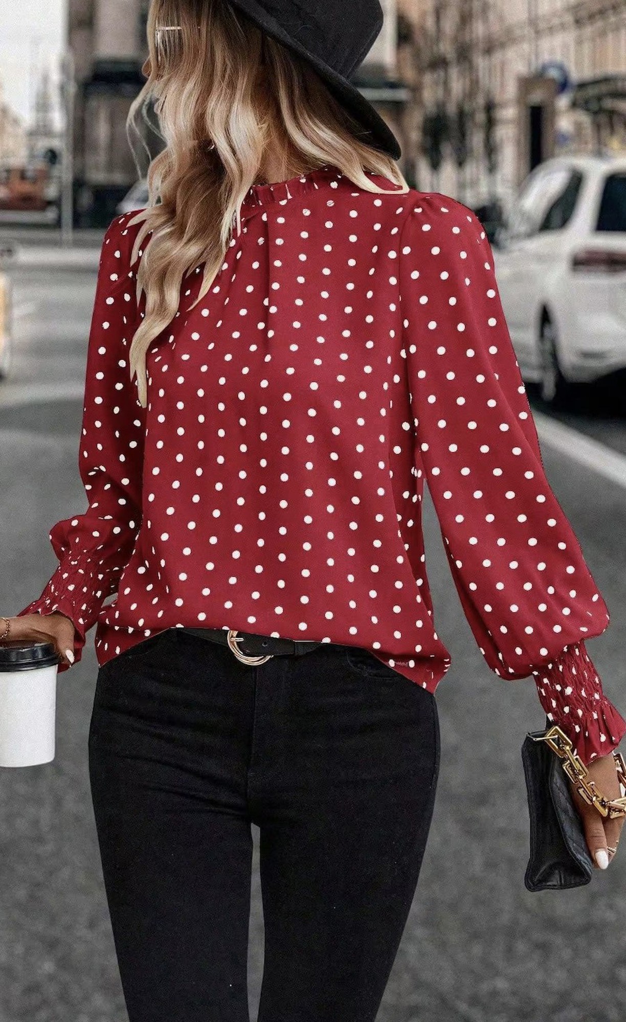 -Chic and versatile long sleeve blouse with a playful polka dot pattern.