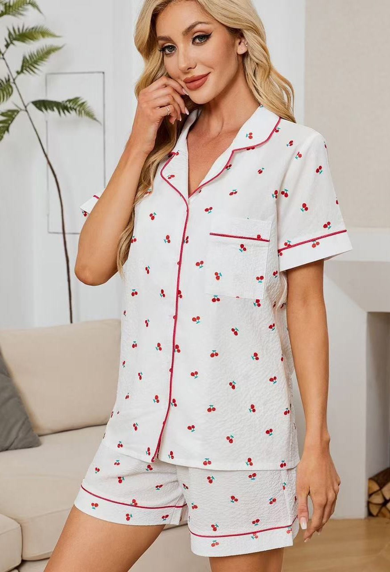 This cherry-print pajama set offers a sweet and cozy option for lounging or sleeping, combining classic sleepwear elements with a fun, whimsical pattern.