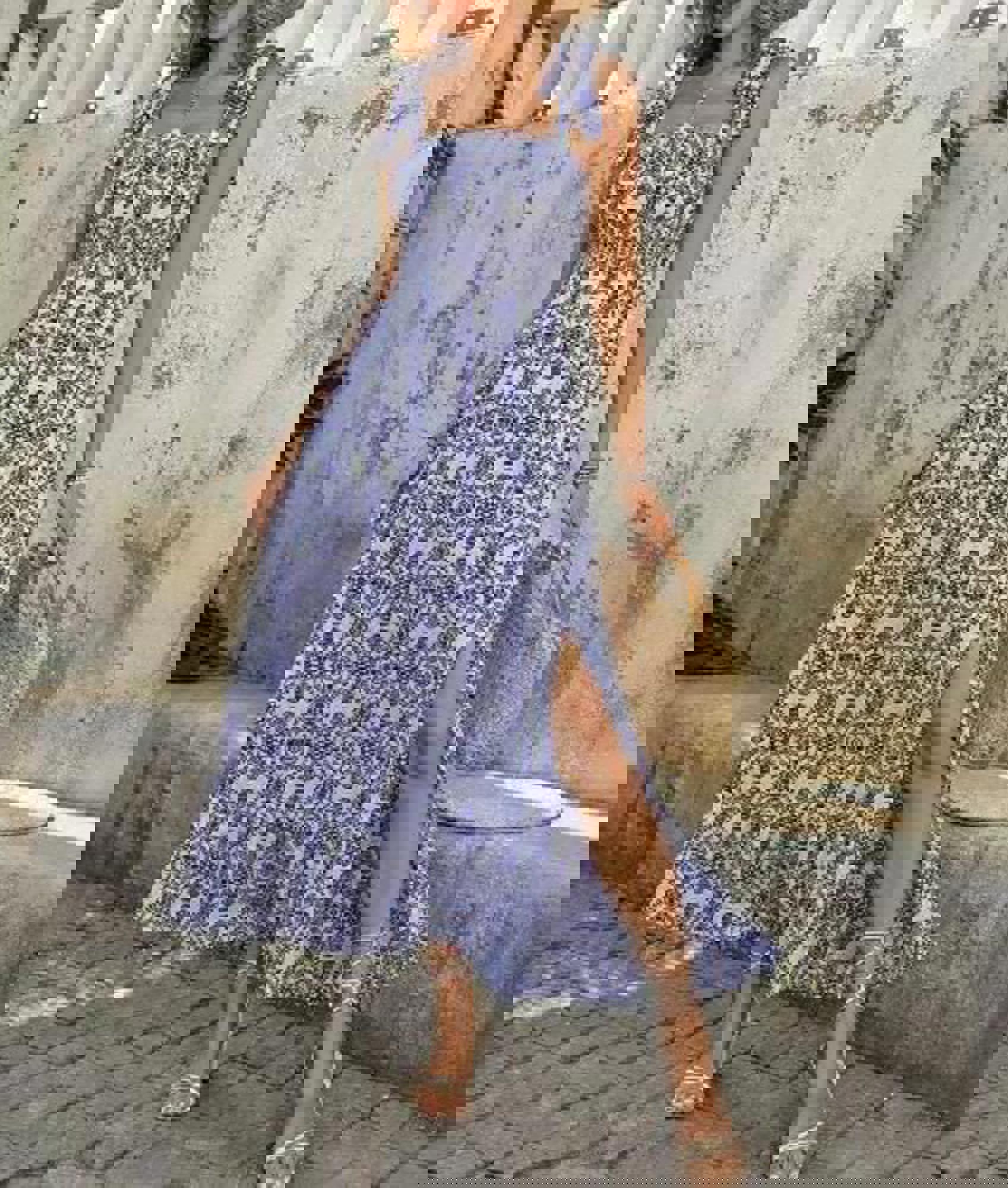 Featuring an intricate print and a square neckline with tie straps, this dress exudes effortless vacation elegance. The high-waist silhouette and side slit create graceful movement and a flattering fit.