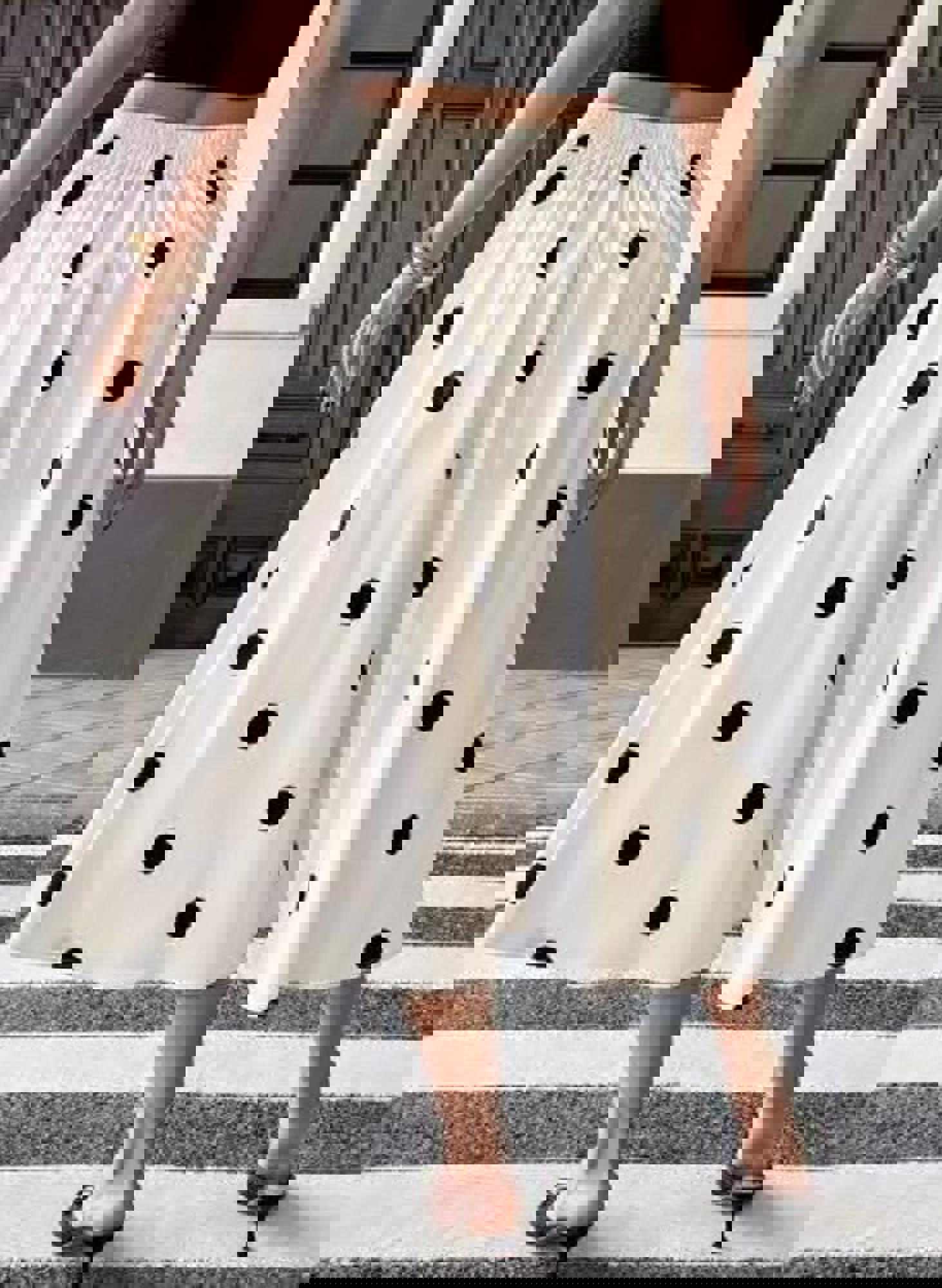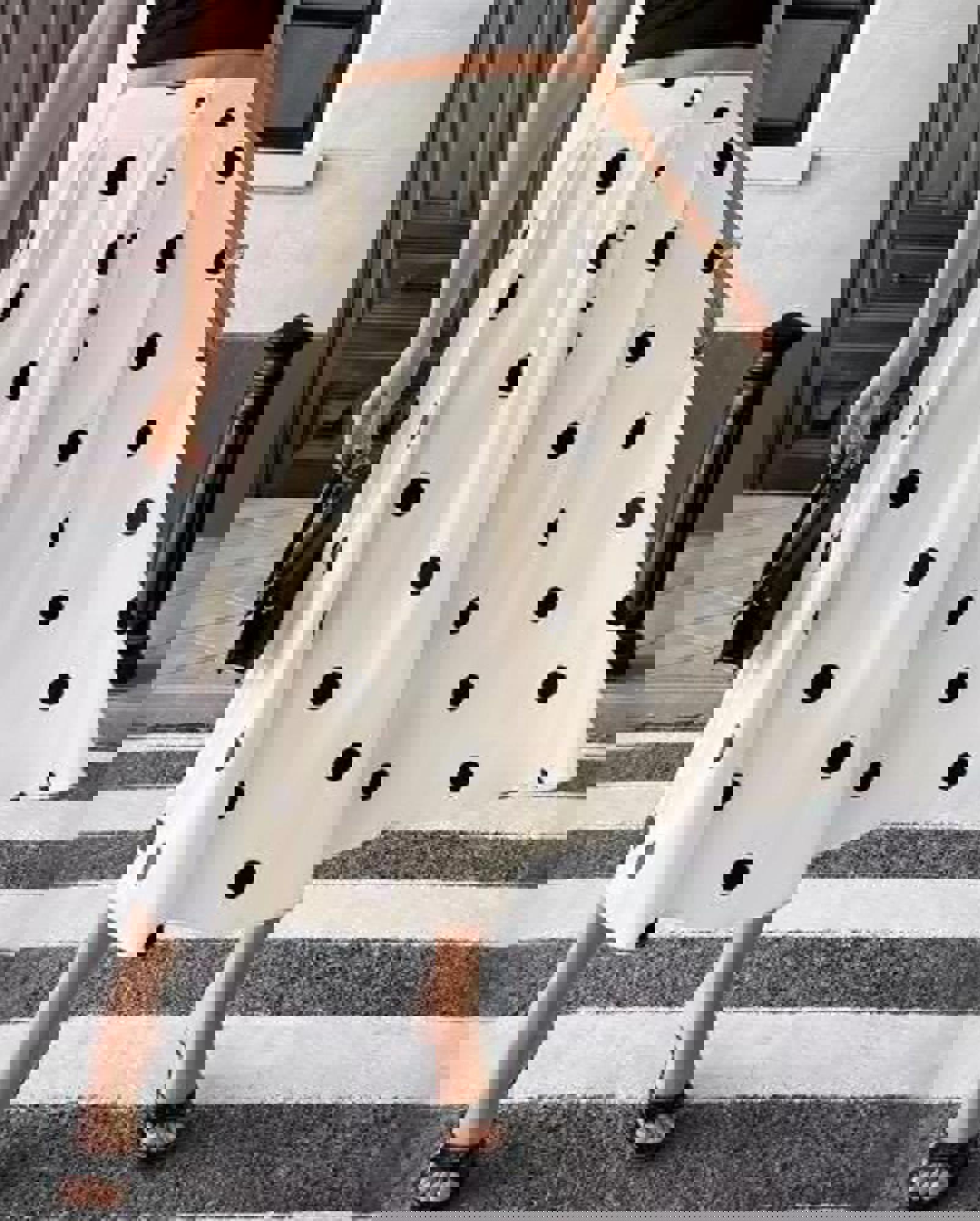 Featuring a timeless polka dot pattern and a flattering high-waist silhouette, this skirt captures effortless retro charm. The full, flowing design adds graceful movement with every step.
