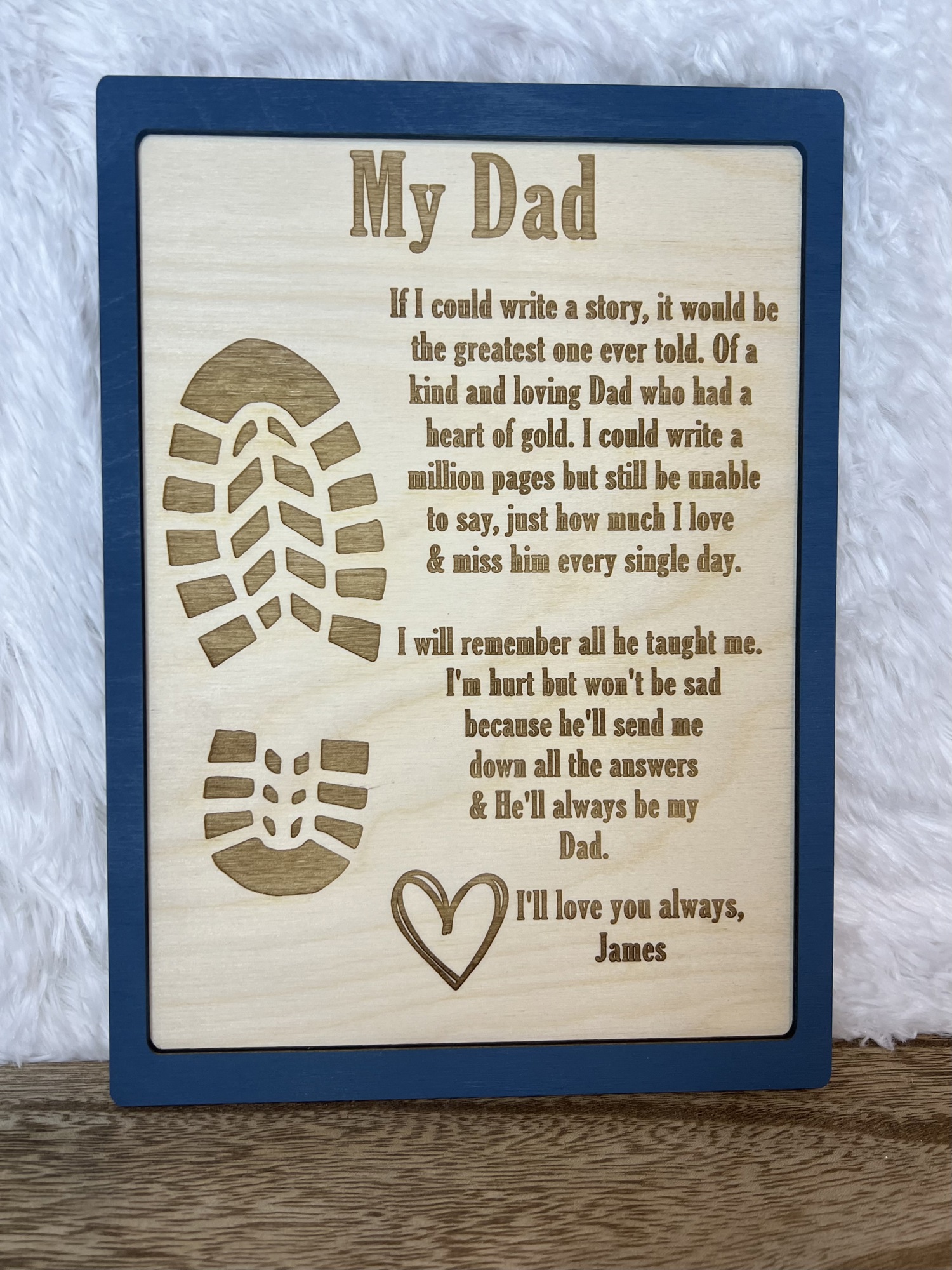 This 10x7” engraved wooden plaque features a touching poem and detailed design, making it a beautiful keepsake to display at home or give as a sympathy gift. Each piece is carefully crafted to celebrate a dad’s love, strength, and lasting presence.
