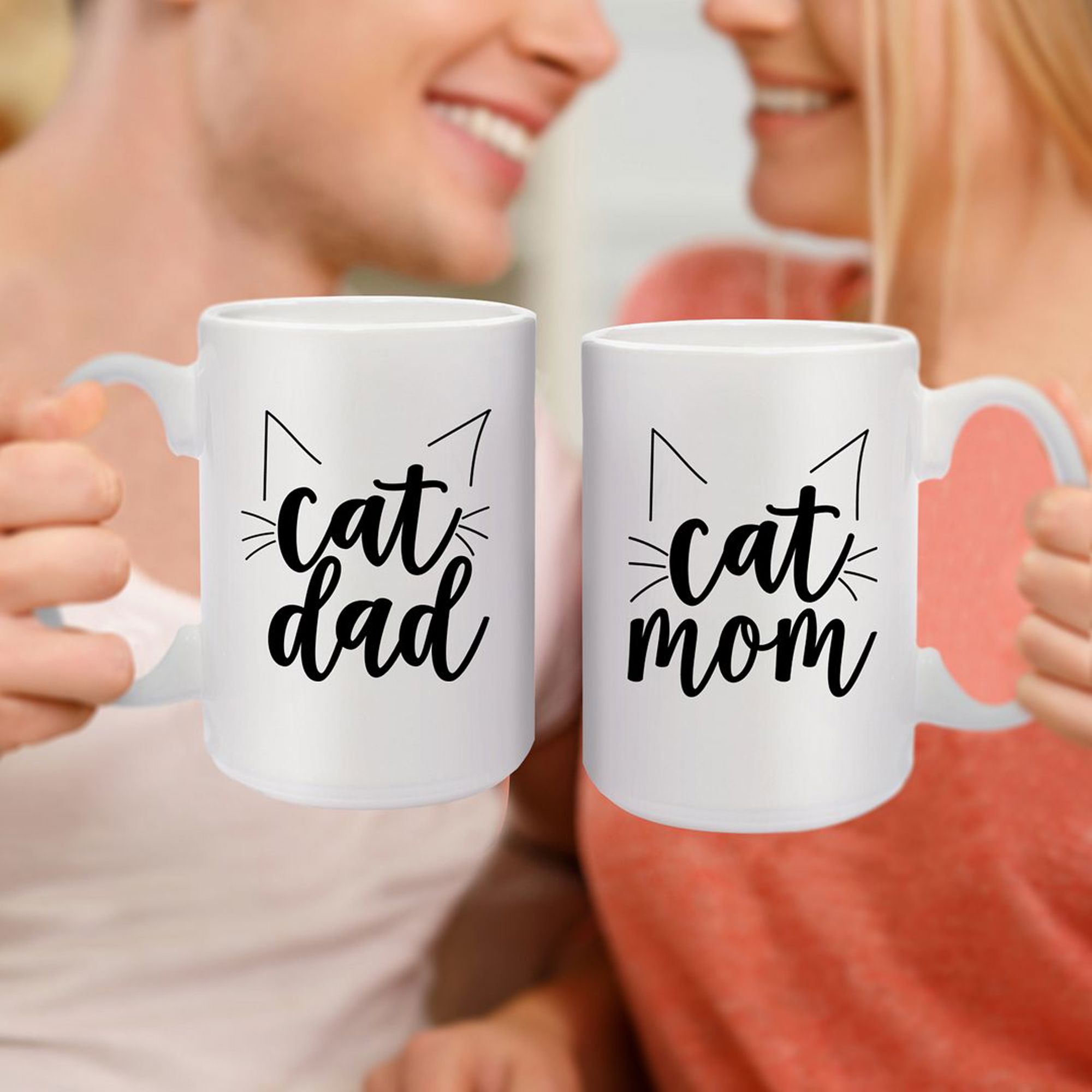 The perfect matching gift set for every cat loving couple! Includes two 15 oz jumbo white coffee mugs with the words "Cat Dad" on one mug and "Cat Mom" on the other. Imprinted on both sides for maximum exposure. A great gift for friends, family, coffee lovers, tea drinkers or any special couple! Printed on high quality ceramic.