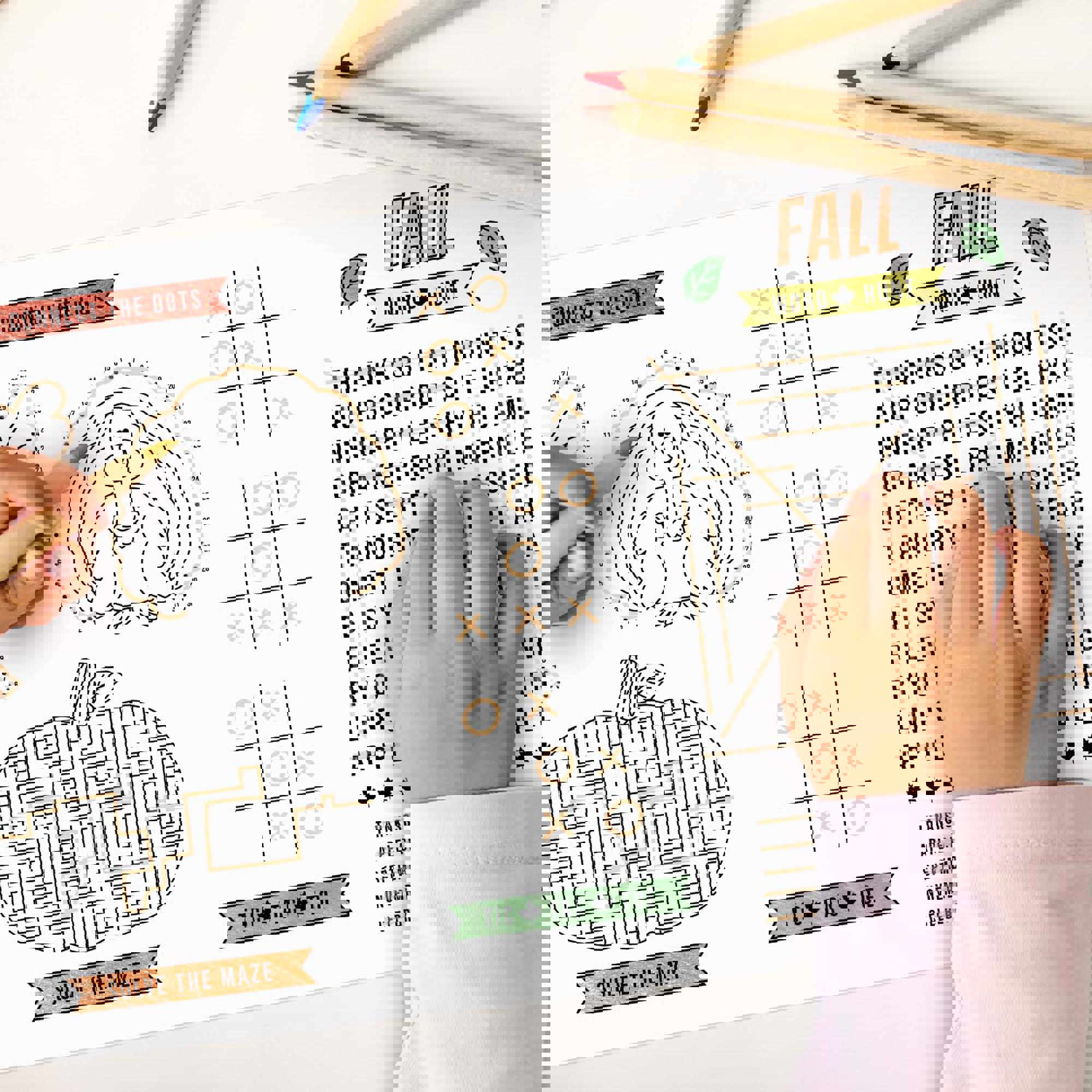 Keep your littlest guests entertained during your Thanksgiving gathering with these fall themed coloring activity paper mats! This pack includes 12 activity placemats printed on both sides. Large 11" x 17" disposable kids coloring mats printed on quality paper stock. Perfect for decorating the kids table while offering hours of fun! Enjoy connect the dots, maze, tic-tac-toe, word hunt, and coloring! Space to include the name of the little artist. Proudly made in the USA.