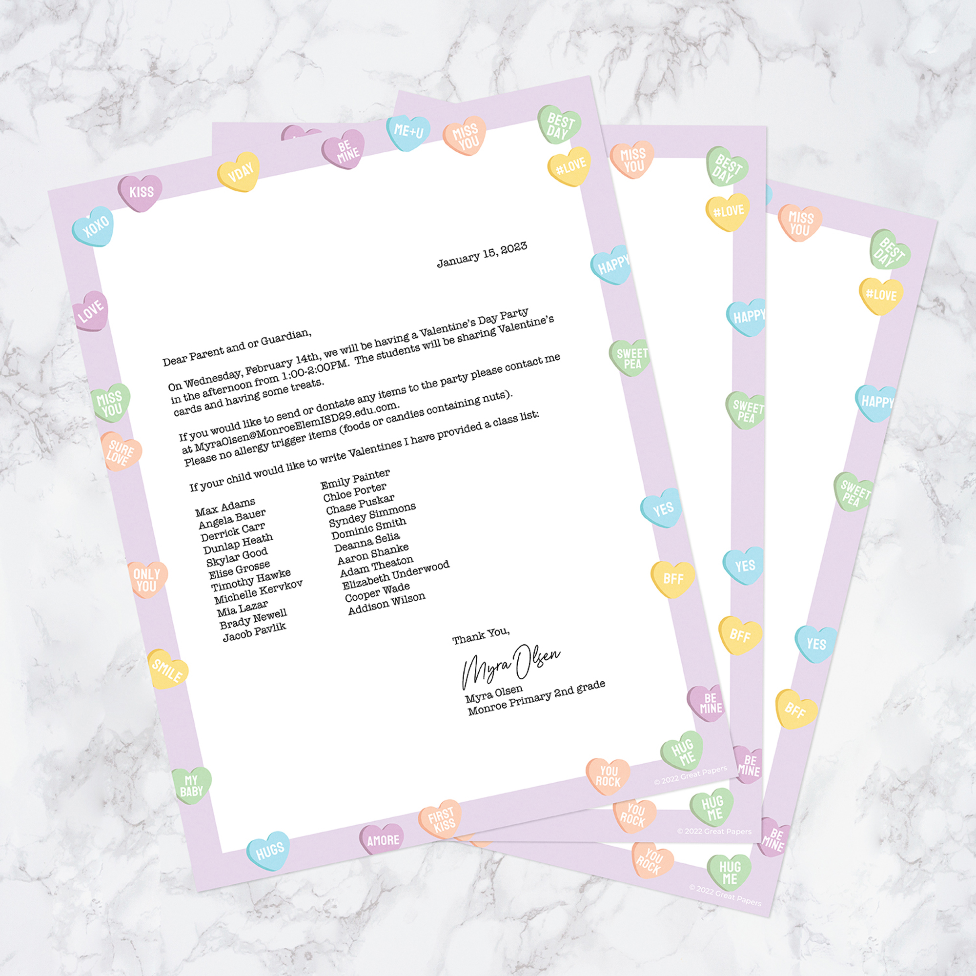 Send a thoughtful greeting to your sweetheart with this cute Valentine letterhead! Modern heart candy illustration is accompanied by a bright pastel color palette. Pack of 50 standard letter size stationery sheets is ready for your holiday message to send to family and friends. High quality paper is compatible with most home or office printers. Easy to print and send, the perfect size for standard #10 or A9 envelopes.