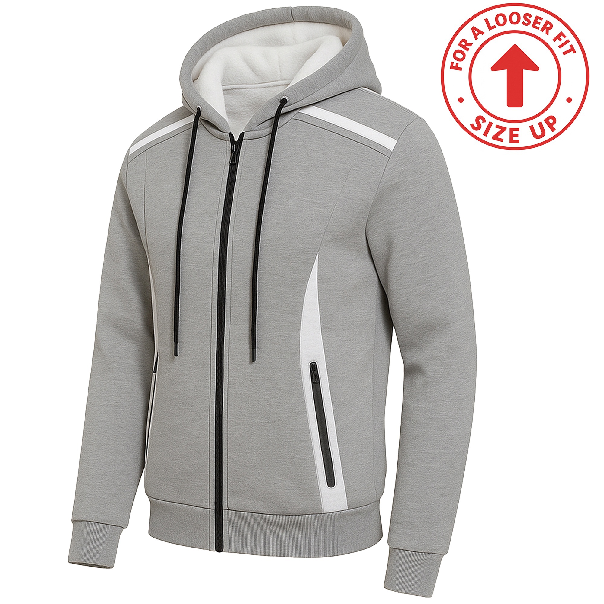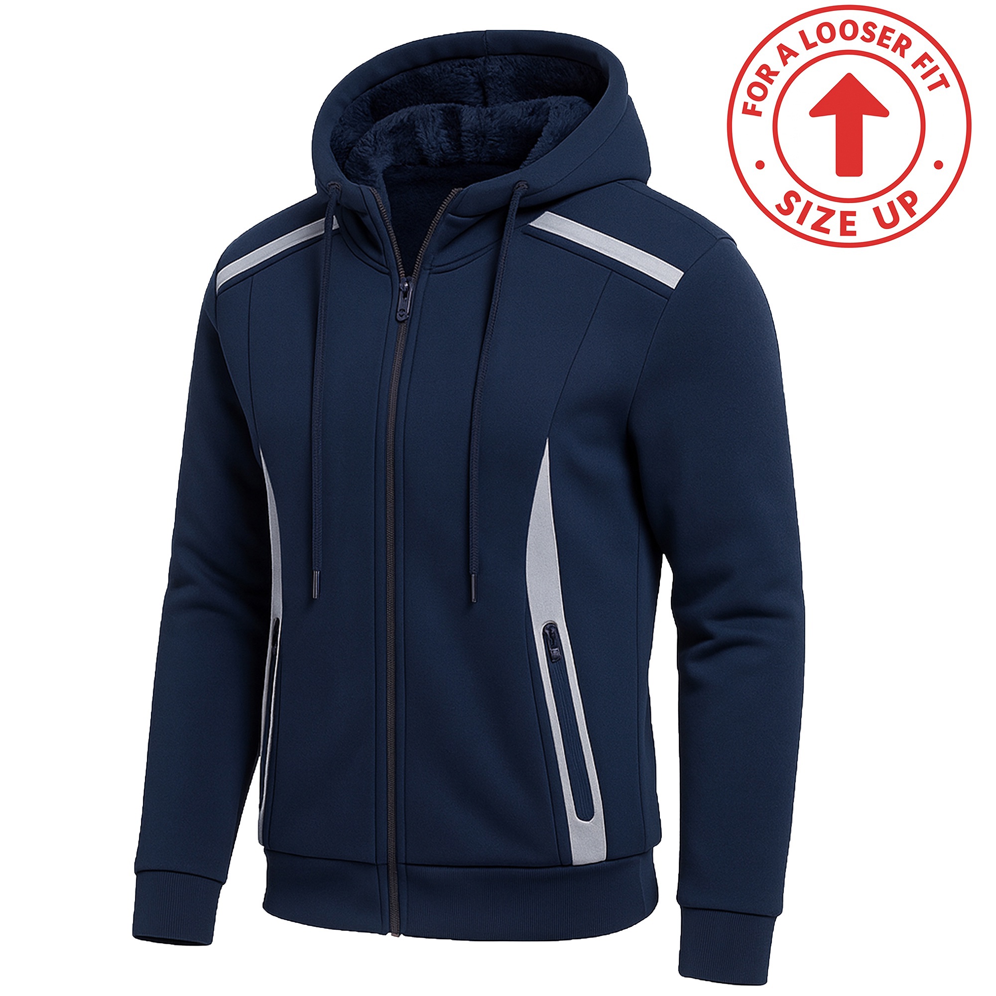 Heavyweight Sherpa Fleece-Lined Full Zip Reflective Tech Hoodie Materials: 60% Cotton, 40% Polyester Slim-Fit Design - For A Generous Fit, Buy One Size Up Reflective Tech Design Full Zipper Closure; Adjustable Drawstring For Desired Comfort; Two Side Pockets with Zipper Closure Heavyweight Sherpa Fleece-Lined For Warmth & Comfort Ribbed Elastic Sleeve Cuffs & Hem To Keep Out The Elements Care Instructions: Machine Wash Cold