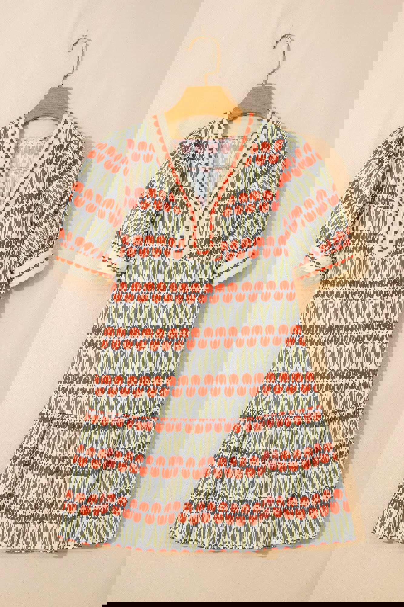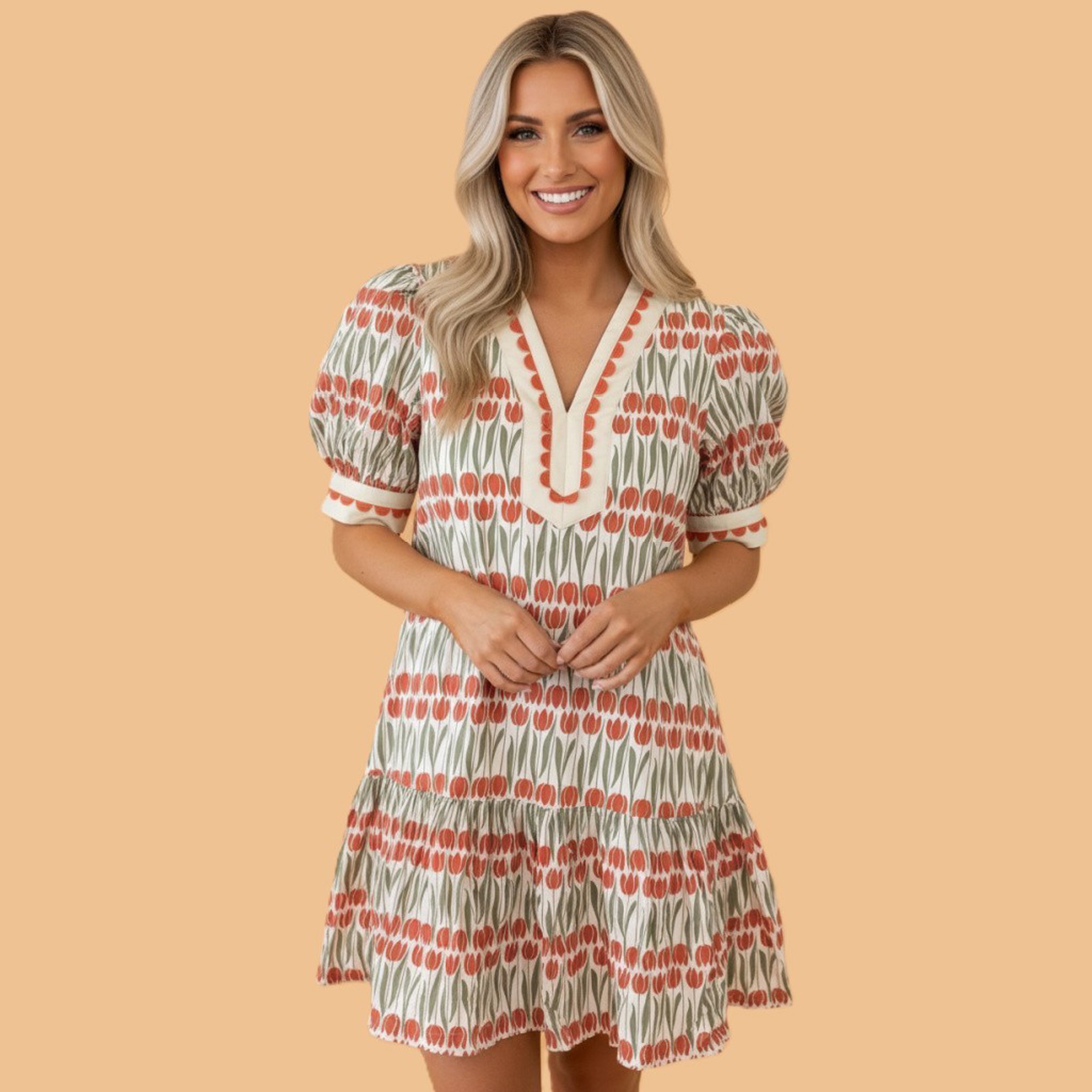 Brighten your warm-weather wardrobe with this charming mini dress featuring a vibrant tulip floral print. Crafted from soft, breathable cotton, it keeps you cool and comfortable all day long. The playful puff short sleeves add a touch of feminine flair, while the flattering mini length gives you freedom to move with effortless style. Perfect for casual outings, garden parties, or any occasion calling for a cheerful, breezy look. 100% Cotton