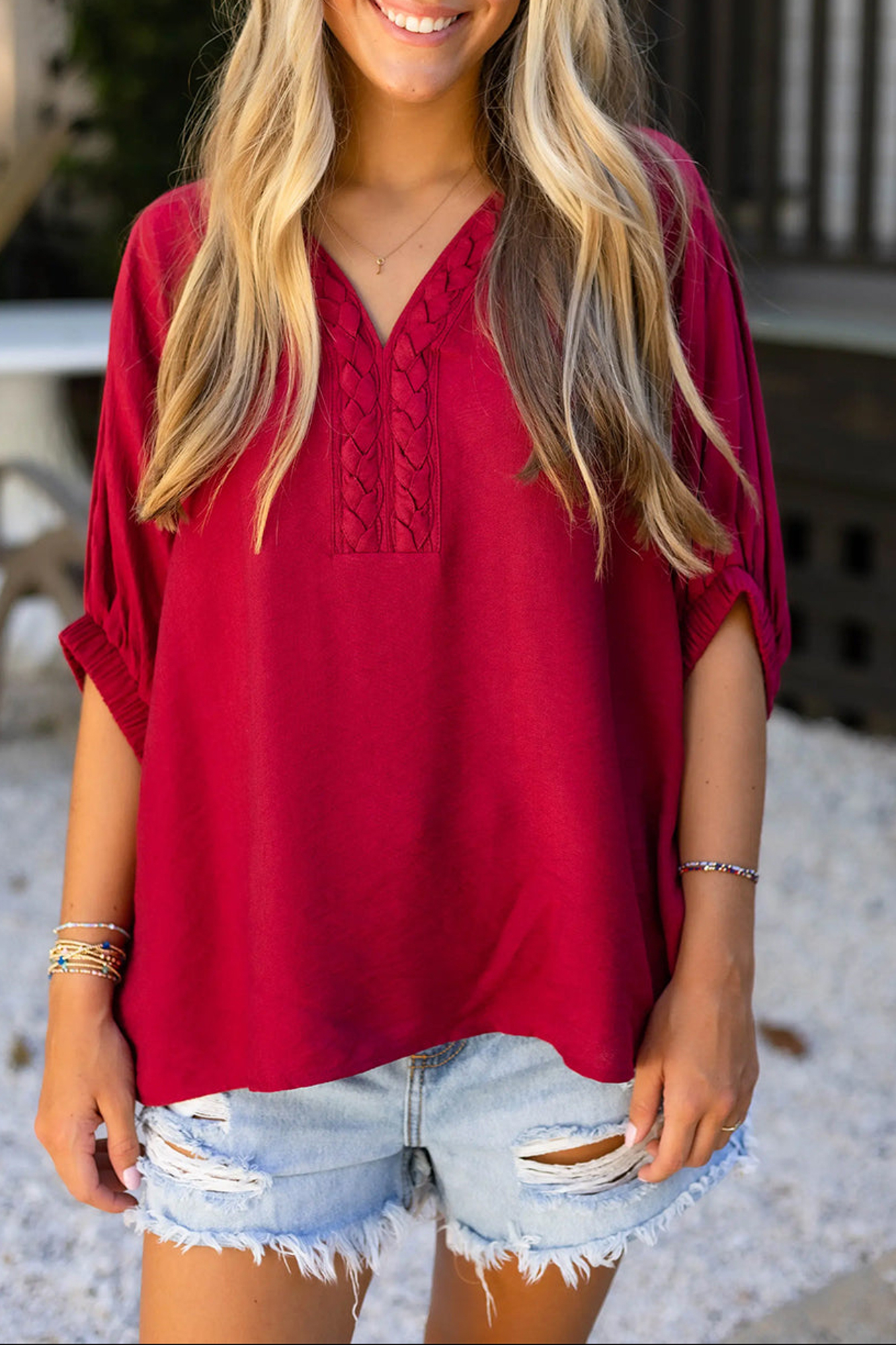 This solid blouse is your new secret weapon for looking put-together without breaking a sweat. The elegant V-neck is designed to flatter your collarbones and face beautifully, while the braided trim detail adds that artisanal touch that makes it feel special. Half sleeves keep things breezy and effortless—perfect for layering or going solo. Crafted from soft, lightweight fabric, it's the kind of piece you'll reach for again and again because it feels amazing and looks even better. Dress it up or down, this blouse is ready for whatever your day throws at you. 100% Polyester