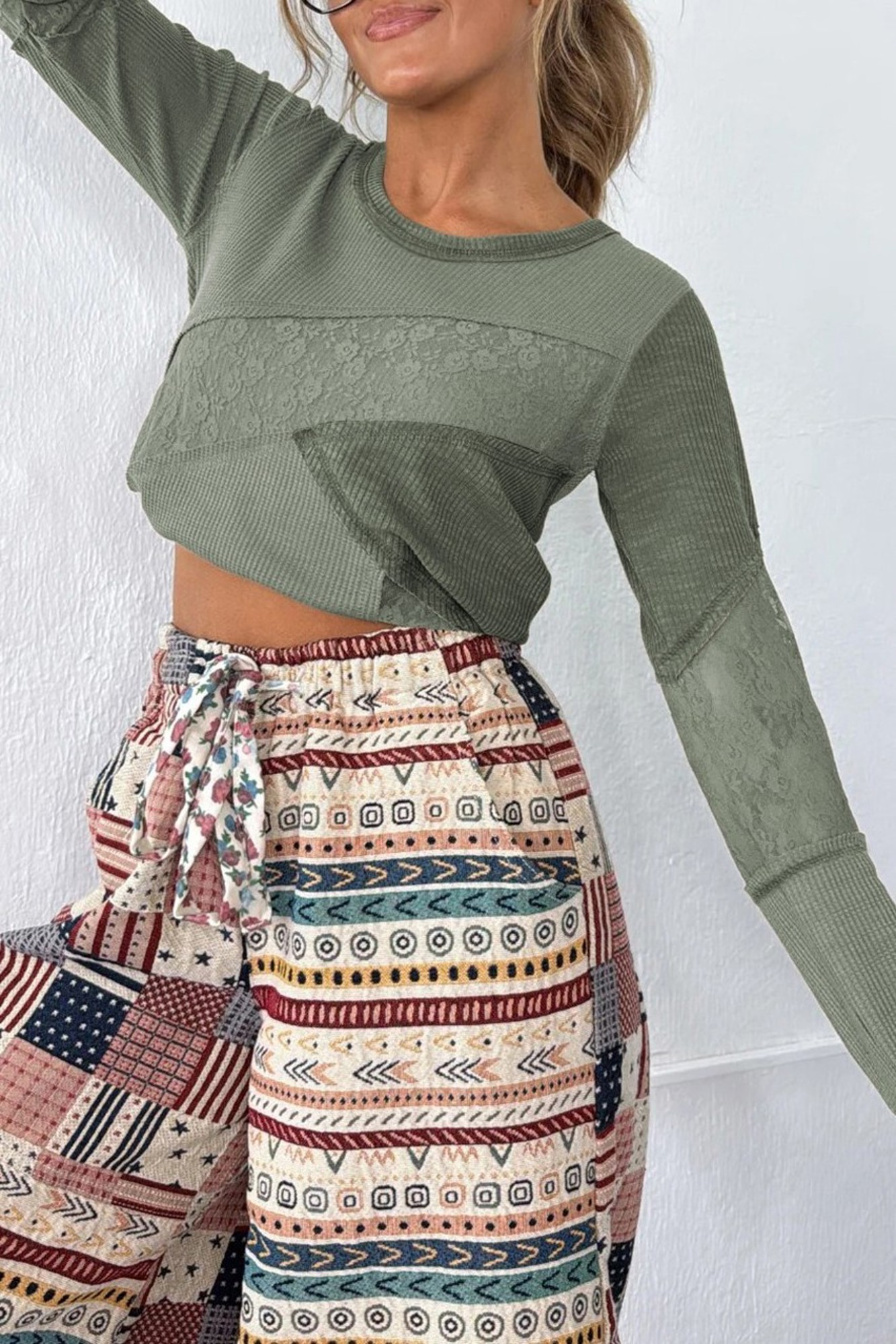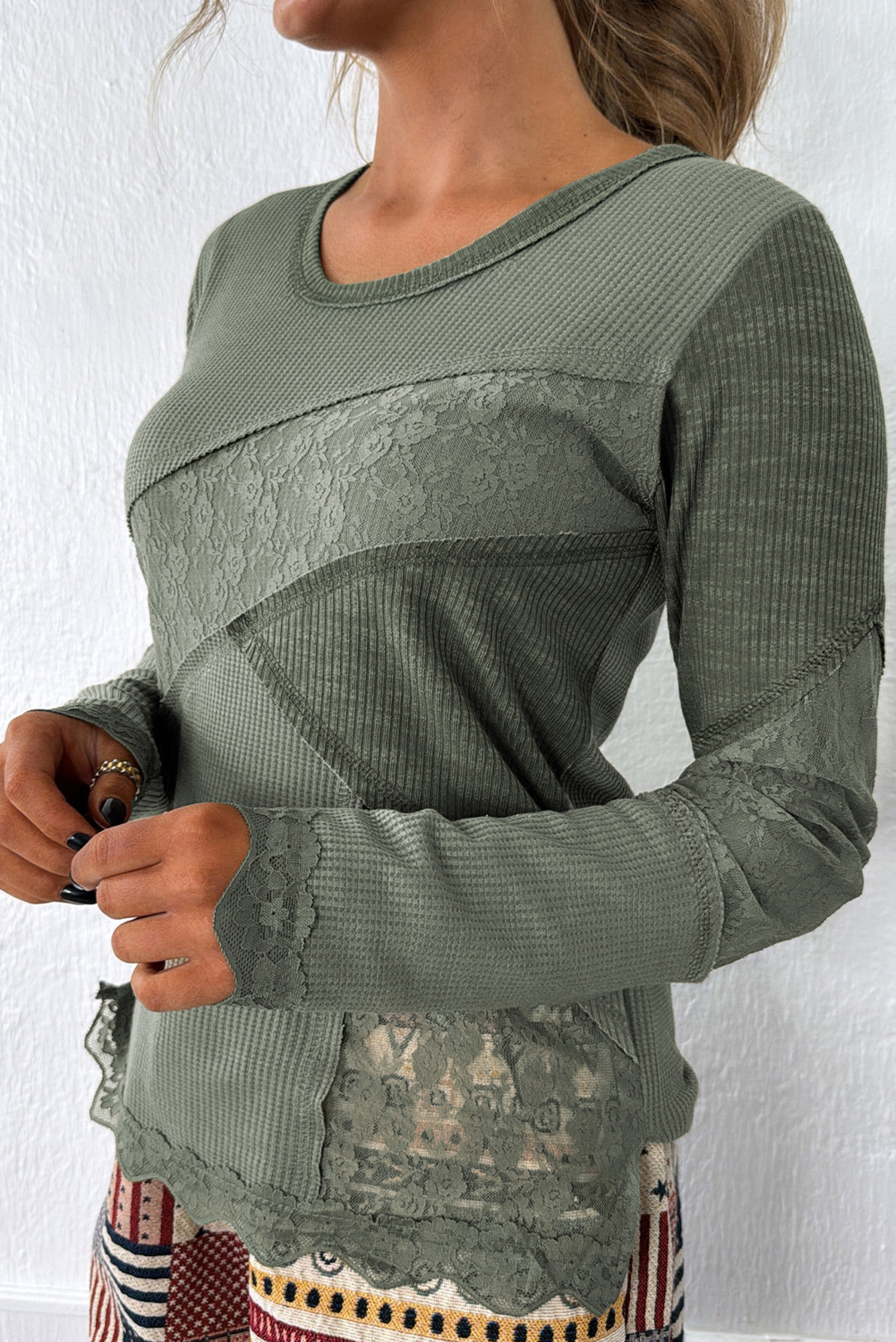 Infuse romance into your everyday style with this charming patchwork top. The understated solid color makes mixing and matching a breeze, while the textured knit fabric delivers cozy comfort and breathability. Delicate lace accents add a whimsical, feminine touch that transforms casual outfits into something special. Polyester/Cotton