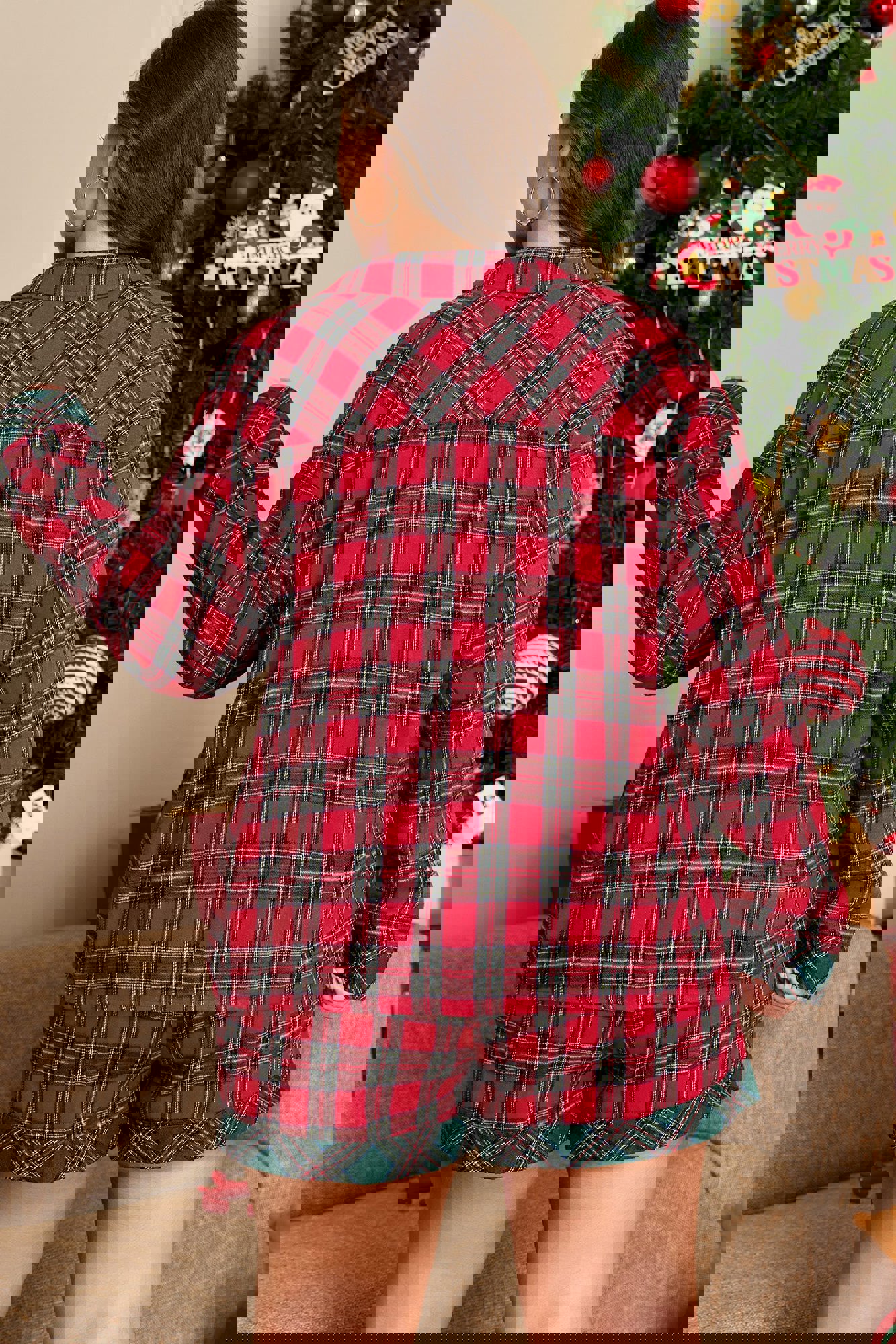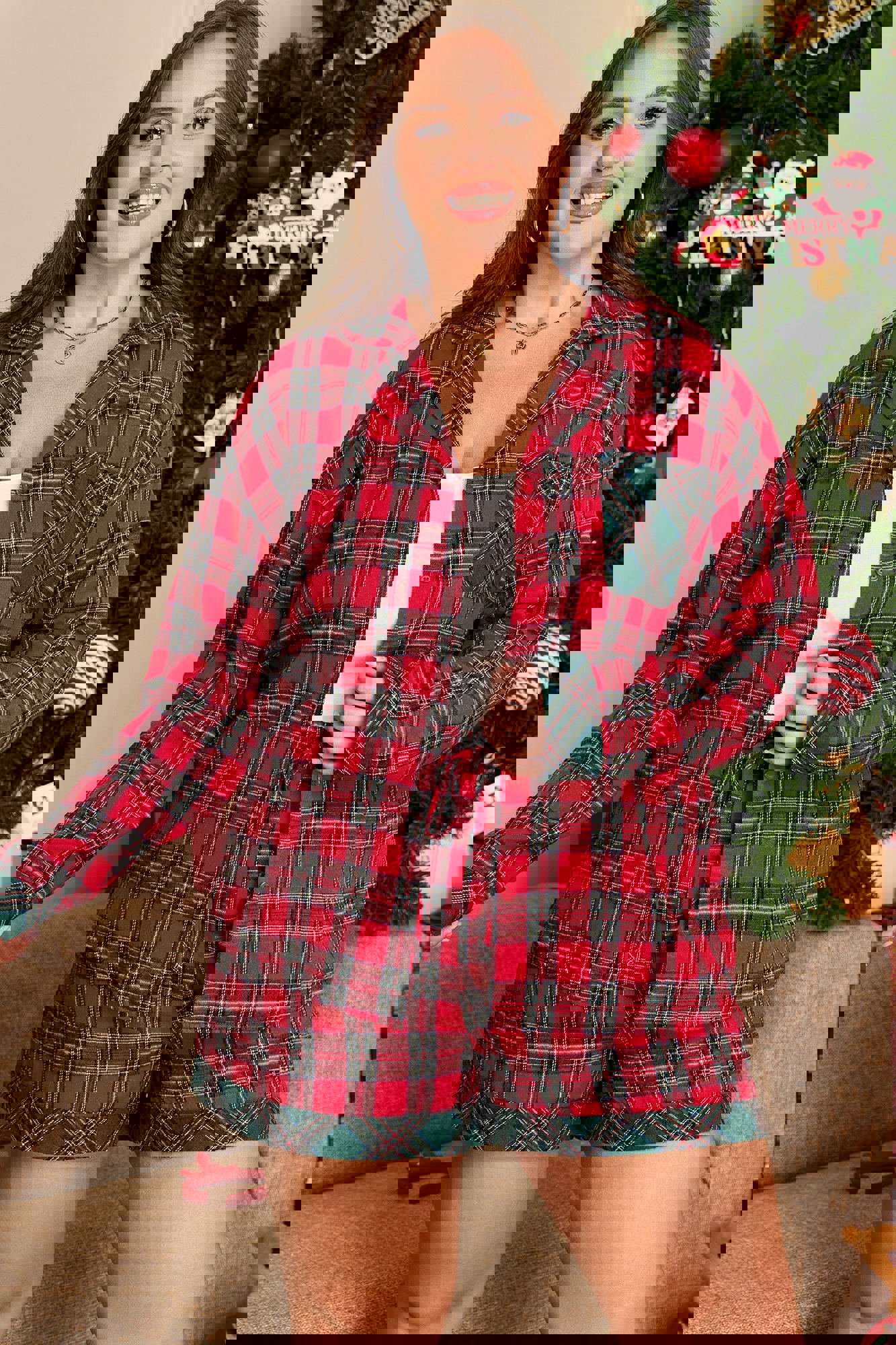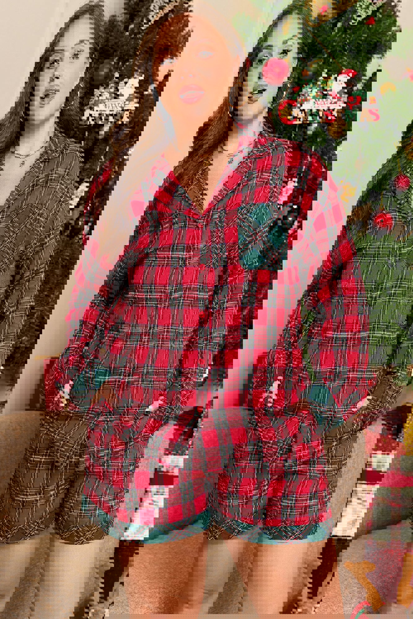 Snuggle up in style with this charming pajama set! Featuring a cozy long sleeve shirt paired with matching shorts, this two-piece ensemble delivers comfort for all-night lounging. The playful contrast patchwork design brings a fun, festive vibe perfect for holiday family matching moments. Thoughtfully cut in plus sizes, the relaxed silhouette flatters while keeping you comfortable. Whether you're winding down after a busy day or creating memories with loved ones, this set combines coziness with undeniable charm. Polyester/Cotton