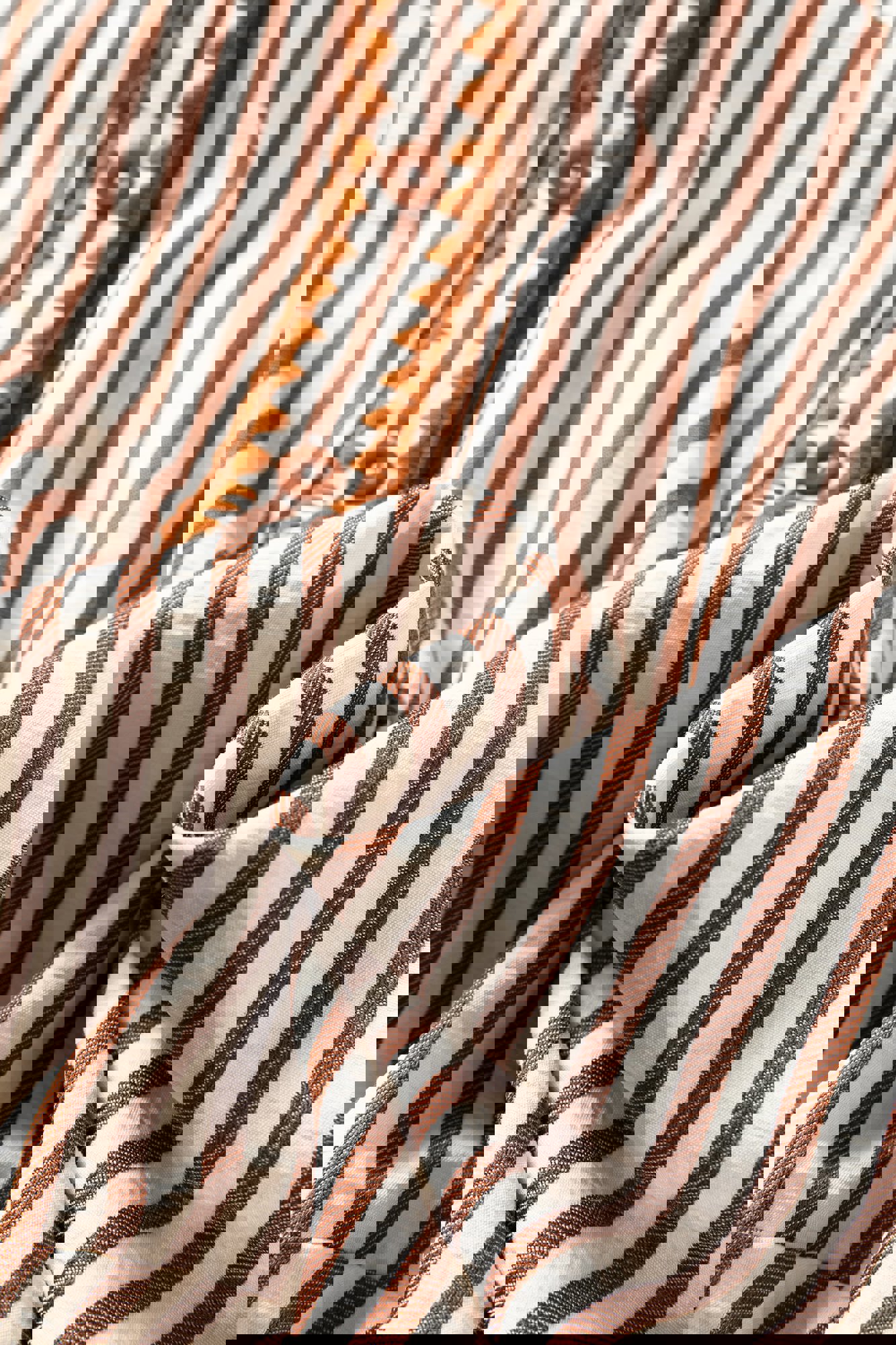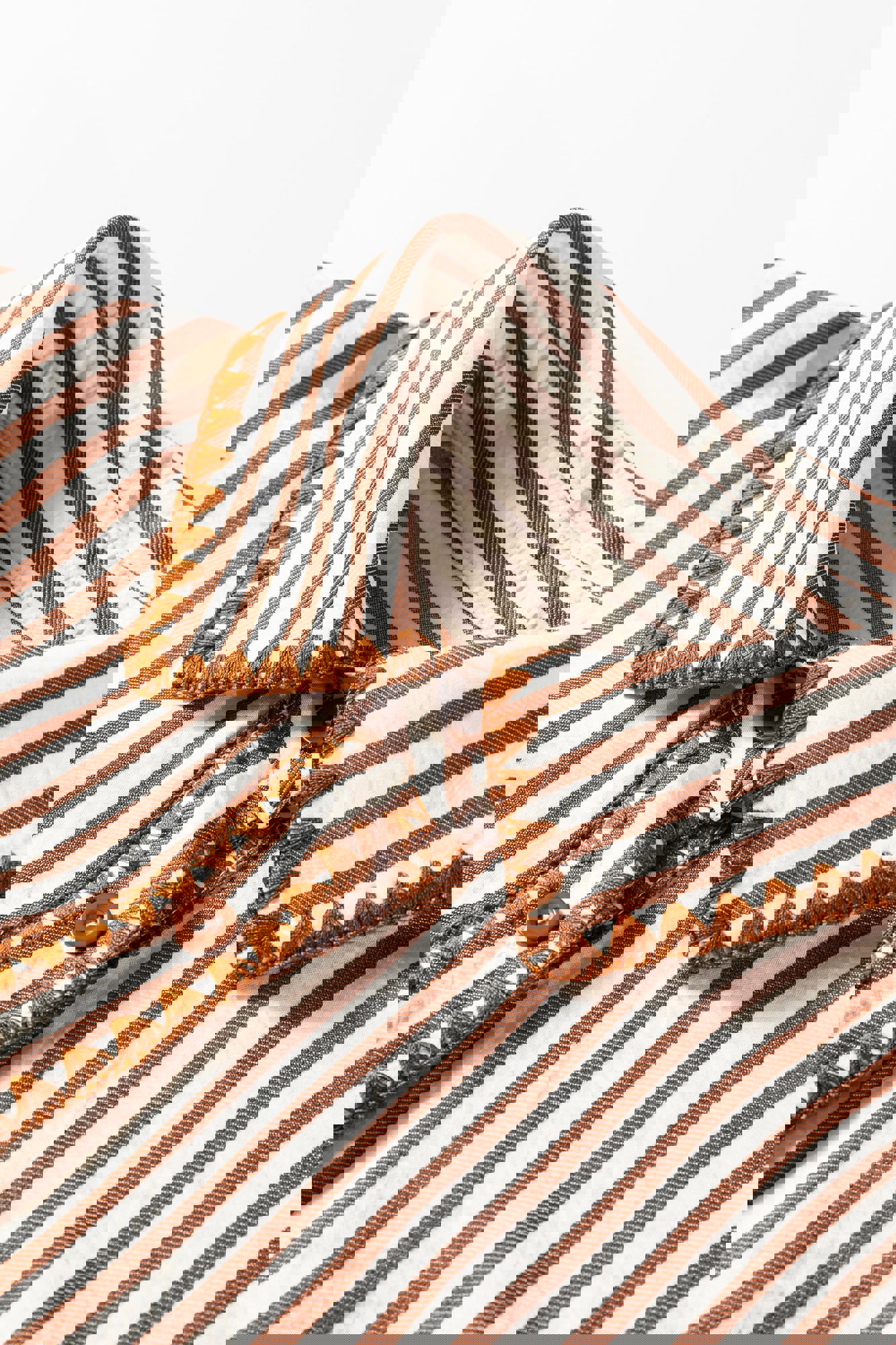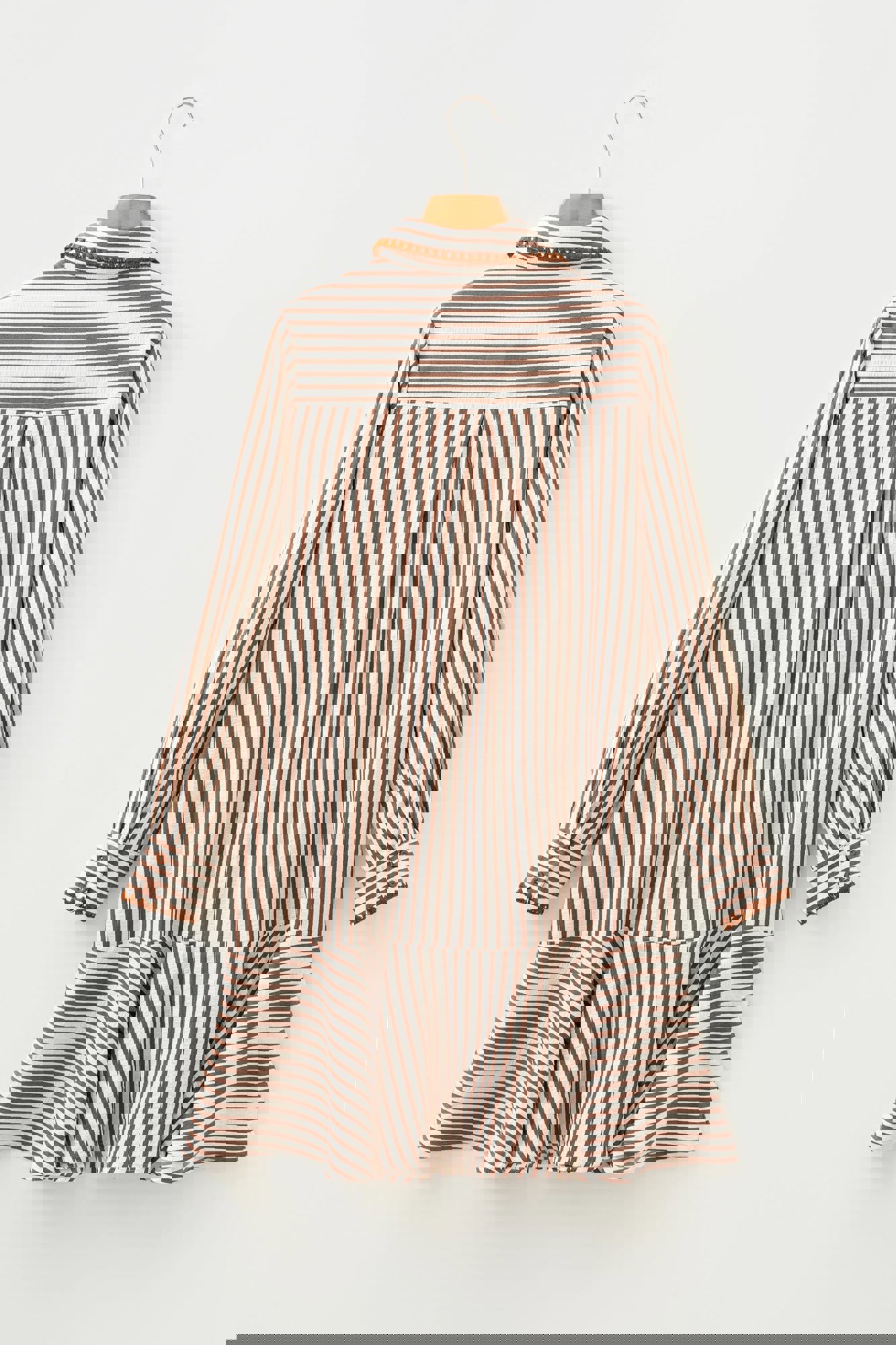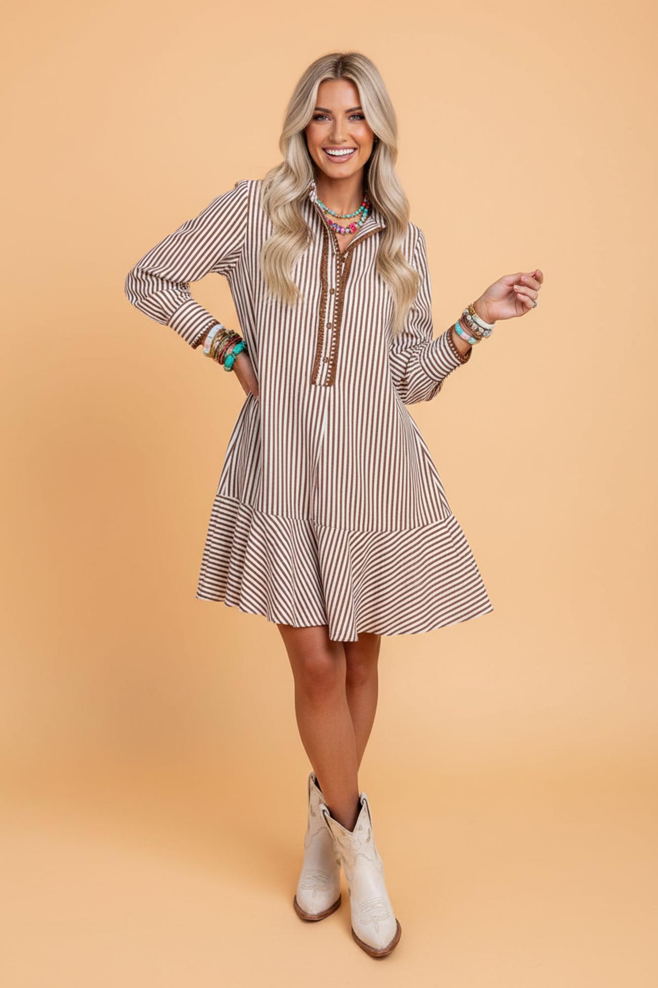 Embrace effortless sophistication with this striped mini dress, featuring a crisp shirt collar that brings timeless polish to your everyday wardrobe. Delicate embroidered trim adorns the neckline, adding an artful touch that transforms a simple silhouette into something special. The ruffled hem dances with every step, injecting just the right amount of playful charm. Long sleeves keep you covered in style, while the soft, breathable fabric ensures all-day comfort whether you're heading to brunch or running errands. Perfect for mixing classic tailoring with modern flair. Polyester/Viscose