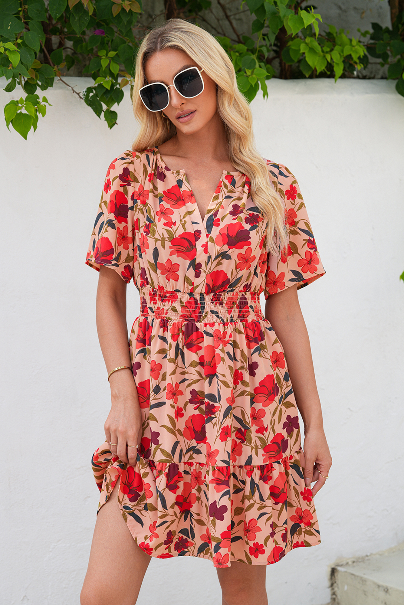 Turn heads in this fresh floral mini dress that's equal parts chic and fun. The faux wrap V-neck brings instant sophistication while the flared silhouette adds movement and playfulness. A unique waistband design keeps things interesting and keeps you looking polished. Slip on sandals for a breezy casual vibe or step into heels for an elevated evening—either way, you've got effortless elegance covered. 100% Polyester